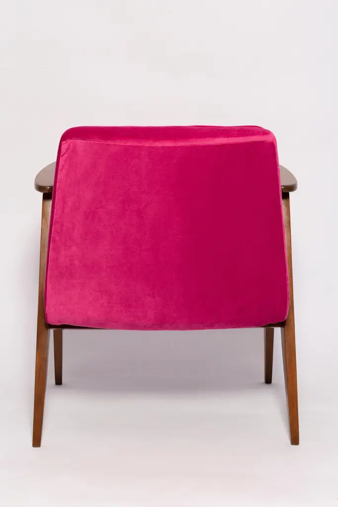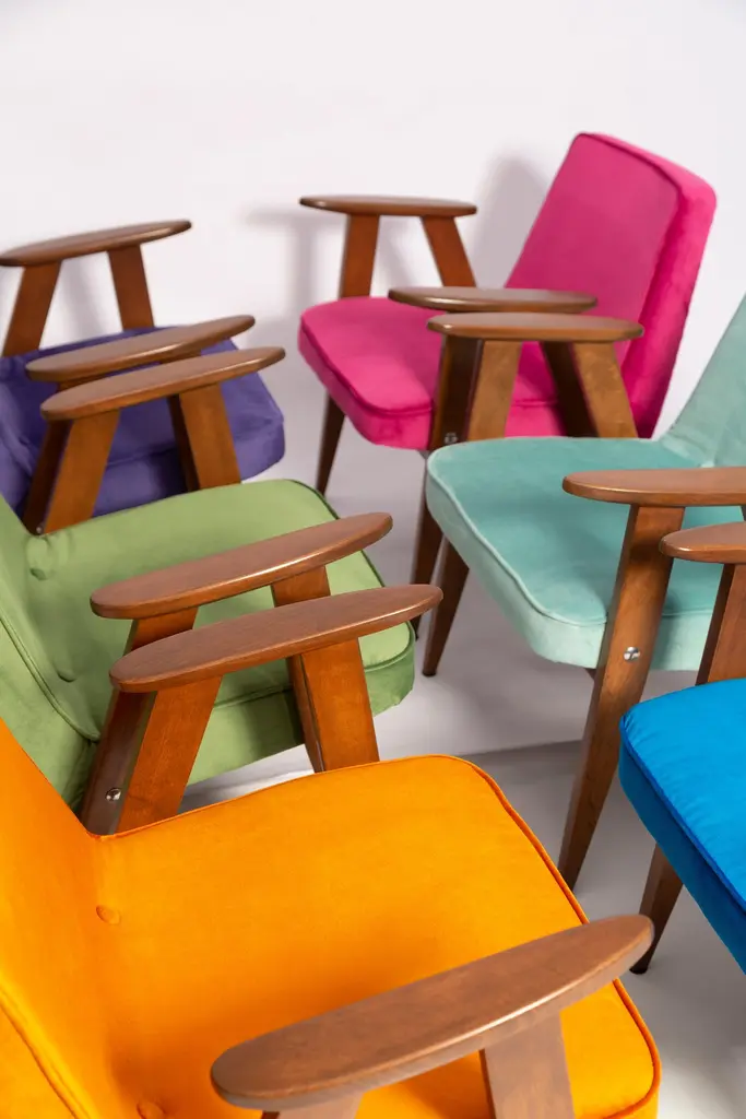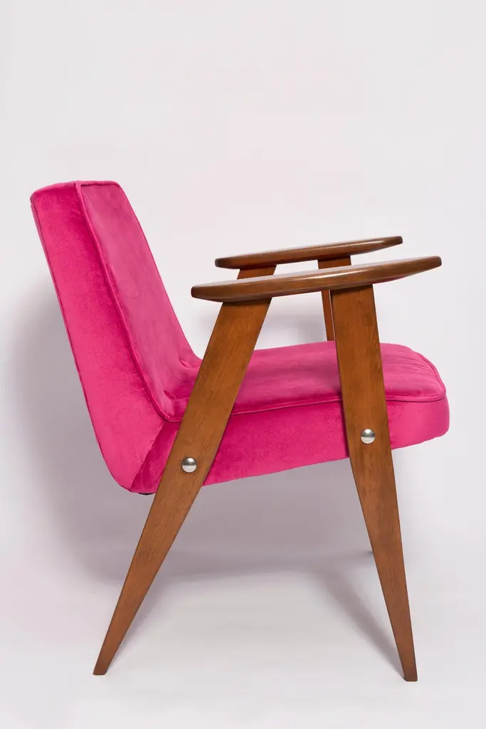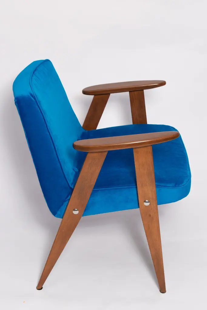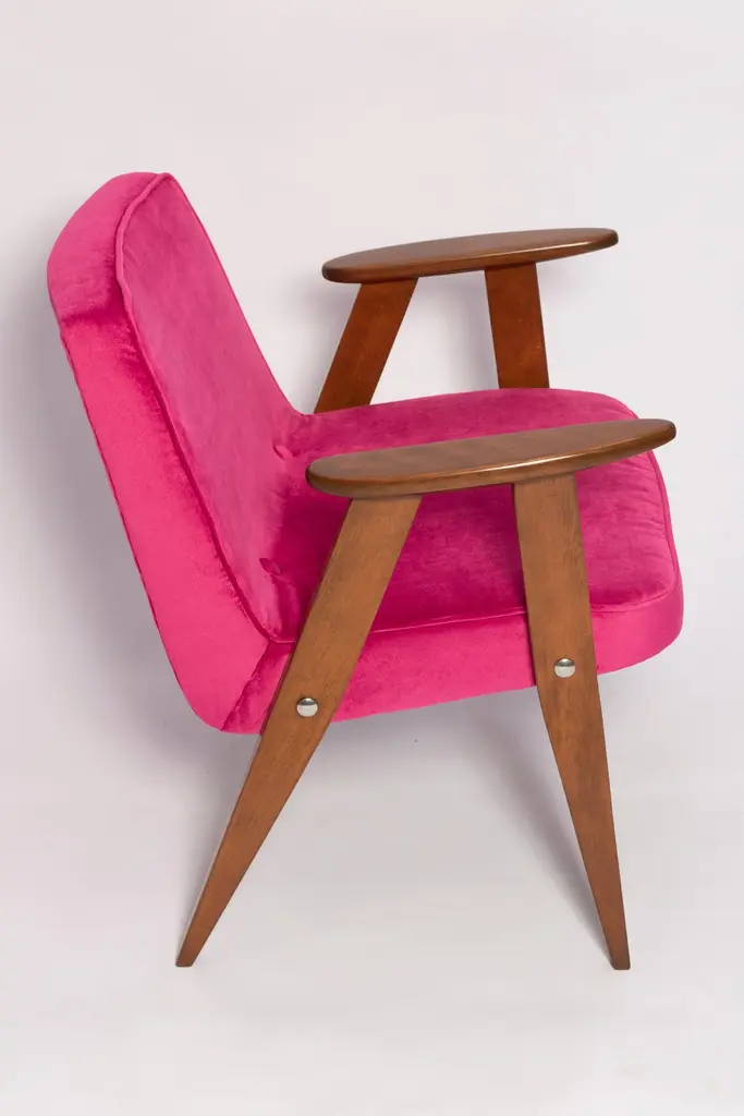 The 366 armchair is an icon of the polish design of the PRL period.The famous armchair was designed in 1962 by the Polish interior designer and furniture designer Jozef Marian Chierowski. Produced in the Lower Silesian Furniture Factory in Swiebodzice.The chair has a simple, modernist form. It consists of an upholstered seat combined with a wooden backrest. The organic shape is typical of the 1960s style.The chair is very ergonomic and comfortable, as the furniture designs of that time were largely focused on the user. Due to its small size, the furniture fits perfectly into the interiors of contemporary apartments, perfectly meeting the needs of customers.The chair is in perfect condition after a professional renovation. We can prepare this set also in another wood and fabric color. Please check color samples on the last pictures.About the fabric:This is special collection of velvet in a stunning color range of more than 100 different shades of both pure classic and non-obvious pastel broken colors. The colour palette has been created with extreme attention following the most recent trends. The unique feature of this fabric is its producing in nanotechnologies, so called WATER CLEAN, which gives it a high resistance to stains and facilitates the removal of stains from coffee, chocolate and even ink. This fabric is a perfect imitation of cotton velvet, gives the effect of softness and matte surface which works very well in heavy curtains as well as in upholstery of furniture. It is an interesting proposition for classic and stylish interiors. Works effortlessly with every design in the collection.Here set of Two armchairs is available.