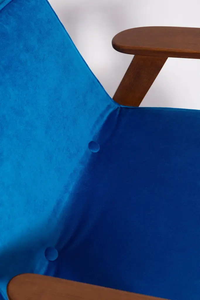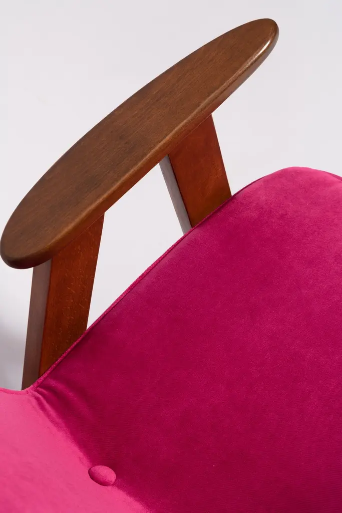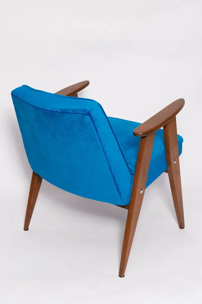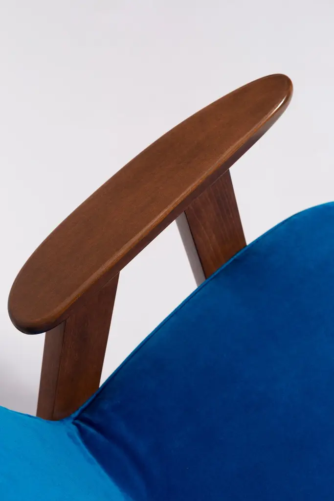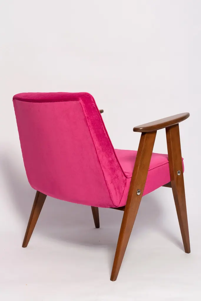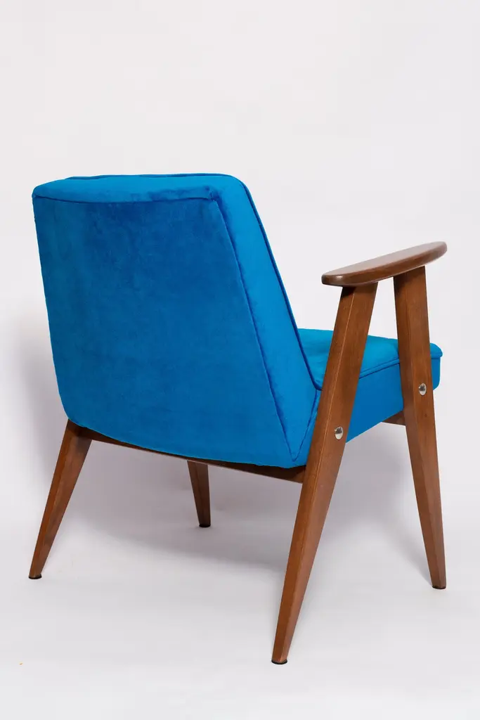 The 366 armchair is an icon of the polish design of the PRL period.The famous armchair was designed in 1962 by the Polish interior designer and furniture designer Jozef Marian Chierowski. Produced in the Lower Silesian Furniture Factory in Swiebodzice.The chair has a simple, modernist form. It consists of an upholstered seat combined with a wooden backrest. The organic shape is typical of the 1960s style.The chair is very ergonomic and comfortable, as the furniture designs of that time were largely focused on the user. Due to its small size, the furniture fits perfectly into the interiors of contemporary apartments, perfectly meeting the needs of customers.The chair is in perfect condition after a professional renovation. We can prepare this set also in another wood and fabric color. Please check color samples on the last pictures.About the fabric:This is special collection of velvet in a stunning color range of more than 100 different shades of both pure classic and non-obvious pastel broken colors. The colour palette has been created with extreme attention following the most recent trends. The unique feature of this fabric is its producing in nanotechnologies, so called WATER CLEAN, which gives it a high resistance to stains and facilitates the removal of stains from coffee, chocolate and even ink. This fabric is a perfect imitation of cotton velvet, gives the effect of softness and matte surface which works very well in heavy curtains as well as in upholstery of furniture. It is an interesting proposition for classic and stylish interiors. Works effortlessly with every design in the collection.Here set of Two armchairs is available.