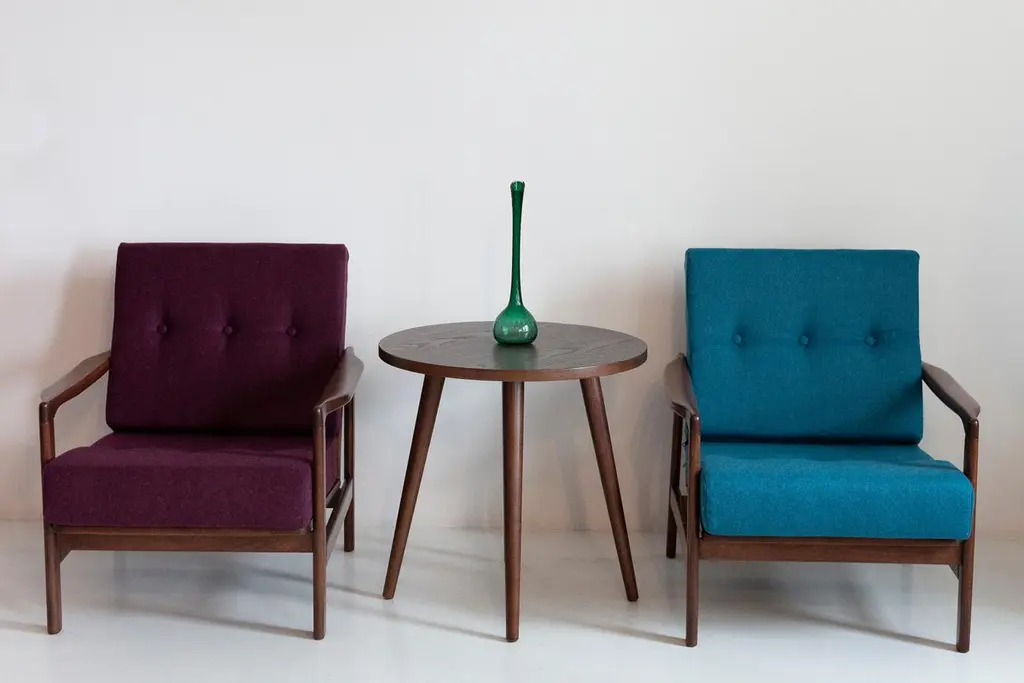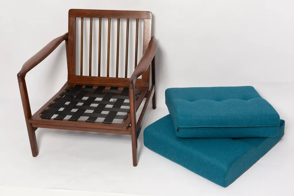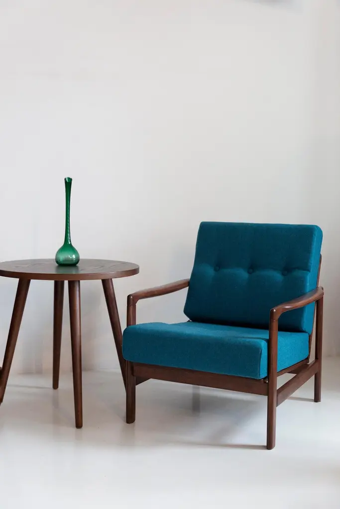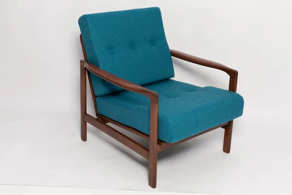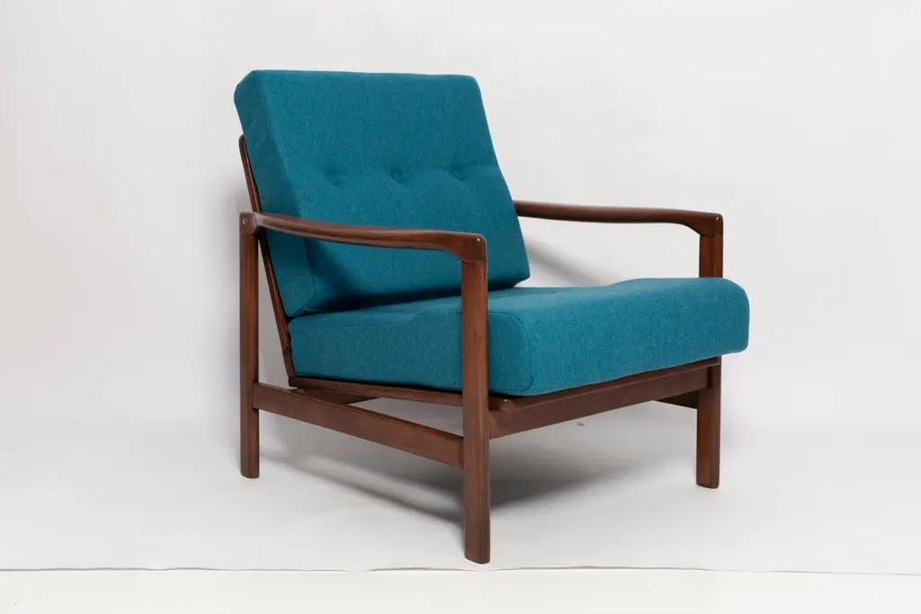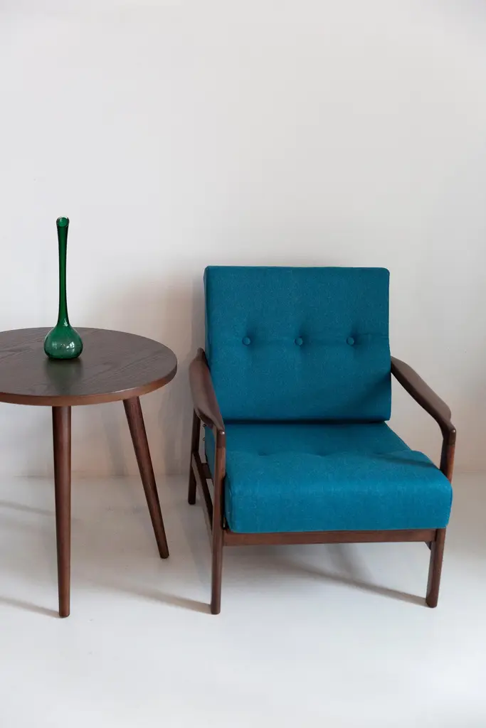 The B-7522 armchairs was designed in the 1960s by Zenon Baczyk, it was produced by Swarzedz furniture factories in Poland. This is original vintage armchair after renovation, they are not new! Furniture kept in perfect condition, after full upholstery and wood renovation.Stabile and very comfortable armchair, dressed in high-quality wool. We can prepare this armchair also in another fabric and wood color. Please check the last pictures and ask for more informations.Here set of Two is available.