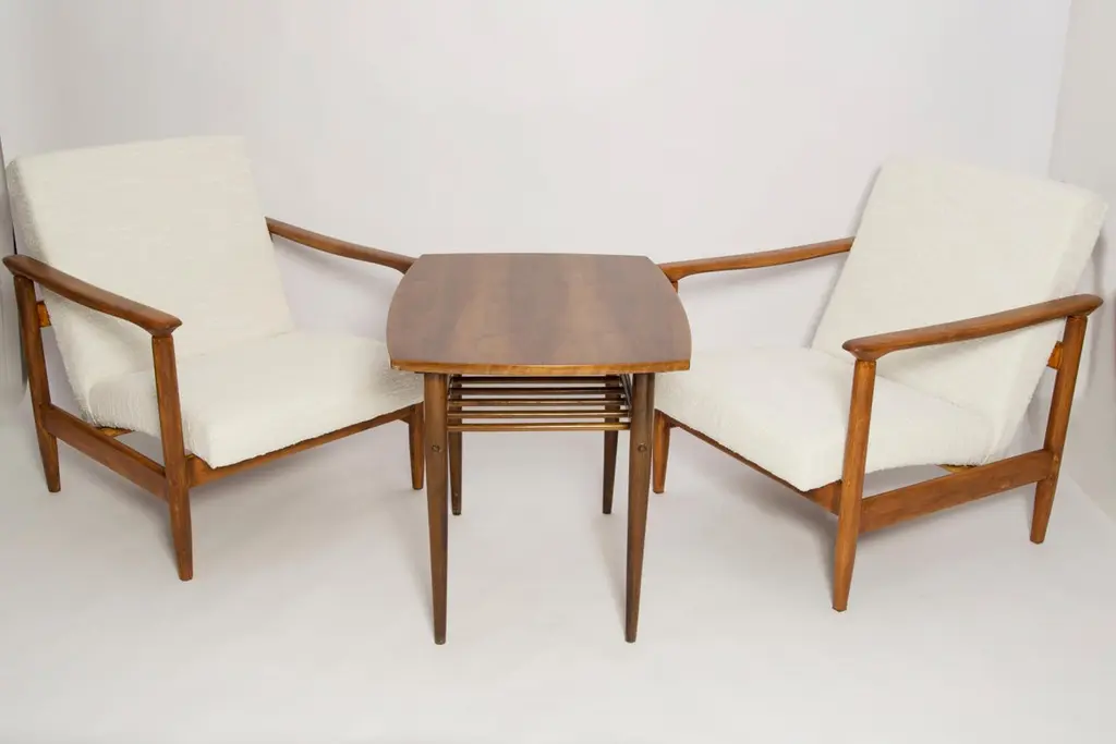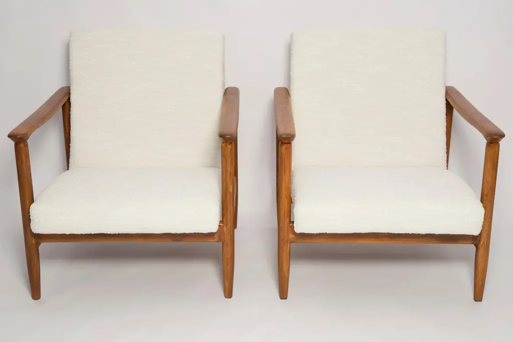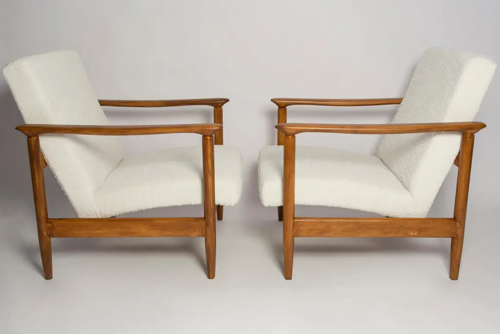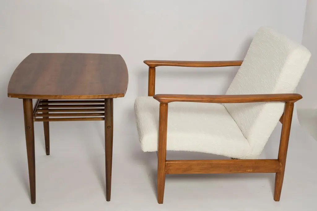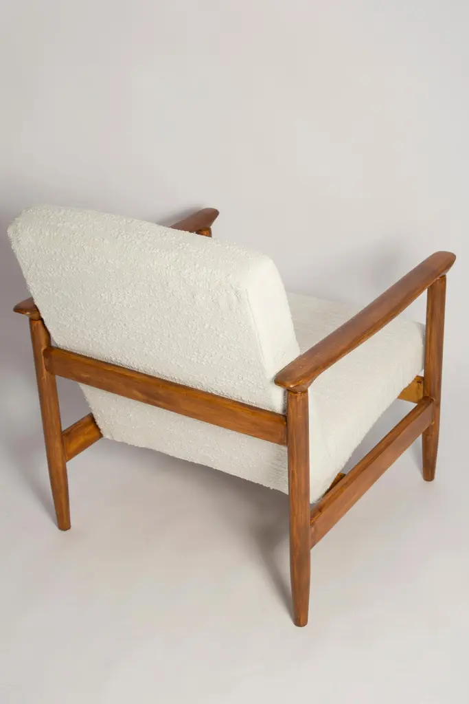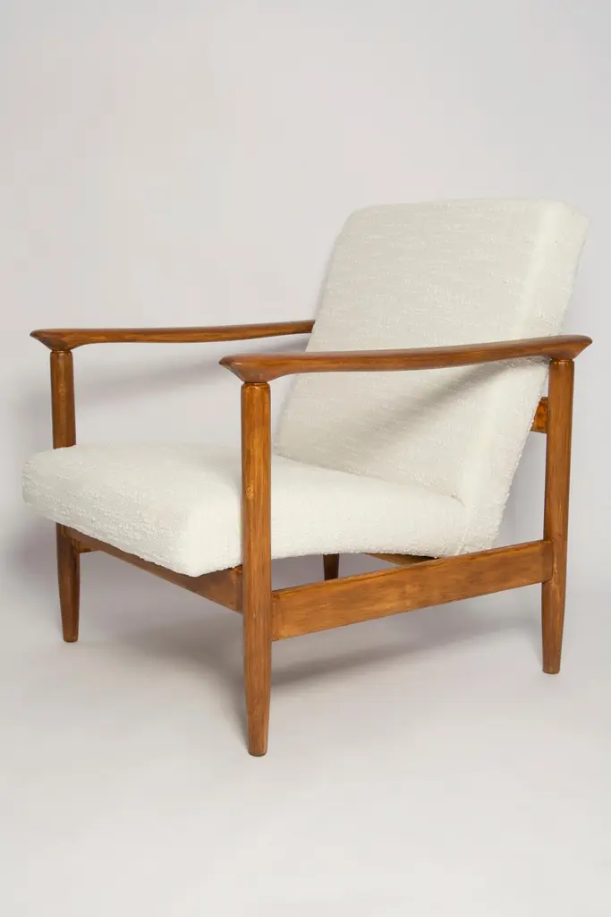 Beautiful white boucle Armchair GFM-142, designed by Edmund Homa, a polish architect, designer of Industrial Design and interior architecture, professor at the Academy of Fine Arts in Gdansk. The armchair was made in the 1960s in the Gosciecinska furniture factory from solid beech wood. The GFM-142 armchair is regarded one of the best polish armchair design from the previous age.The armchair has been thoroughly renovated. The tension belts have been changed, new upholstery foams, boucle upholstery it's Italian boucle of the highest quality. A boucle fabric whose uniqueness is added by its particularly pronounced weave. The fabric is made of recycled polyester. It is characterised by high resistance to light. The fabric is composed of yarns of one colour but of different thicknesses. Isla perfectly combines with smooth structures, we can easily match it with multicoloured weaves. The fabric fits Scandinavian and rustic style, combined with chrome or black accessories it becomes elegant and balanced. A wide range of colours corresponds to this year's trends, it also includes many timeless colours.Easy cleaning will guarantee us comfort of use, clean and attractive furniture for years. The Oeko-Tex certificate assures us that the fabric is allergen-free and completely safe for human life and health. This chair can be customized to your specifications or COM. Wood, stain, finish, fabric and custom dimensions options are available. Check the last pictures with boucle and wood color samples. Extremely comfortable model! We can prepare this armchair also in a set with foot stool. You can choose other wood and boucle color. About the coffee table: Coffee table from the 1960s. It was manufactured in Poland in 1960s. The table was made of wood and veneer plywood, it was refreshed. Original vintage condition. Dimensions: Depth: 55cm Width: 75cm Height: 58cmHere set of two armchairs and coffee table is available.