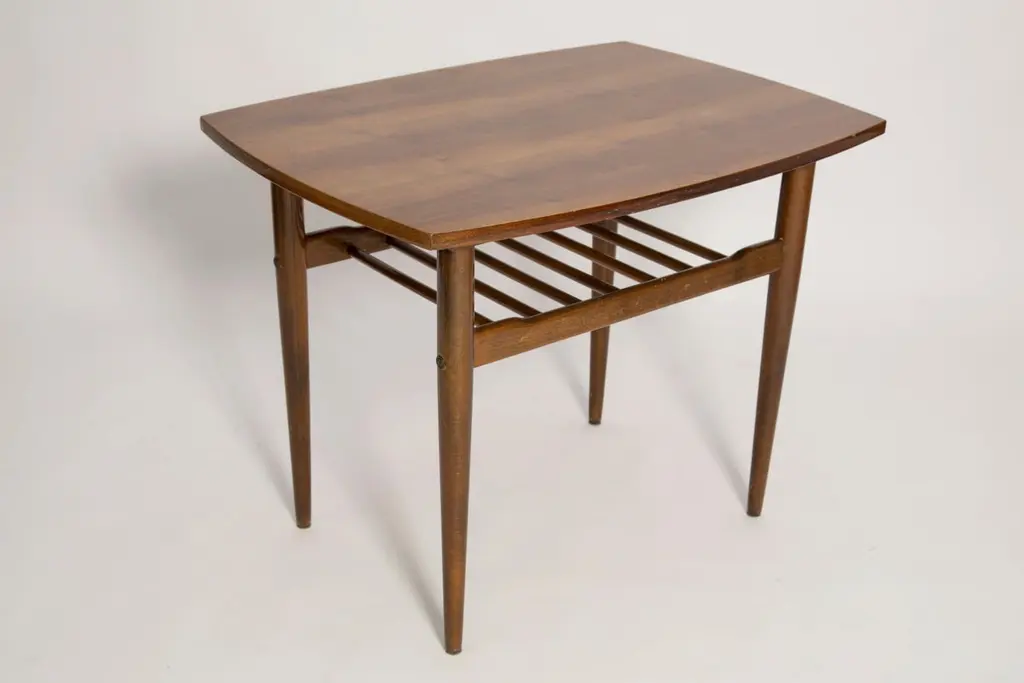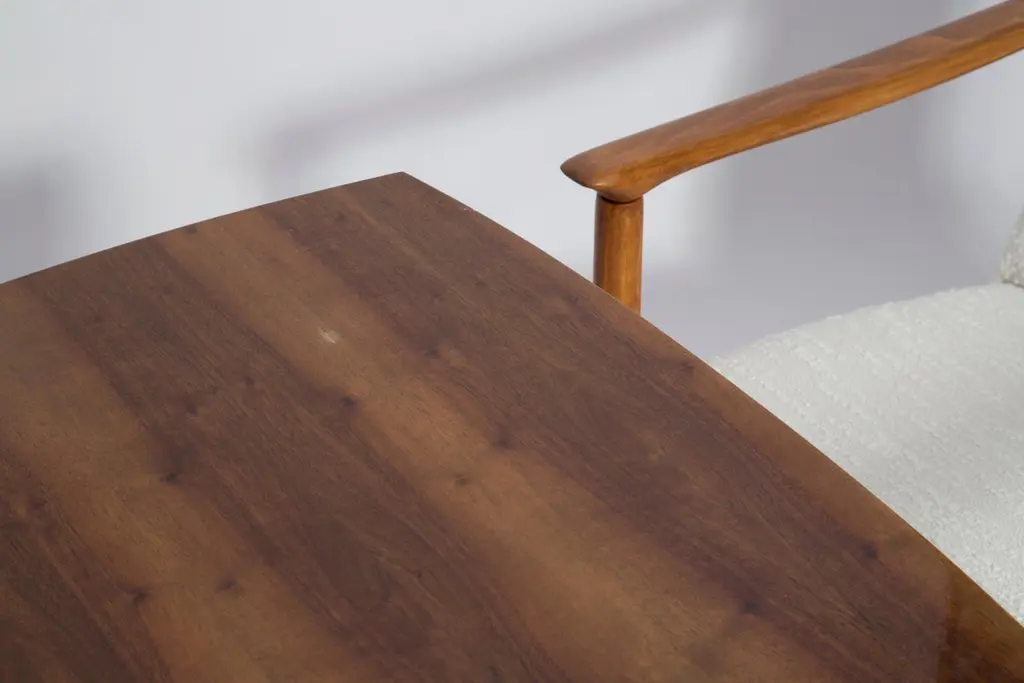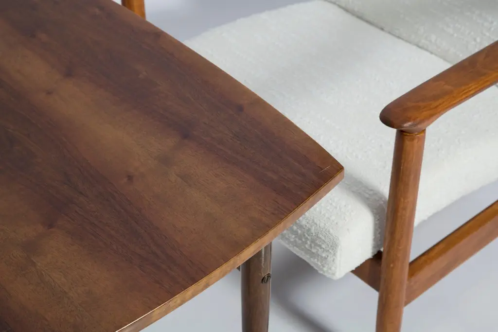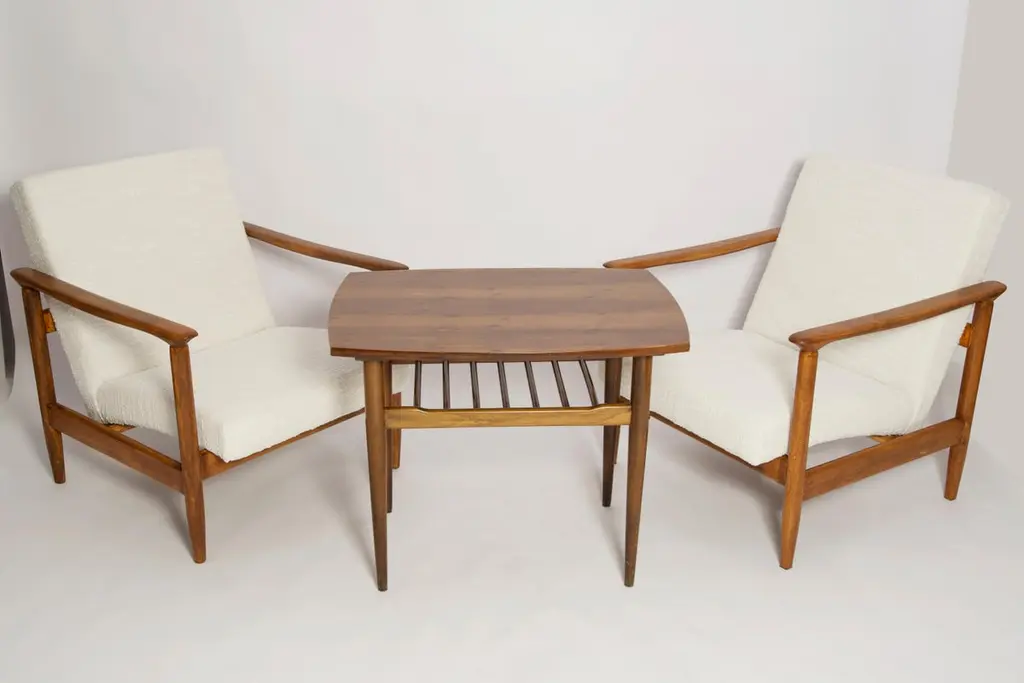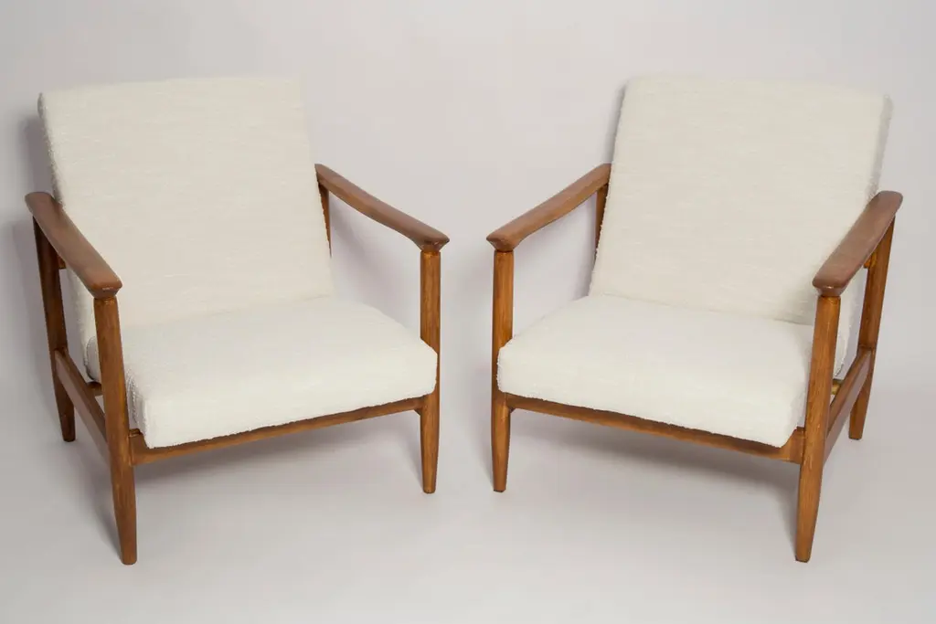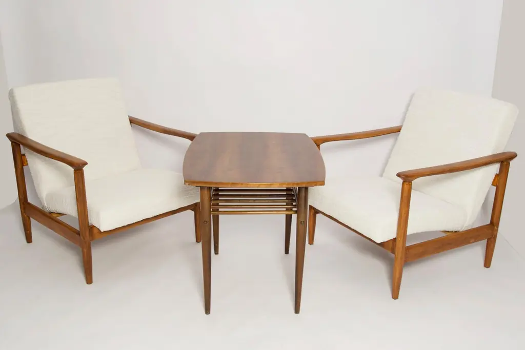 Beautiful white boucle Armchair GFM-142, designed by Edmund Homa, a polish architect, designer of Industrial Design and interior architecture, professor at the Academy of Fine Arts in Gdansk. The armchair was made in the 1960s in the Gosciecinska furniture factory from solid beech wood. The GFM-142 armchair is regarded one of the best polish armchair design from the previous age.The armchair has been thoroughly renovated. The tension belts have been changed, new upholstery foams, boucle upholstery it's Italian boucle of the highest quality. A boucle fabric whose uniqueness is added by its particularly pronounced weave. The fabric is made of recycled polyester. It is characterised by high resistance to light. The fabric is composed of yarns of one colour but of different thicknesses. Isla perfectly combines with smooth structures, we can easily match it with multicoloured weaves. The fabric fits Scandinavian and rustic style, combined with chrome or black accessories it becomes elegant and balanced. A wide range of colours corresponds to this year's trends, it also includes many timeless colours.Easy cleaning will guarantee us comfort of use, clean and attractive furniture for years. The Oeko-Tex certificate assures us that the fabric is allergen-free and completely safe for human life and health. This chair can be customized to your specifications or COM. Wood, stain, finish, fabric and custom dimensions options are available. Check the last pictures with boucle and wood color samples. Extremely comfortable model! We can prepare this armchair also in a set with foot stool. You can choose other wood and boucle color. About the coffee table: Coffee table from the 1960s. It was manufactured in Poland in 1960s. The table was made of wood and veneer plywood, it was refreshed. Original vintage condition. Dimensions: Depth: 55cm Width: 75cm Height: 58cmHere set of two armchairs and coffee table is available.