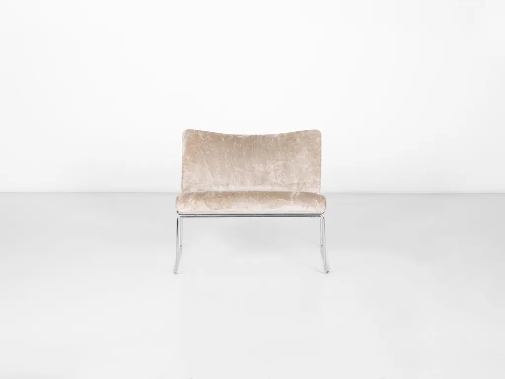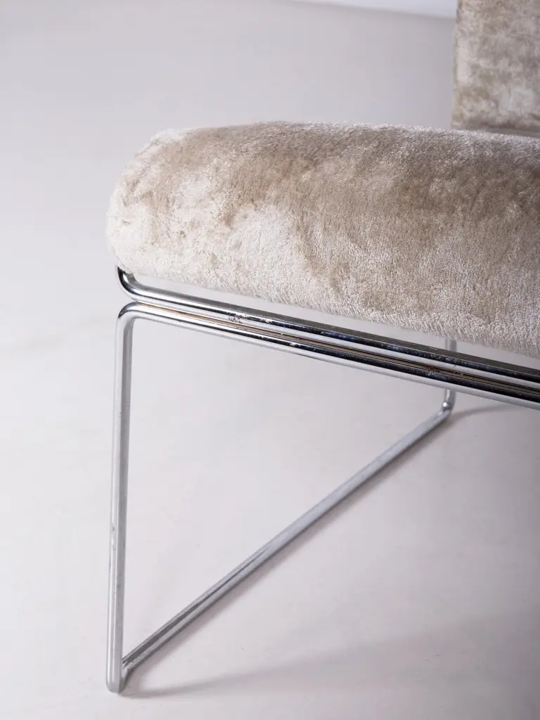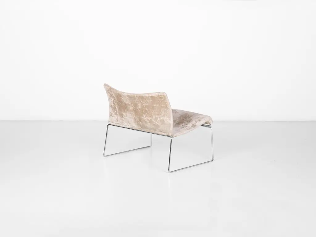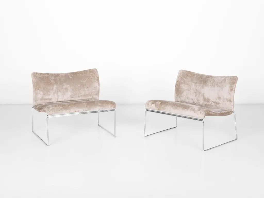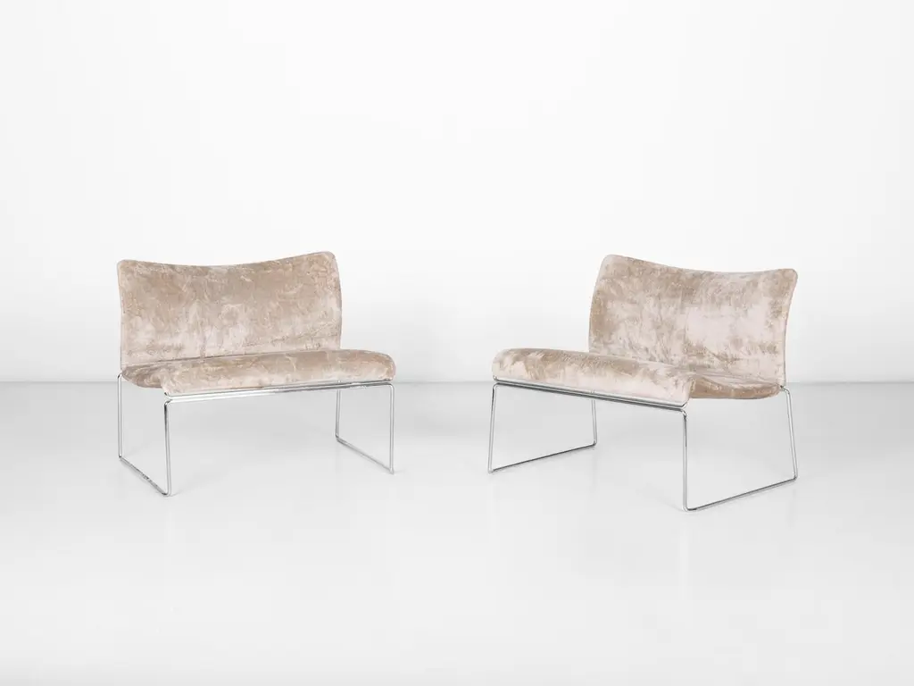Pair of Saghi armchairs designed by Kazuhide Takahama. Two sets available. Structure in chrome-plated steel rod with original removable upholstery in velvet. Seat and backrest slightly padded. Light, elegant, spacious Saghi is a stackable armchair.BibliographyAccademia delle Belle Arti di Brera, “Dino Gavina Ultrarazionale Ultramobile”, Editrice Compositori, Milano 1998, p. 185Fondazione Scientifica Querini Stampalia, “Dino Gavina, collezioni emblematiche del moderno dal 1950 al 1992”, Jaca Book, Milano 1992, p. 79