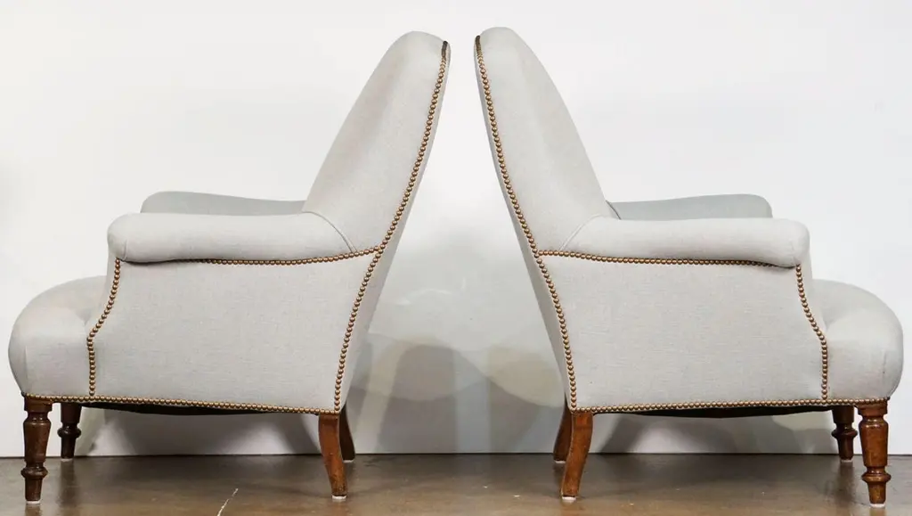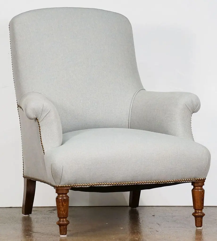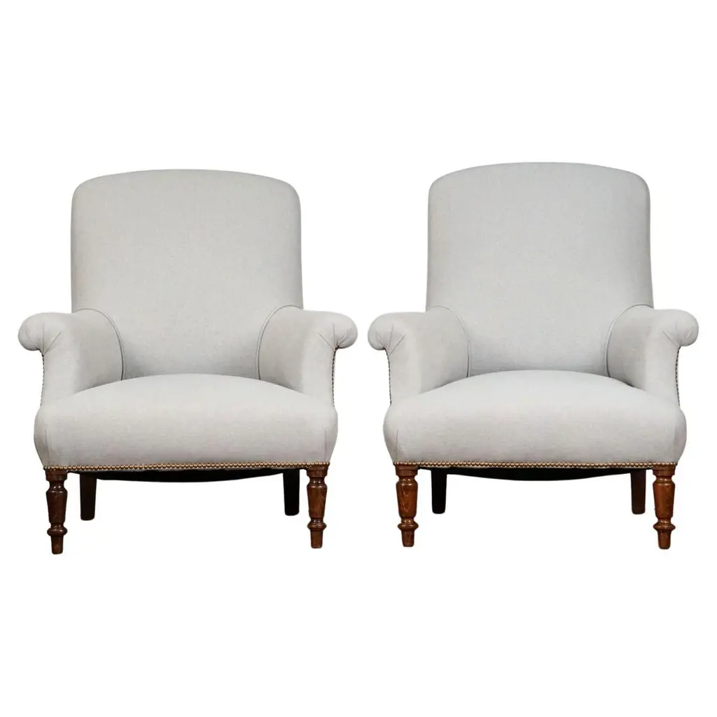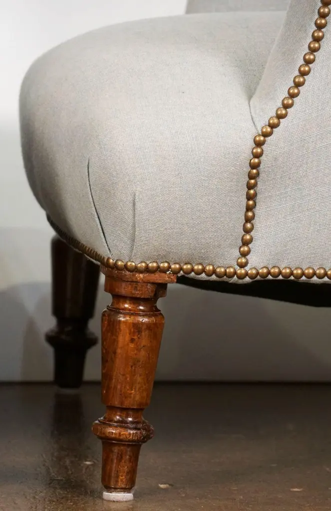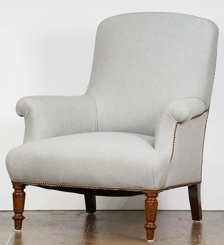 A fine pair of comfortable French upholstered armchairs, c.1880, completely refurbished and re-upholstered in a subtle grey pure linen fabric - in elegant contrast to the rich turned legs of brown walnut. Piped and trimmed with antiqued brass studs as they would originally have been. Measures: W 31.50 in x D 31 x H 36 inTwo available - Individually Priced - $5895 each chair.