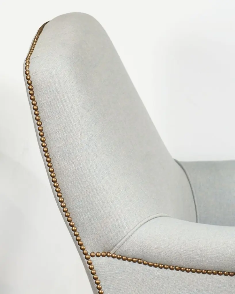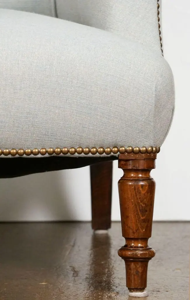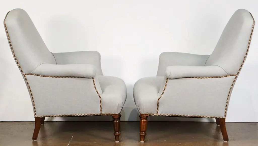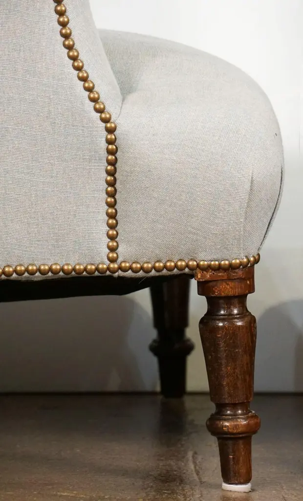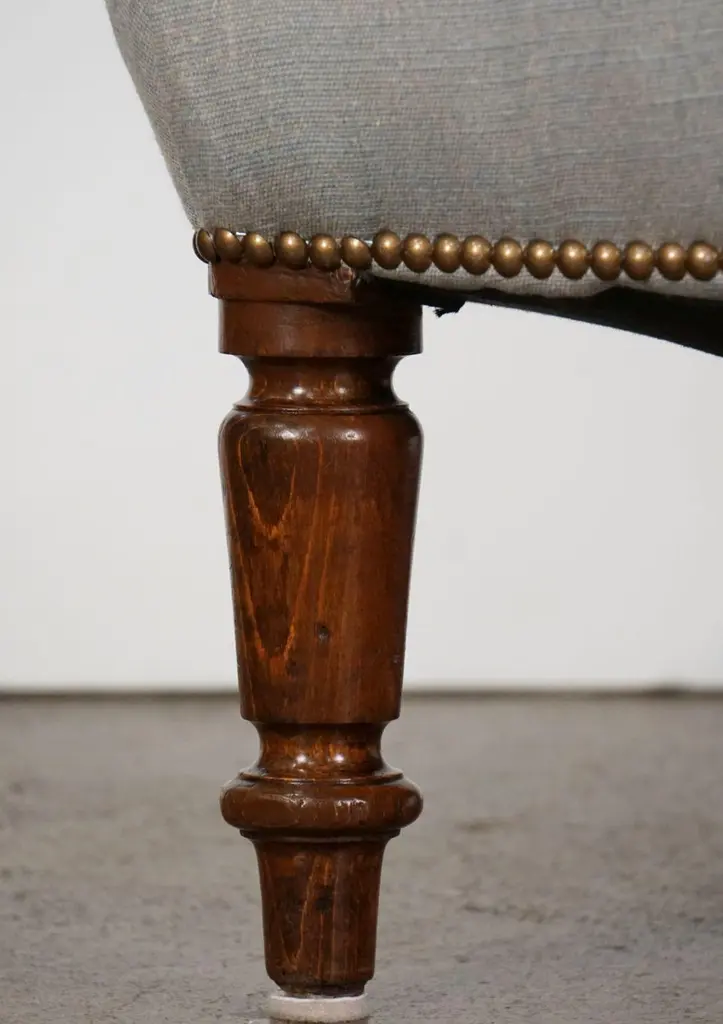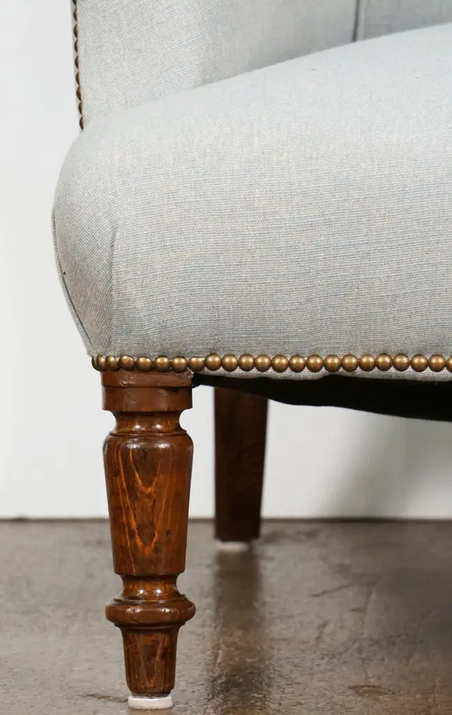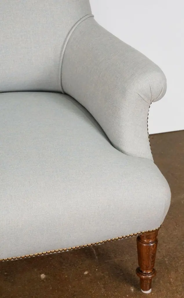 A fine pair of comfortable French upholstered armchairs, c.1880, completely refurbished and re-upholstered in a subtle grey pure linen fabric - in elegant contrast to the rich turned legs of brown walnut. Piped and trimmed with antiqued brass studs as they would originally have been. Measures: W 31.50 in x D 31 x H 36 inTwo available - Individually Priced - $5895 each chair.