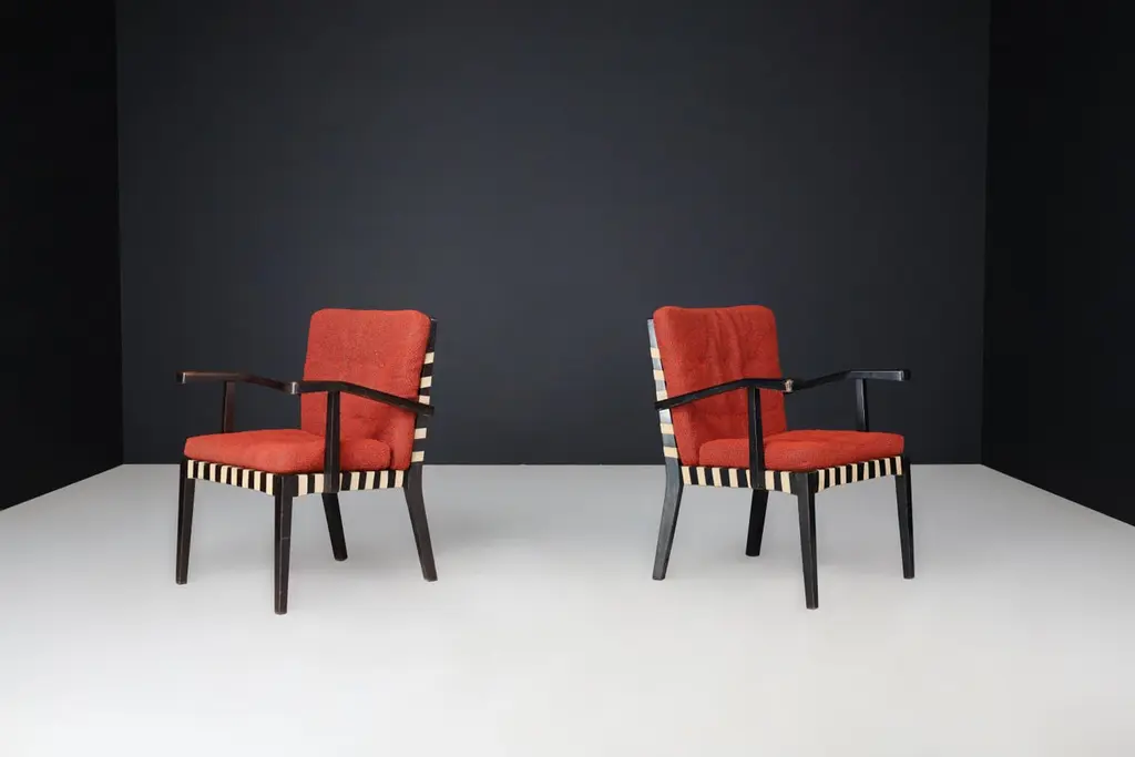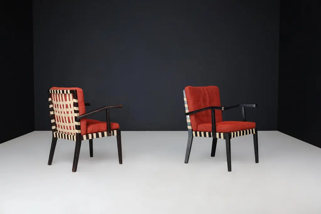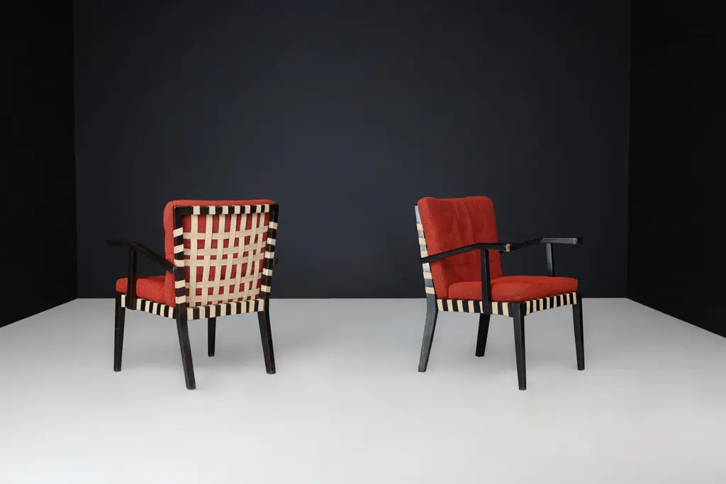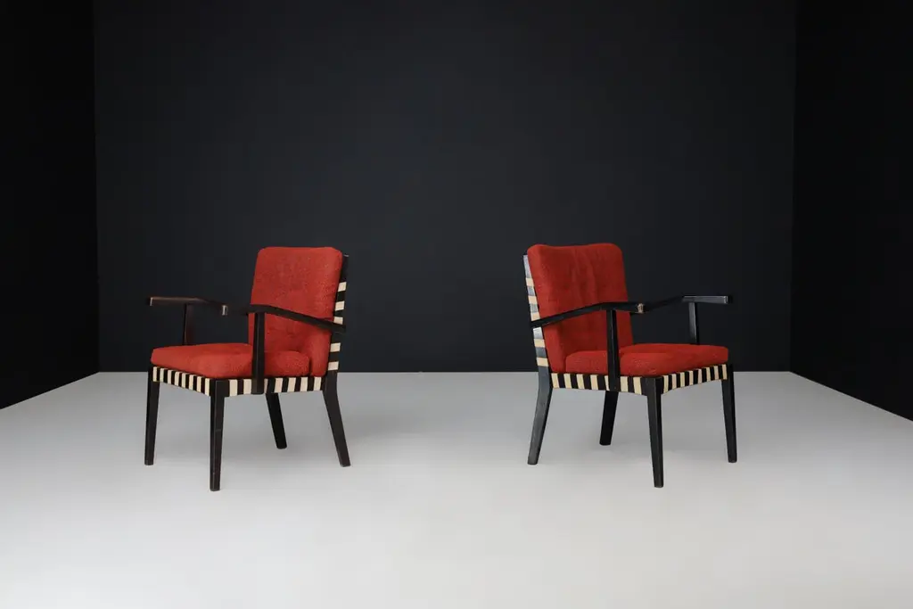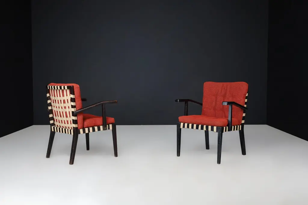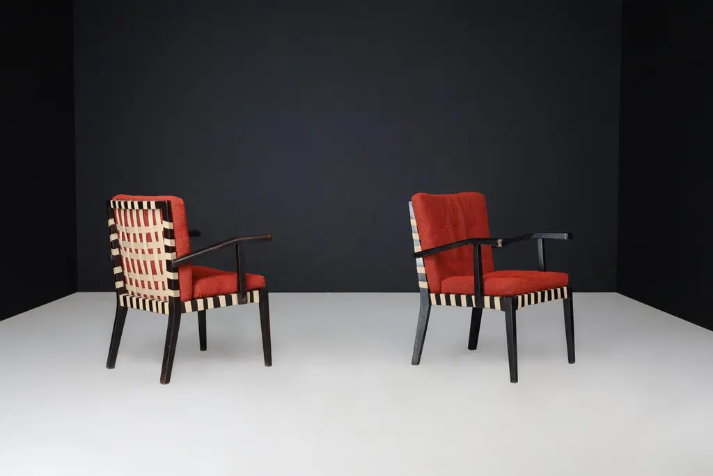 Pair of Vintage European Modernist Armchairs, c. 1930s–1950sThis elegant pair of armchairs reflects the refined transition between Art Deco aesthetics and the functional simplicity of early European Modernism. Likely crafted in Central or Eastern Europe during the 1930s–1950s—possibly within the Czech or German design traditions—these chairs showcase influences from Bauhaus and mid-century craftsmanship.The frames are constructed from solid wood and finished in a dark, rich stain. Their clean, geometric lines and angular armrests are hallmarks of early modernist design. At the same time, the lower section features bold alternating light and dark webbing that nods subtly to Art Deco’s graphic influence.Each chair retains its original canvas webbing and red wool-blend upholstery, showing visible signs of wear consistent with age and use. The woven jute/cotton strap support system underneath, exposed when cushions are removed, offers a glimpse into the traditional techniques used in pre-foam upholstery construction.Due to the age and condition of the materials, we recommend reupholstery before regular use to ensure both comfort and longevity. That said, the chairs are structurally sound and offer an excellent foundation for restoration while maintaining their historic character.These pieces are ideal for collectors or interior designers looking for authentic mid-century furniture with strong visual appeal and historical significance. Whether displayed in their current state as sculptural statements or updated for modern comfort, they bring timeless sophistication to any setting.This is a rare opportunity to own a pair of original vintage European armchairs embodying a pivotal design era—where craftsmanship, innovation, and aesthetics met in perfect harmony.
