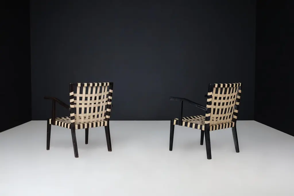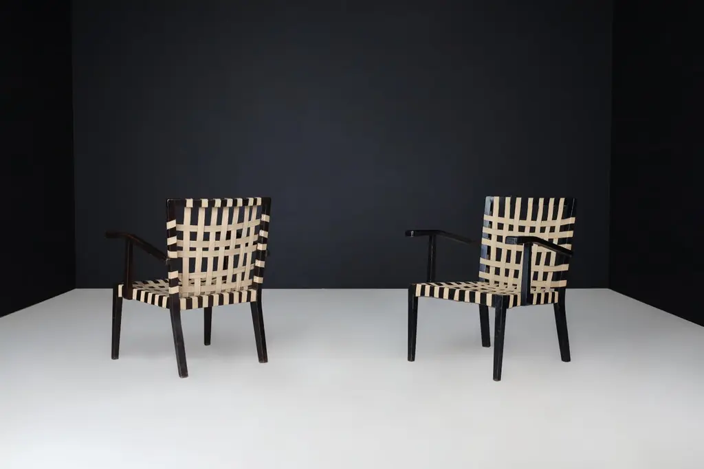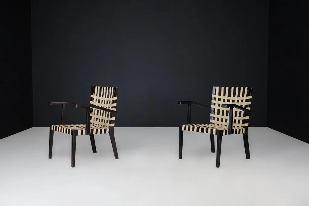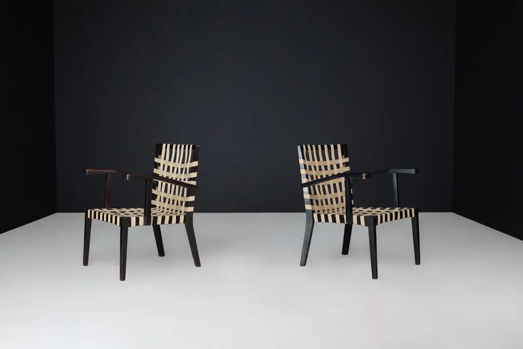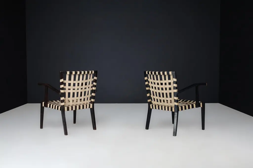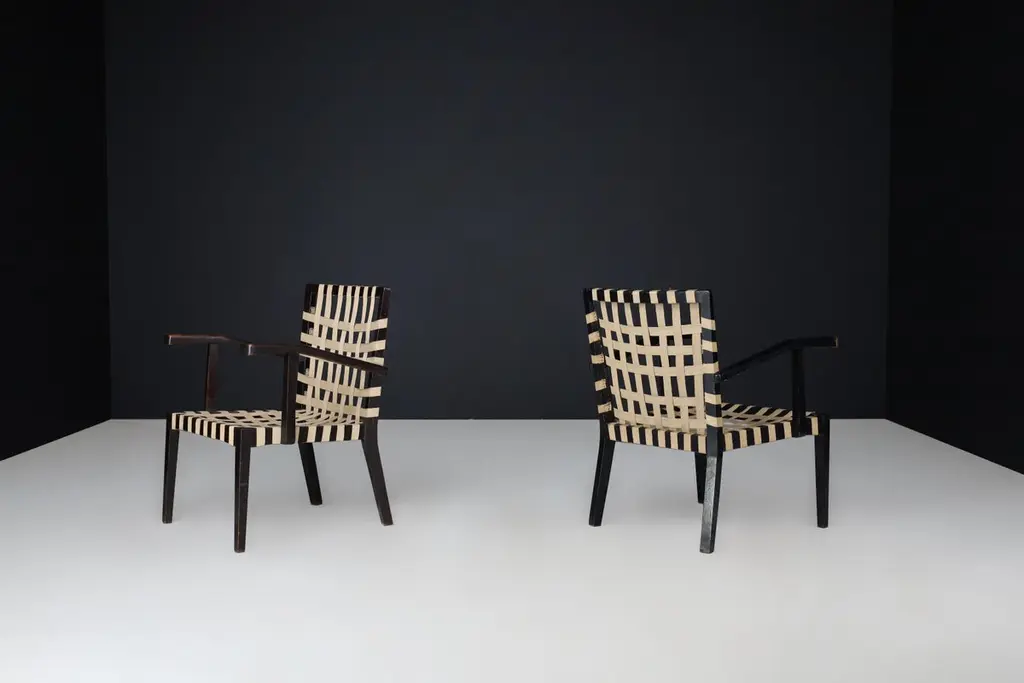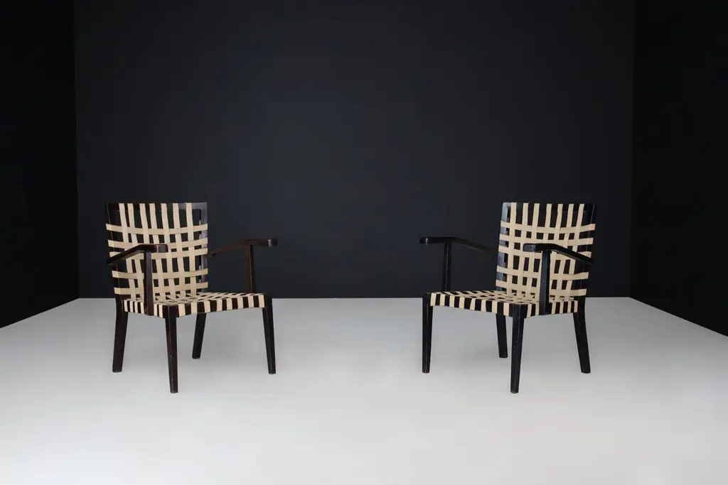 Pair of Vintage European Modernist Armchairs, c. 1930s–1950sThis elegant pair of armchairs reflects the refined transition between Art Deco aesthetics and the functional simplicity of early European Modernism. Likely crafted in Central or Eastern Europe during the 1930s–1950s—possibly within the Czech or German design traditions—these chairs showcase influences from Bauhaus and mid-century craftsmanship.The frames are constructed from solid wood and finished in a dark, rich stain. Their clean, geometric lines and angular armrests are hallmarks of early modernist design. At the same time, the lower section features bold alternating light and dark webbing that nods subtly to Art Deco’s graphic influence.Each chair retains its original canvas webbing and red wool-blend upholstery, showing visible signs of wear consistent with age and use. The woven jute/cotton strap support system underneath, exposed when cushions are removed, offers a glimpse into the traditional techniques used in pre-foam upholstery construction.Due to the age and condition of the materials, we recommend reupholstery before regular use to ensure both comfort and longevity. That said, the chairs are structurally sound and offer an excellent foundation for restoration while maintaining their historic character.These pieces are ideal for collectors or interior designers looking for authentic mid-century furniture with strong visual appeal and historical significance. Whether displayed in their current state as sculptural statements or updated for modern comfort, they bring timeless sophistication to any setting.This is a rare opportunity to own a pair of original vintage European armchairs embodying a pivotal design era—where craftsmanship, innovation, and aesthetics met in perfect harmony.