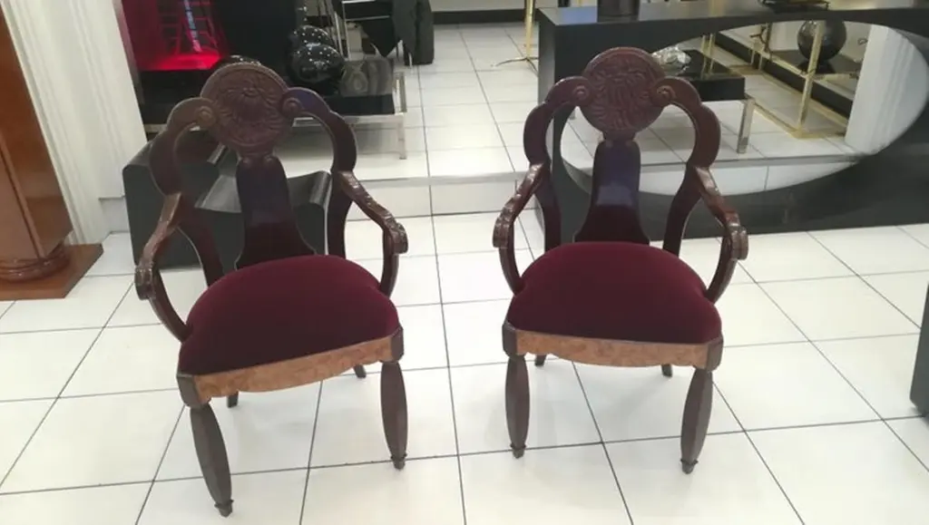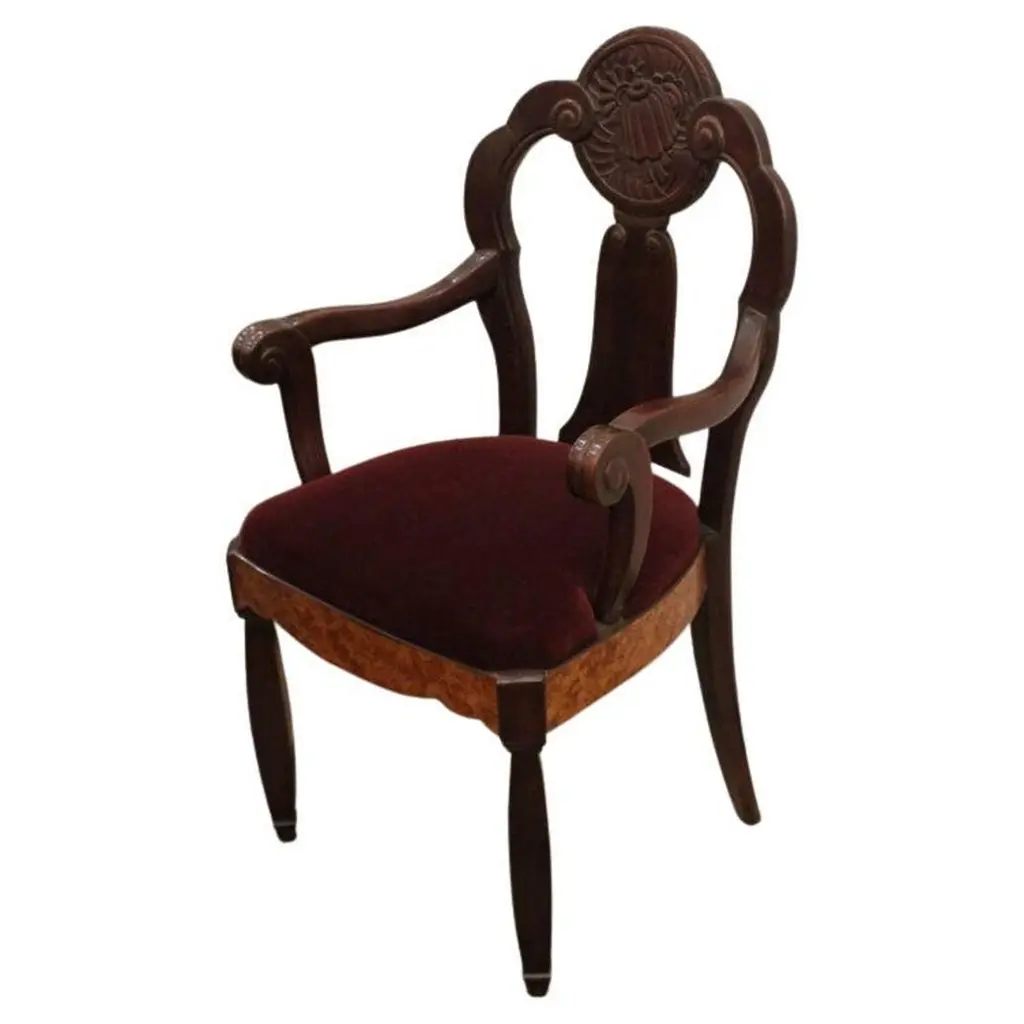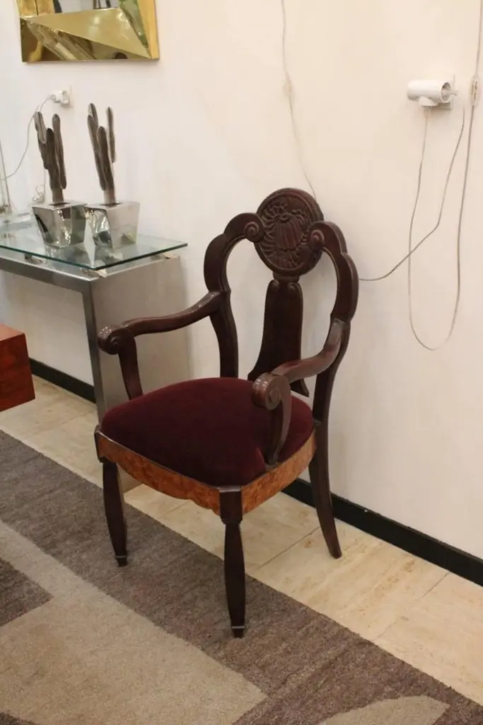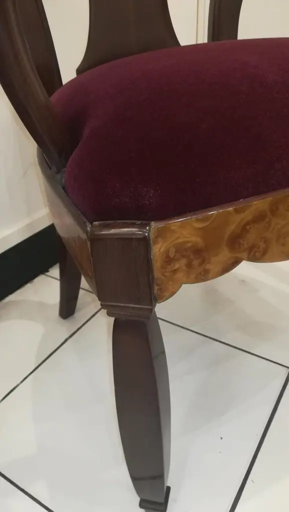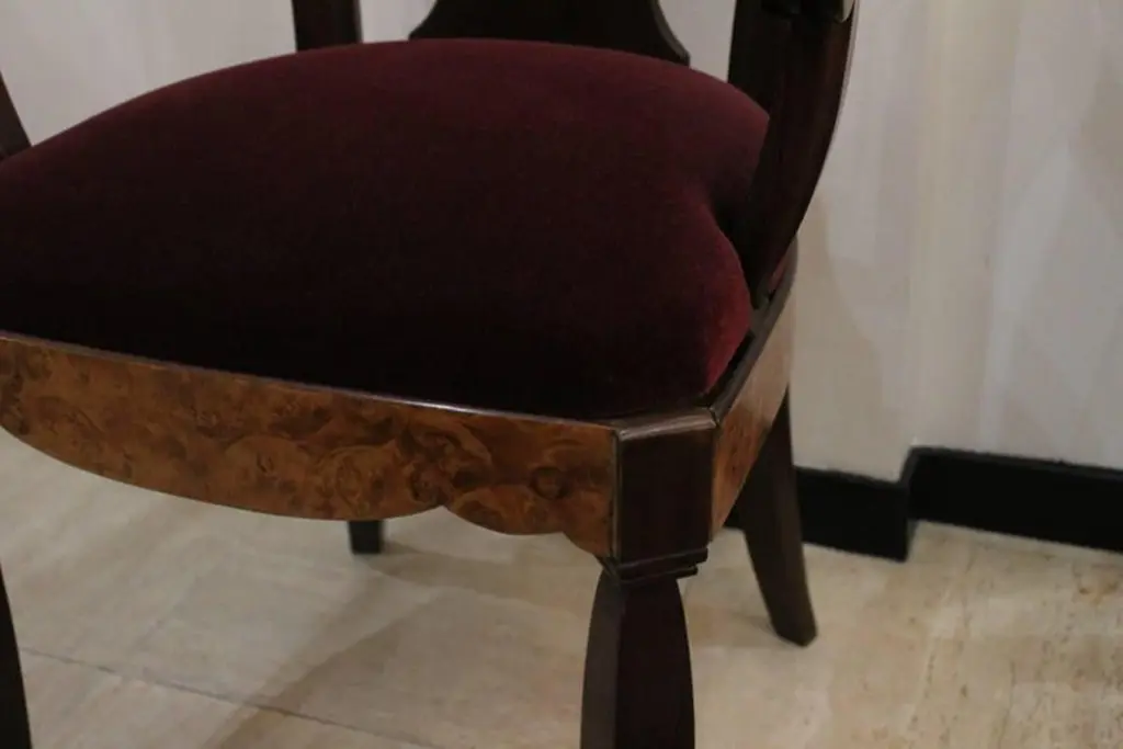 Maurice Dufrene pair of walnut burl and Amaranth wood armchairs circa 1925, velvet seat, carved chairback, in excellent condition.