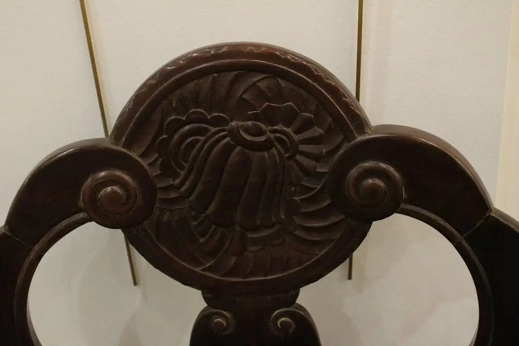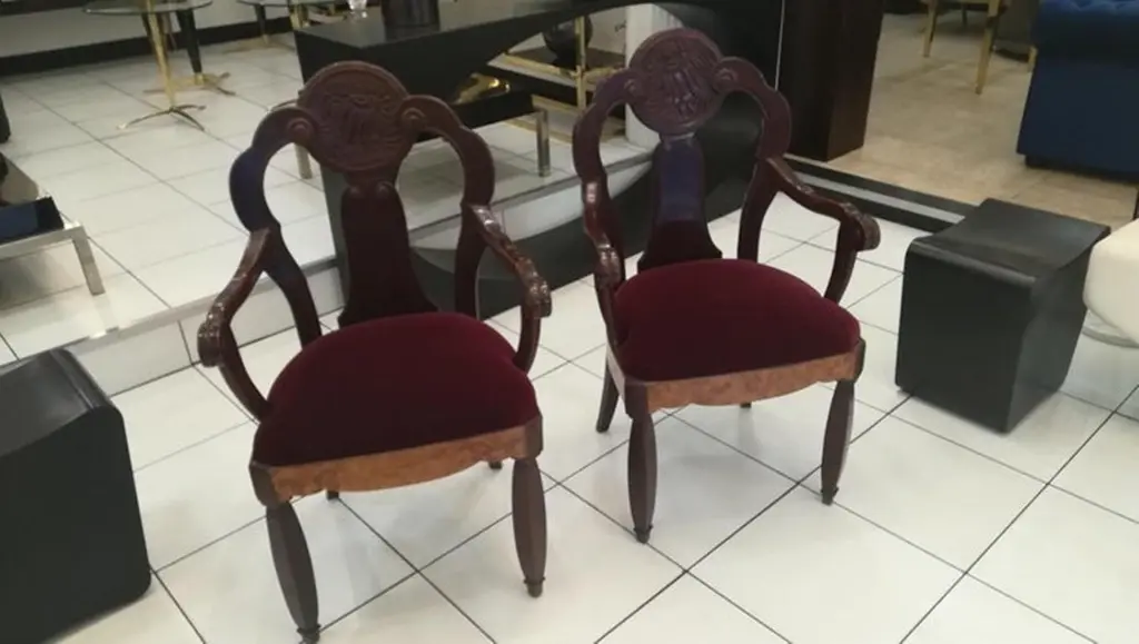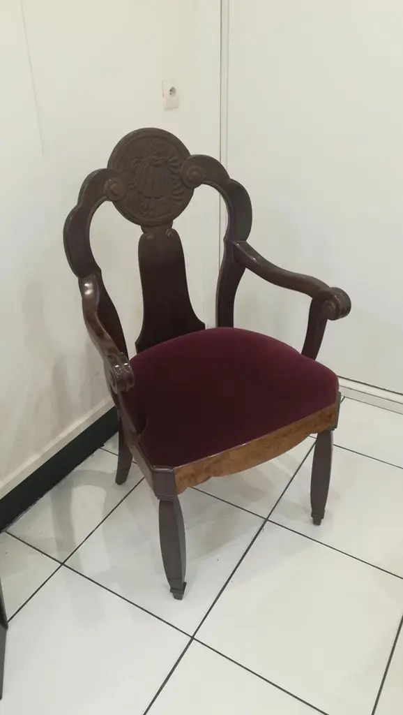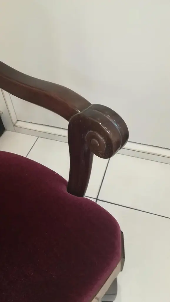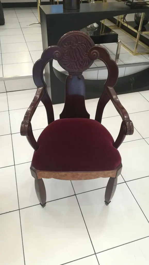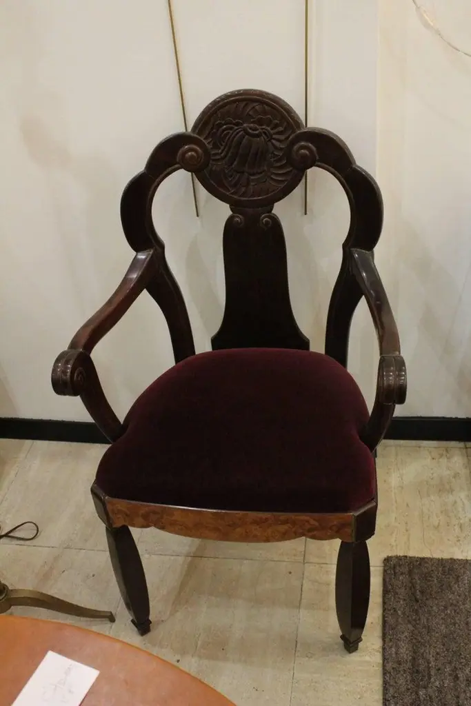 Maurice Dufrene pair of walnut burl and Amaranth wood armchairs circa 1925, velvet seat, carved chairback, in excellent condition.