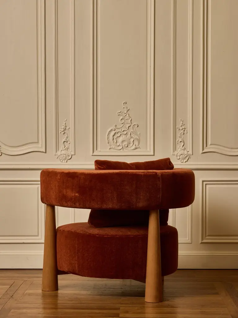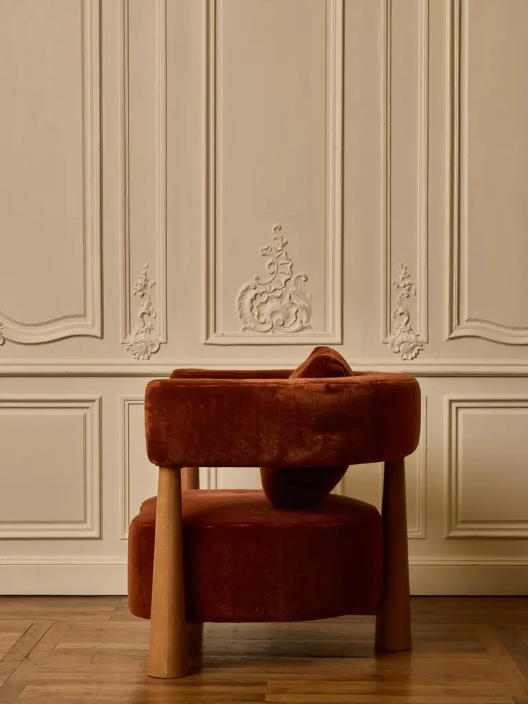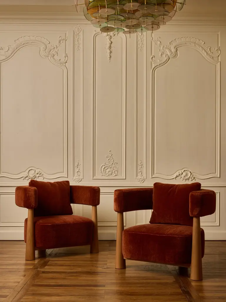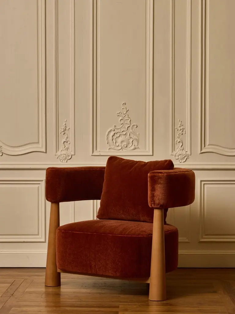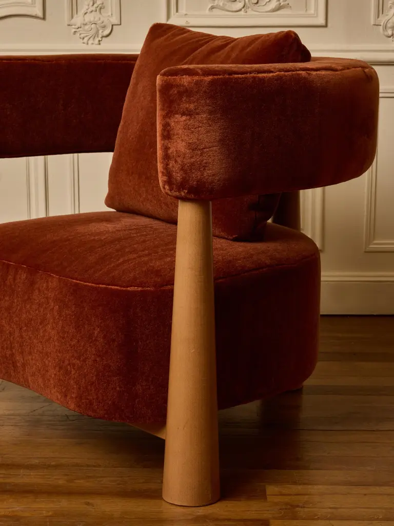 Pair of wooden armchair with seating and backrest upholstered with a mohair fabric by Pierre Frey.Création by Studio Glustin.France, 2024.