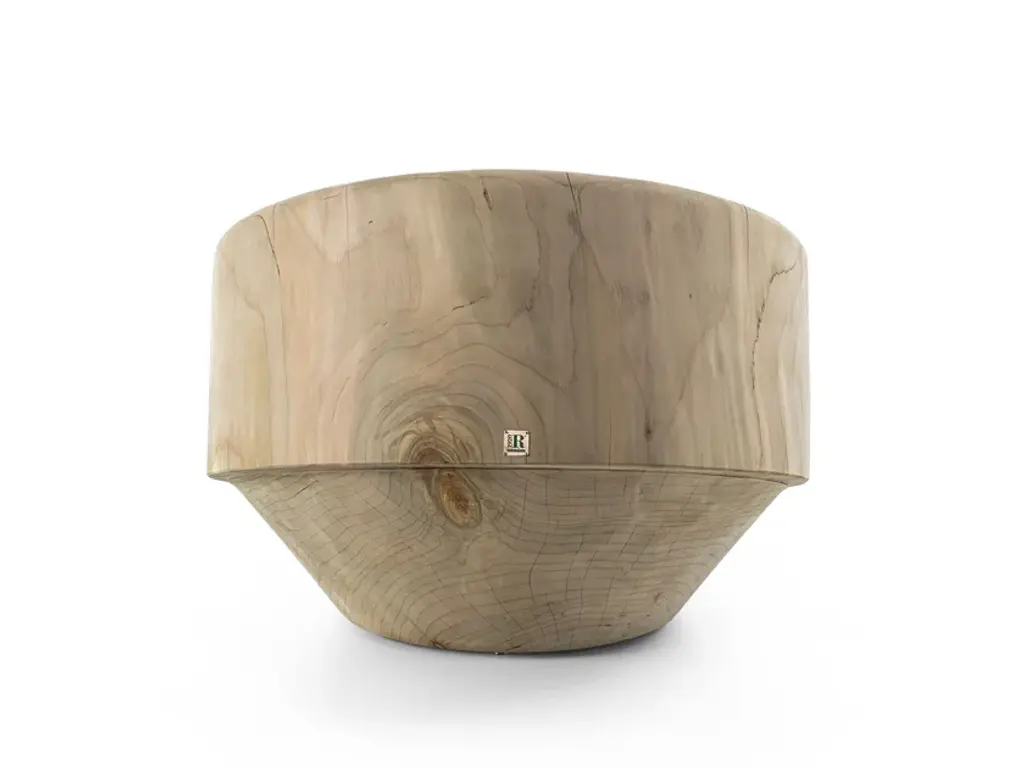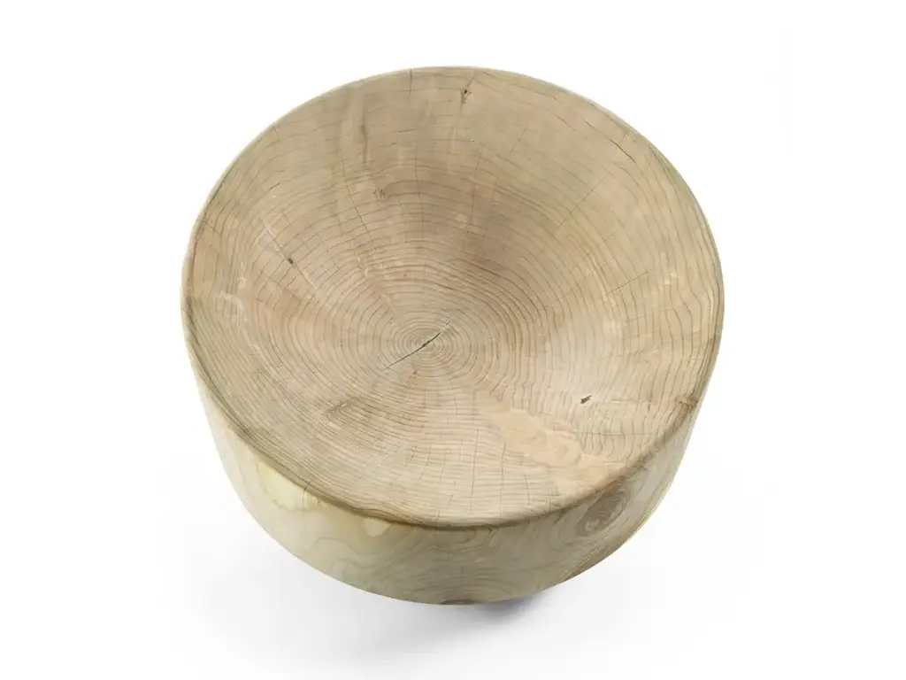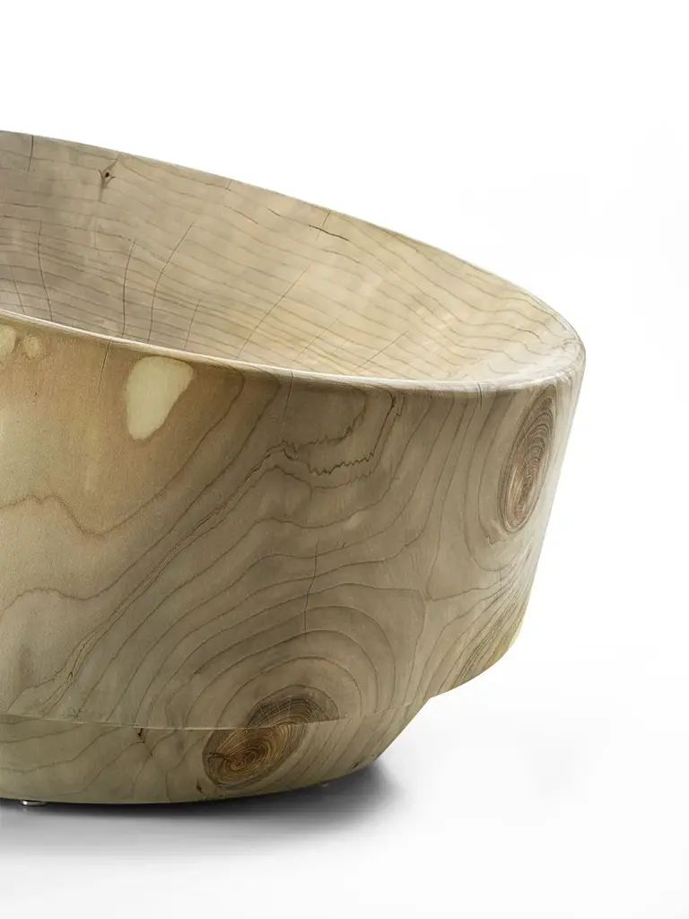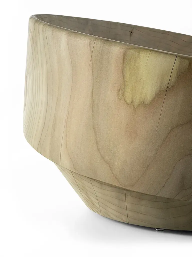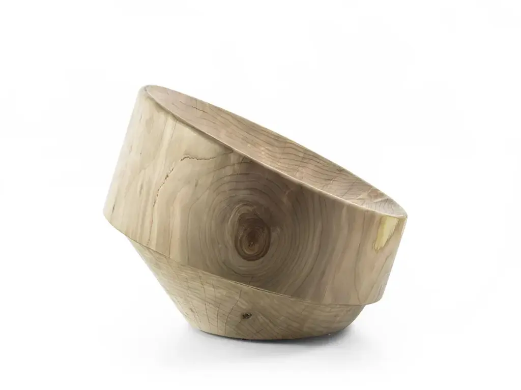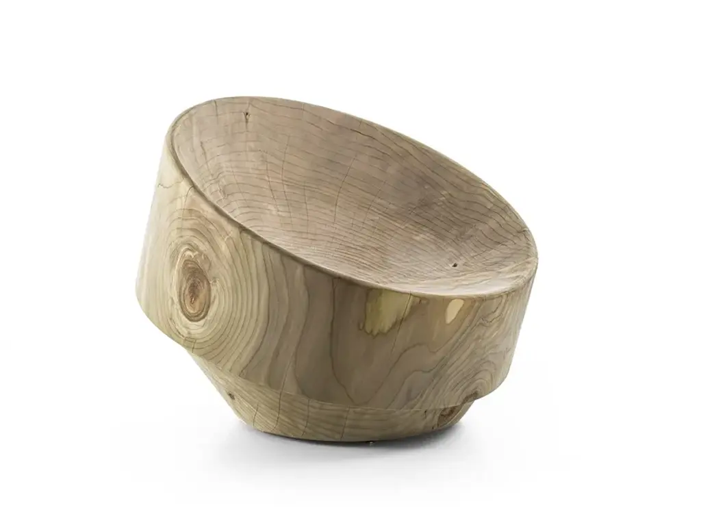 PALIO - Armchair in solid aromatic cedar wood, crafted from a single block. A sculptural monolith with a curvilinear design, characterized by an ergonomic seat that flows seamlessly into the backrest. Its design stems from a careful study of the impact of perfect, almost kinetic, circular shapes on raw material volumes.
