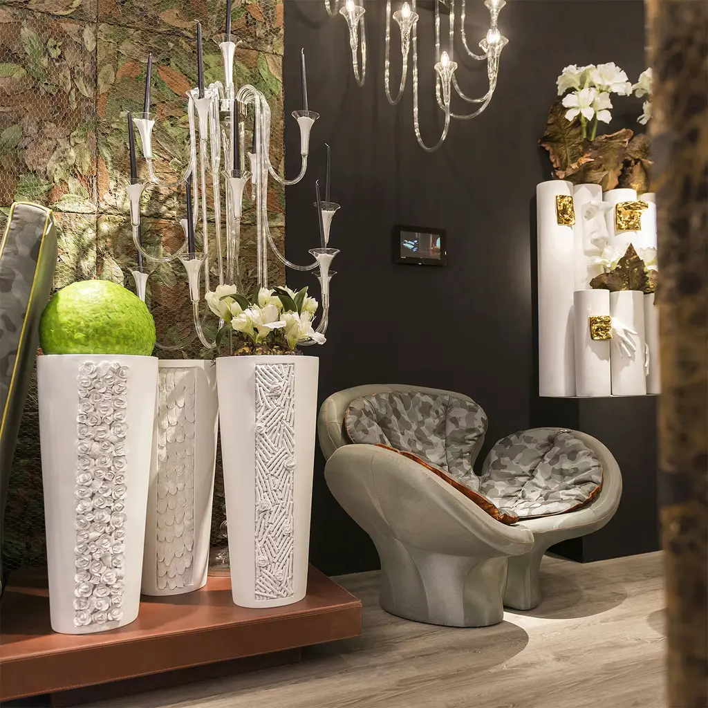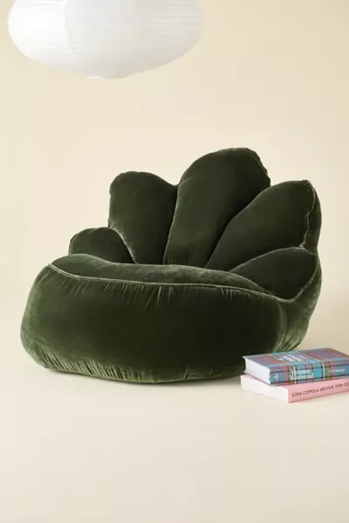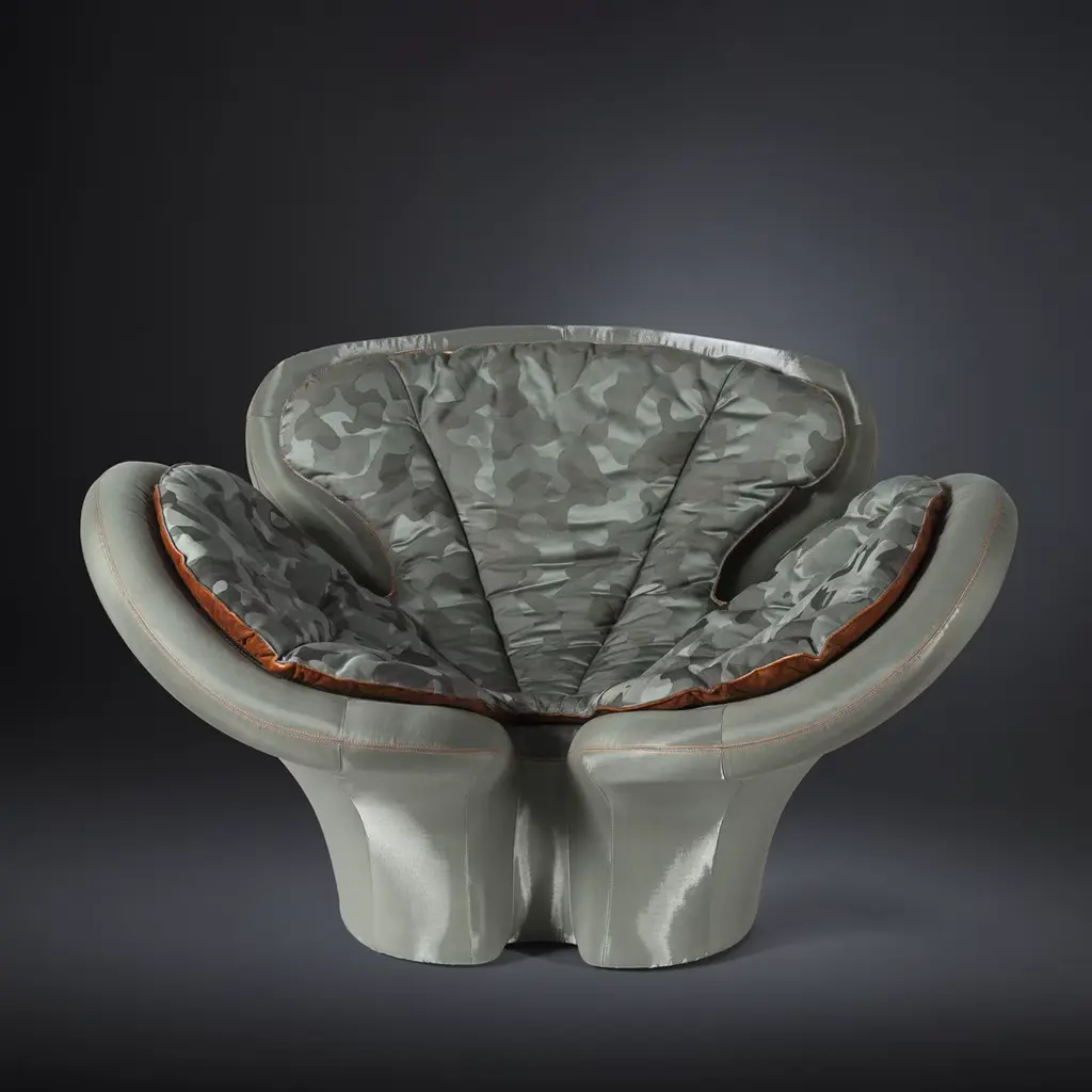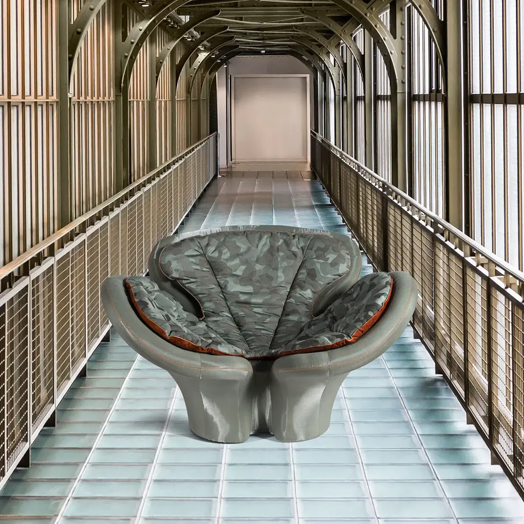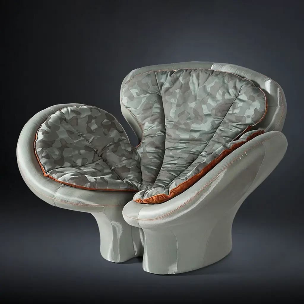 Inspired by the wide and rounded corolla of a pansy, this green armchair is an exclusive phytomorphic design of sculptural appeal. The shaped Dacron-lined cushion lies on a structure whose core is obtained by combining hardboard, plywood, and spruce and whose generous padding boasts that perfect level of comfort offered by open-cell different-density expanded polyurethane.
