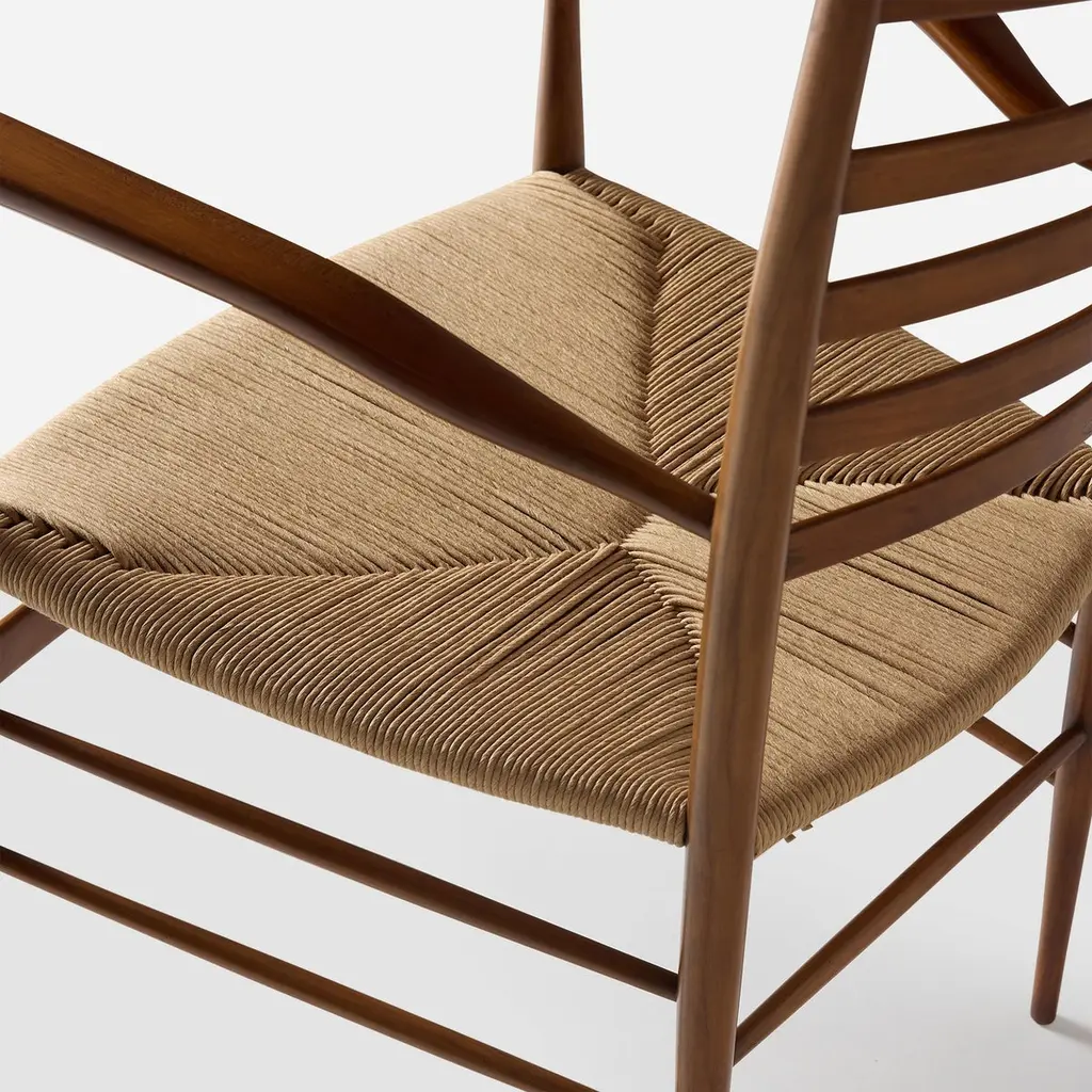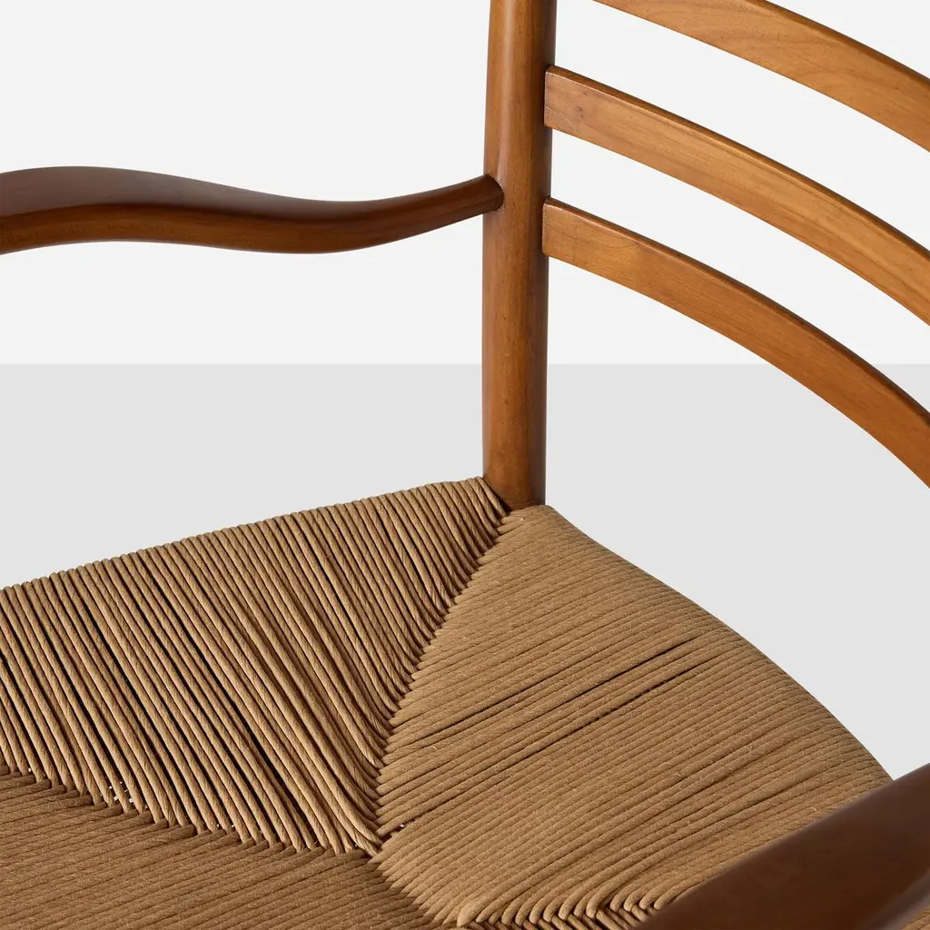 A pair of fully restored ladder back chiavarine arm chairs manufactured in cherry wood, complete with new hand woven paper cord seats. Stamped with the makers mark.