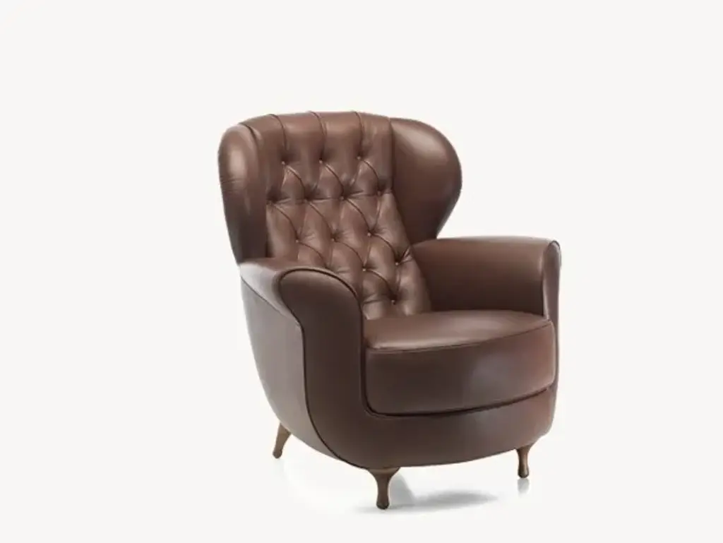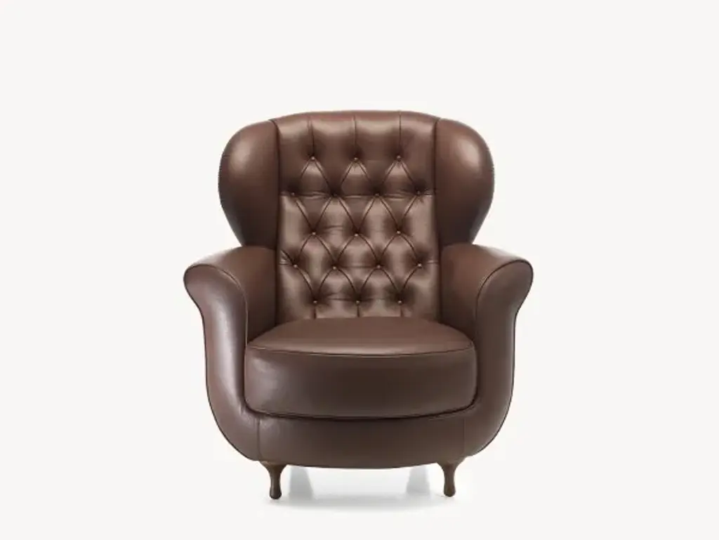 Papy Bergere has a seat with stress-resistant polyurethane foam in varied densities and polyester fiberfill on wood frame. Feet are beech screwed to the structure, which are permanently fixed to the frame. Seat cushions, non-reversible, are polyurethane foam in varied densities and polyester fiberfill. Back cushions are goose down. Papy Bergere is available in leatther or not removable fabric.