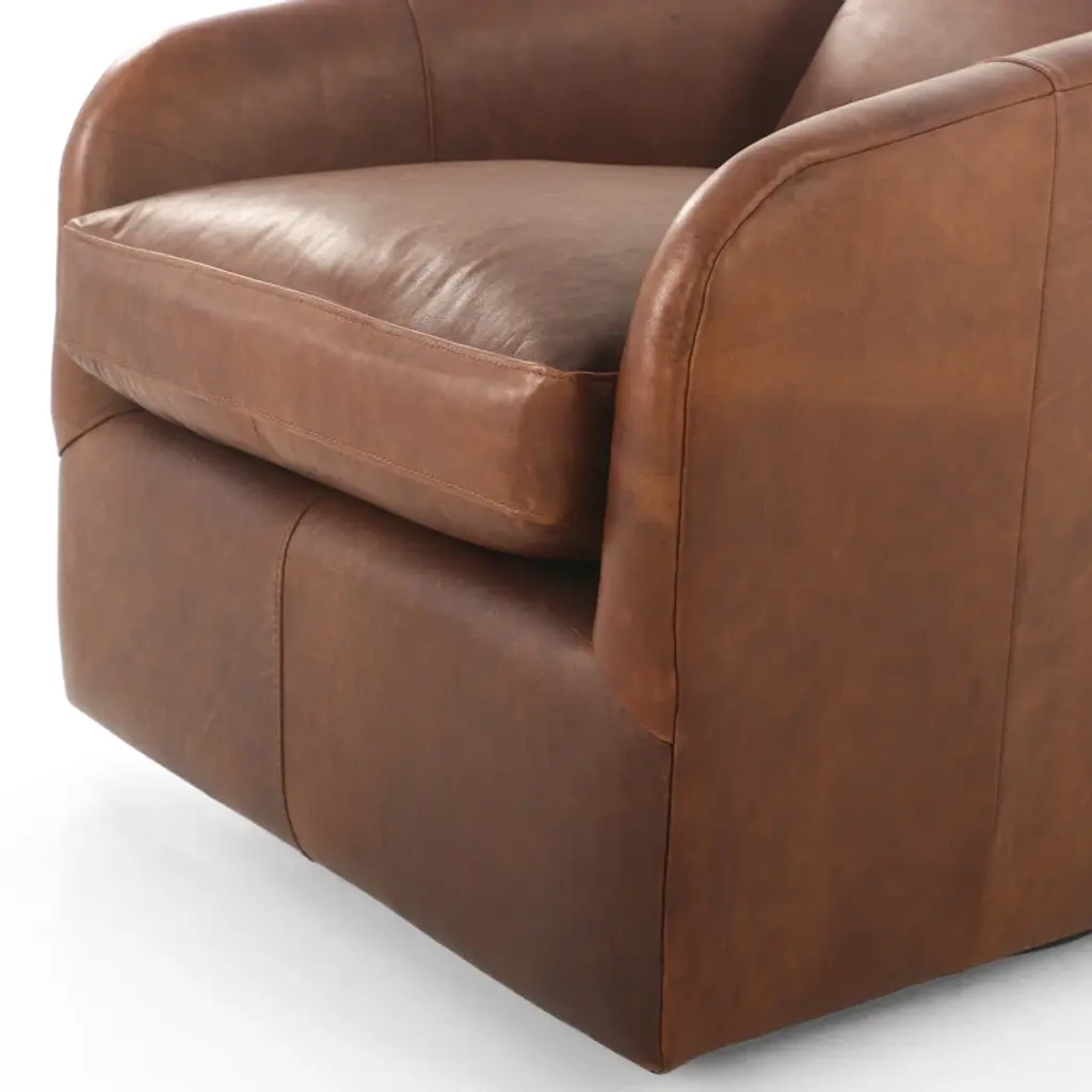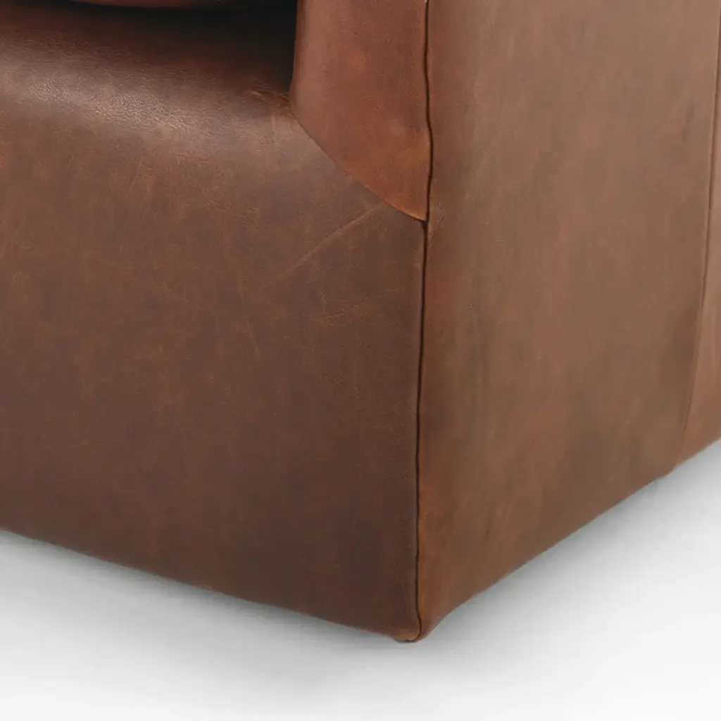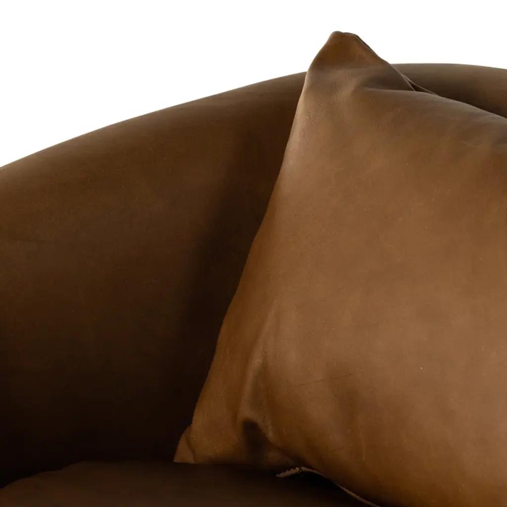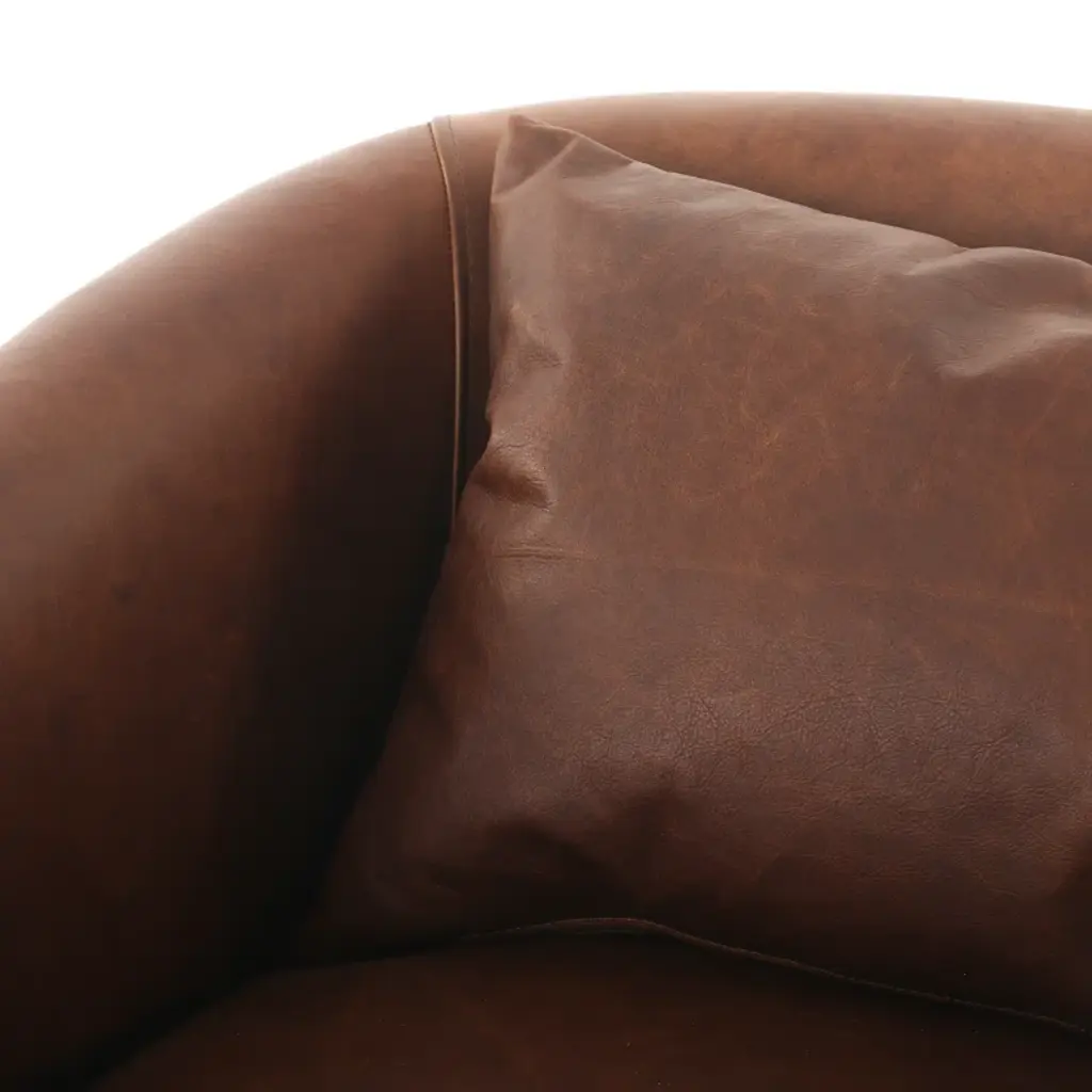 Curved arms and a single pillow create a laid-back look, while a hidden swivel turns a traditional form into something novel. Sourced from one of the oldest family-owned tanneries in Italy’s Bassano del Grappa, our top-grain heirloom leather covering is salvaged and processed from upcycled hides featuring an abundance of natural markings, scars, and color variations. The result? Beautifully supple, buttery soft hides with an unmatched depth of color and richness, and an authentic lived-in look.