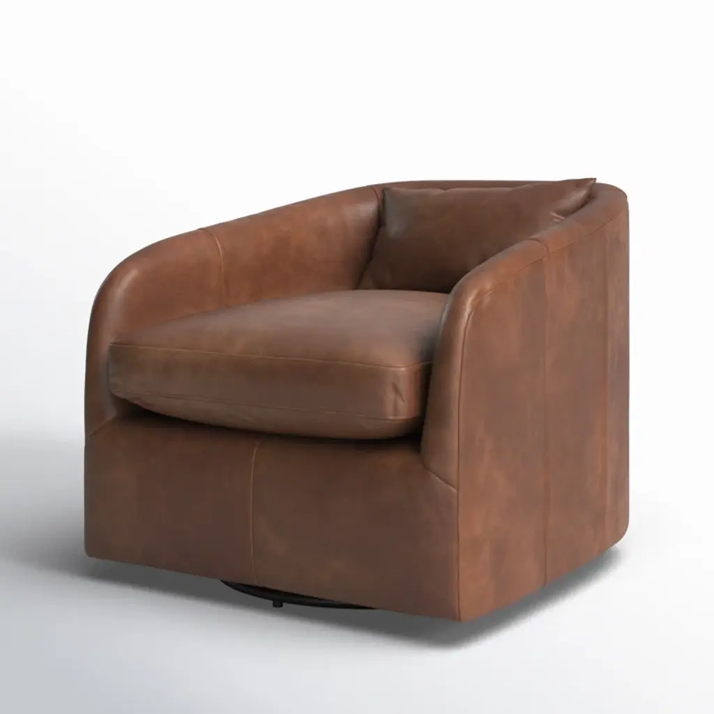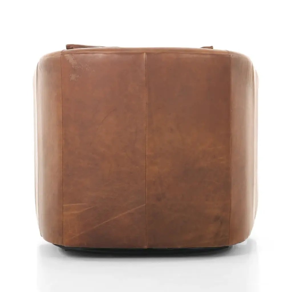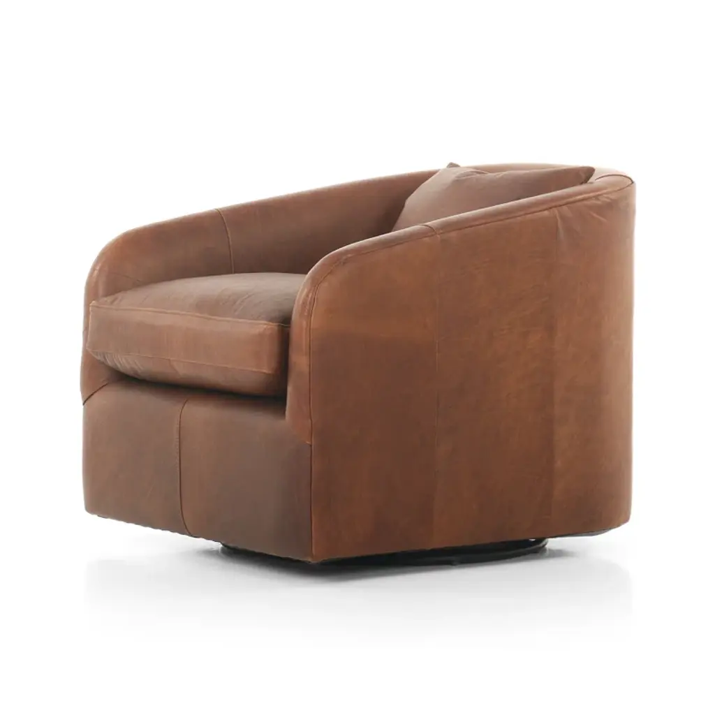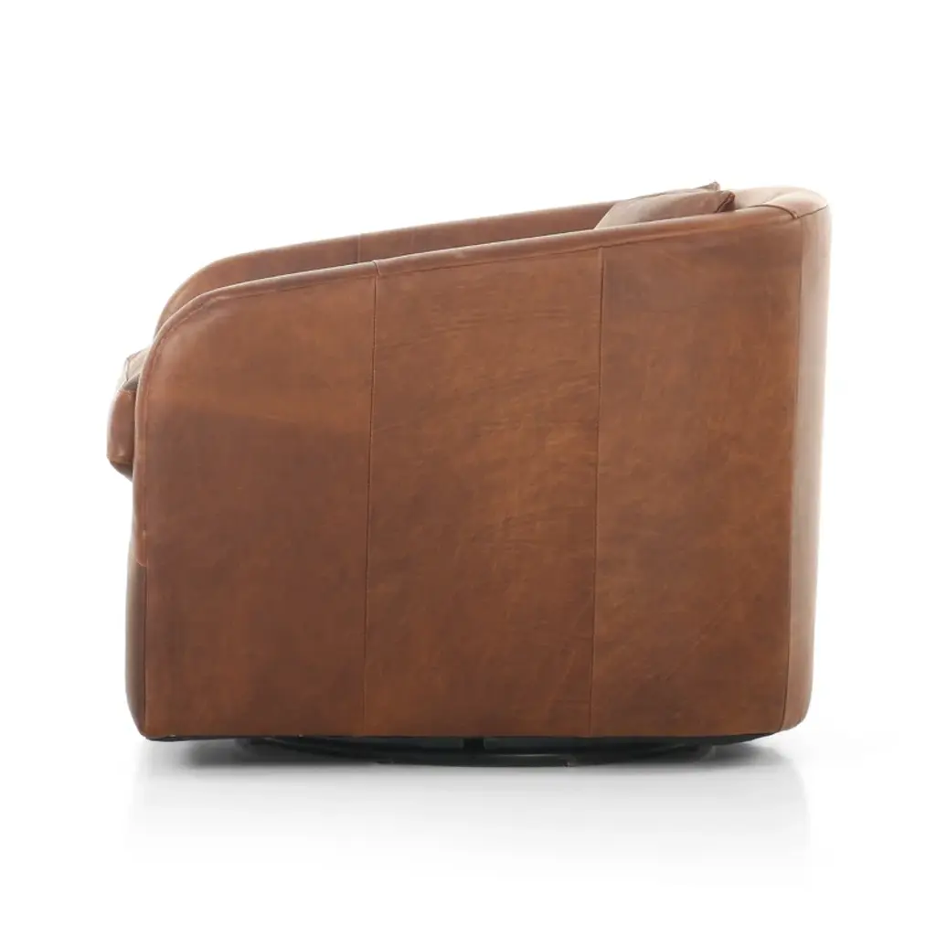Curved arms and a single pillow create a laid-back look, while a hidden swivel turns a traditional form into something novel. Sourced from one of the oldest family-owned tanneries in Italy’s Bassano del Grappa, our top-grain heirloom leather covering is salvaged and processed from upcycled hides featuring an abundance of natural markings, scars, and color variations. The result? Beautifully supple, buttery soft hides with an unmatched depth of color and richness, and an authentic lived-in look.