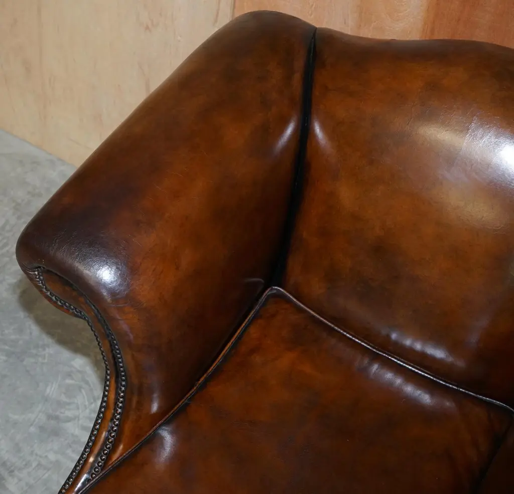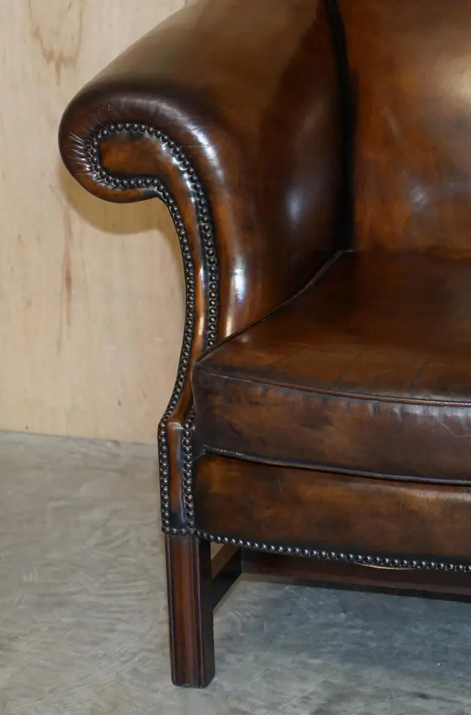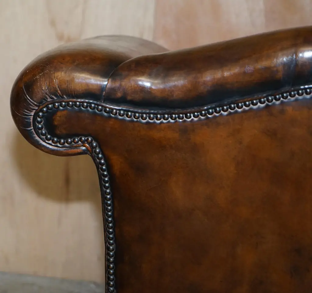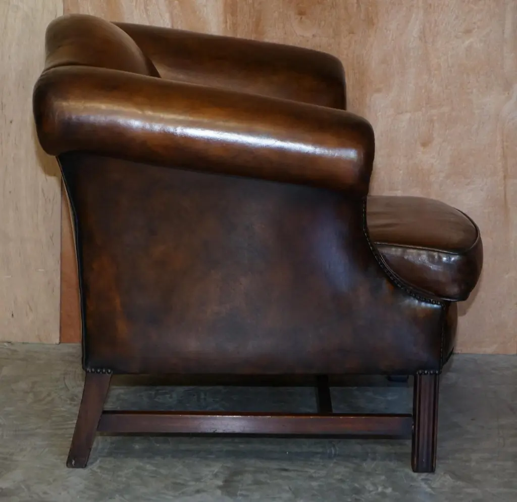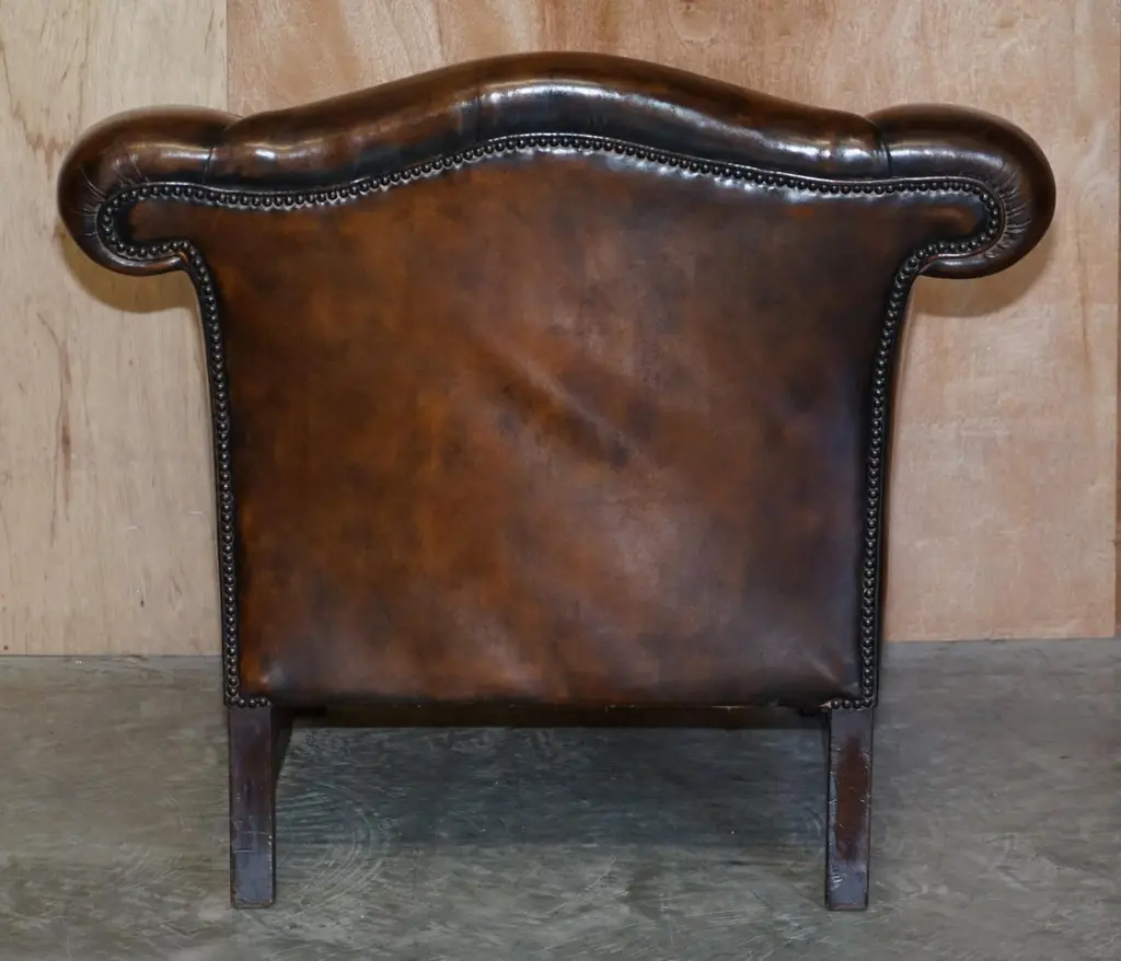 We are delighted to offer for sale this lovely pair of fully restored hand dyed brown leather camelback armchairs which is part of a large suiteEach piece is very comfortable, they all have padded and over stuffed backs, the leather has been hand nail tacked in place using antiqued studs. The frames are beech wood and they have reeded legs with Georgian H framed stretchesCondition wise everything has been stripped right back to the base colour, they’ve then been hand dyed they wonderful deep cigar brown colour, the frames have been checked and secured, then French polished DimensionsHeight:- 83.5cmWidth:- 98.5cmDepth:- 87cmSeat height:- 44cmPlease note all measurements are taken at the widest point This item is available for collection from our Pulborough warehousesConditionPlease view the very detailed pictures as they form part of the description pertaining to the condition.Please note vintage period and original items such as leather seating will always have natural patina in the form of creasing and wear, we recommend annual waxing to ensure no moisture is lost, also hand dyed leather is not recommended to sit in direct sunlight for prolonged periods of time as it will dry out and fade.