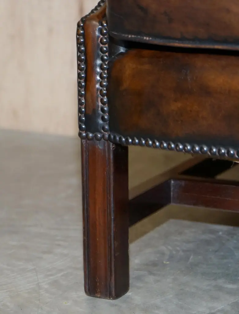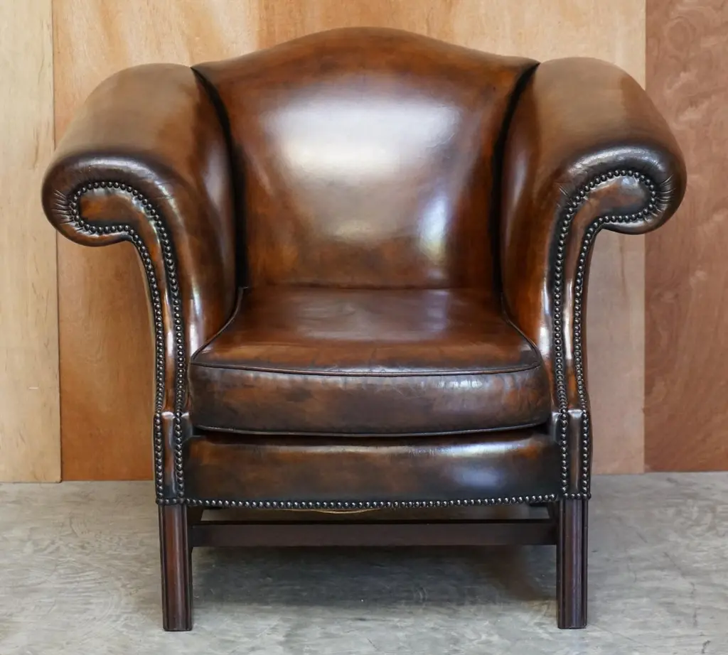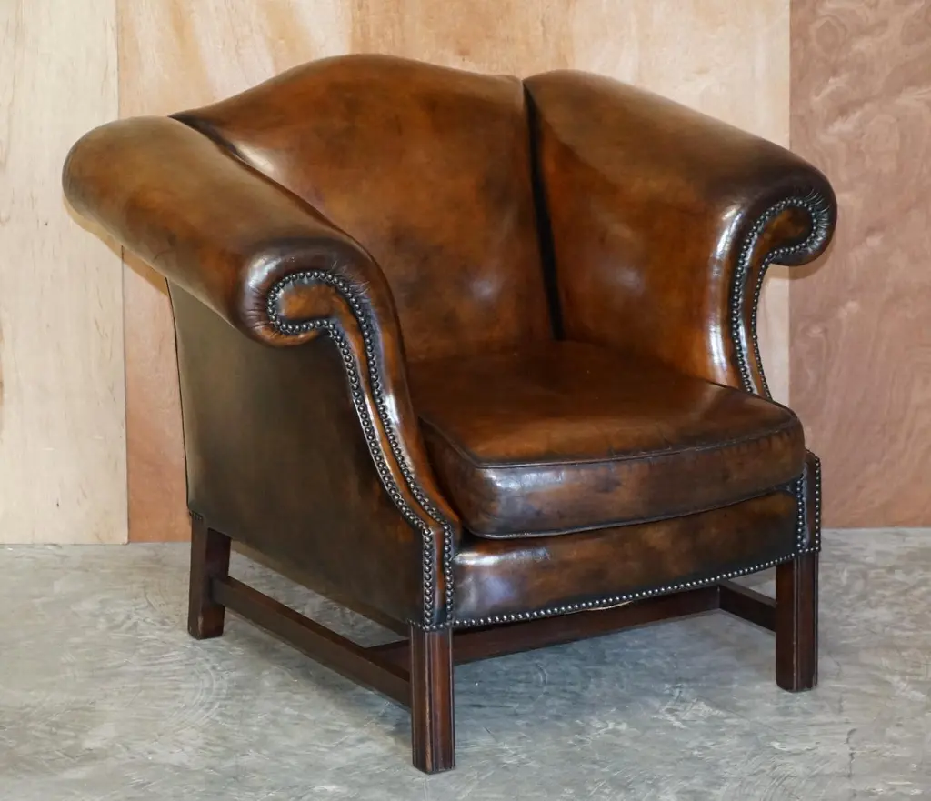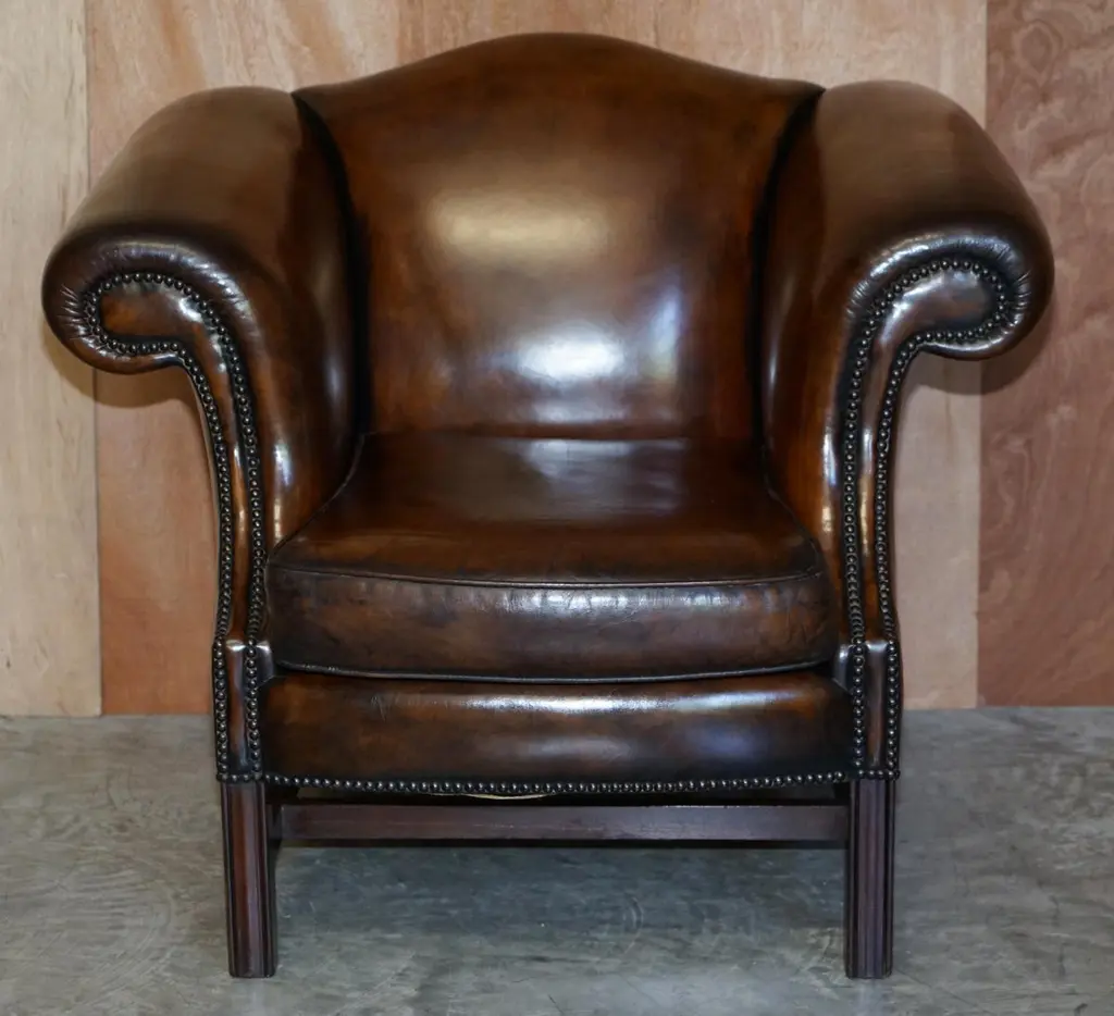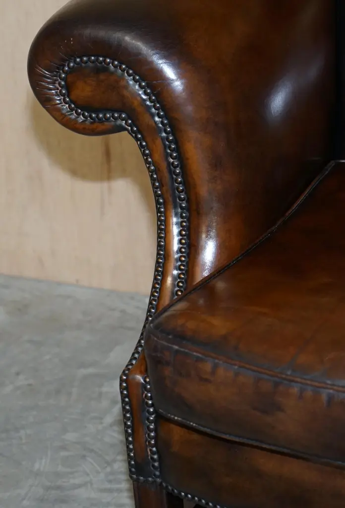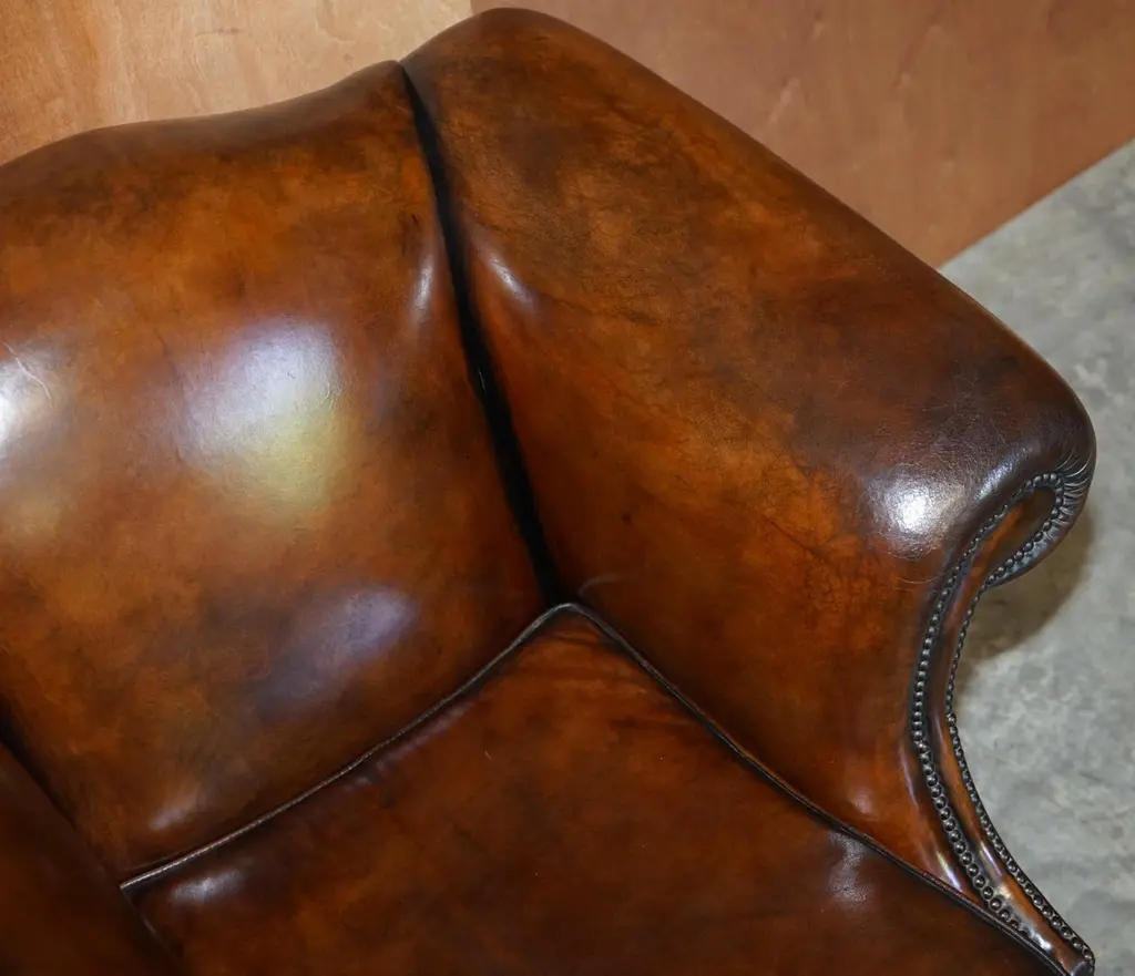 We are delighted to offer for sale this lovely pair of fully restored hand dyed brown leather camelback armchairs which is part of a large suiteEach piece is very comfortable, they all have padded and over stuffed backs, the leather has been hand nail tacked in place using antiqued studs. The frames are beech wood and they have reeded legs with Georgian H framed stretchesCondition wise everything has been stripped right back to the base colour, they’ve then been hand dyed they wonderful deep cigar brown colour, the frames have been checked and secured, then French polished DimensionsHeight:- 83.5cmWidth:- 98.5cmDepth:- 87cmSeat height:- 44cmPlease note all measurements are taken at the widest point This item is available for collection from our Pulborough warehousesConditionPlease view the very detailed pictures as they form part of the description pertaining to the condition.Please note vintage period and original items such as leather seating will always have natural patina in the form of creasing and wear, we recommend annual waxing to ensure no moisture is lost, also hand dyed leather is not recommended to sit in direct sunlight for prolonged periods of time as it will dry out and fade.