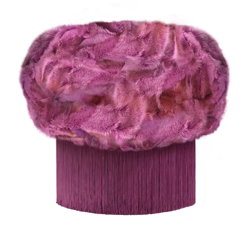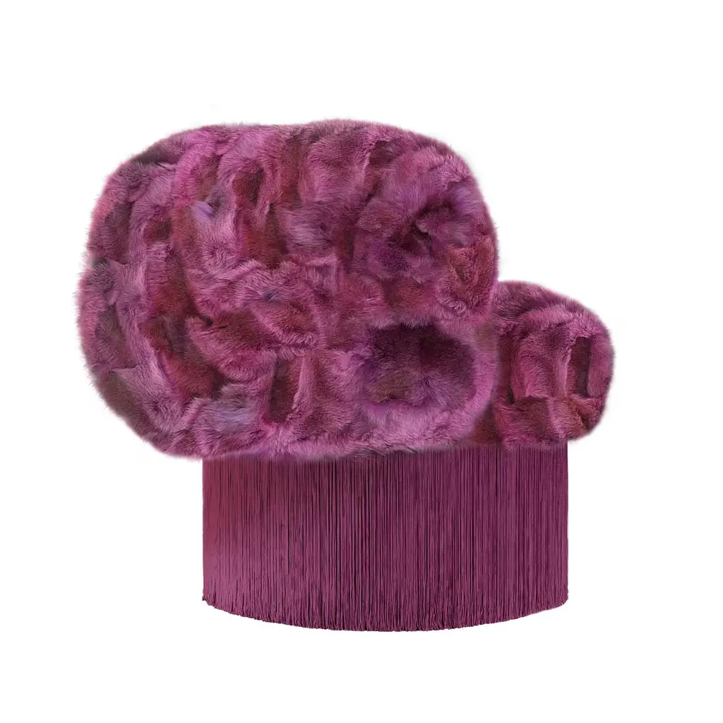 Lorenza Bozzoli Couture presents a limited-edition collection characterized by an extremely soft design, eclectic and distinctly retro. The new Fur Collection offers the Couture iconic pieces in a furry version with colours inspired by the seventies and sophisticated fur upholstery that emphasize the enveloping and smooth shapes for a cocoon effect. Pirouttes armchair in patchwork of fuxia coyote fur, warm, soft and fluffy. Each bespoke piece is stamped on the bottom of the pouf’s lining and personally signed, numbered, and dated by designer.