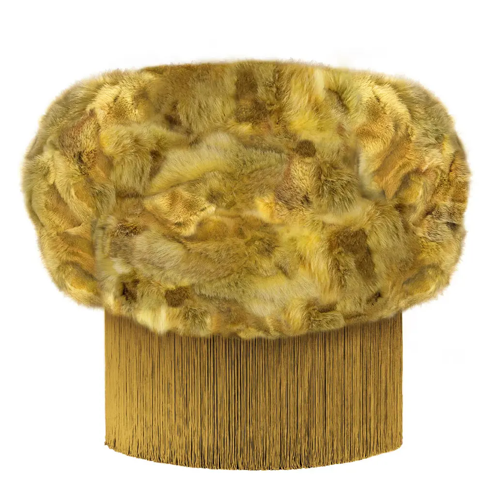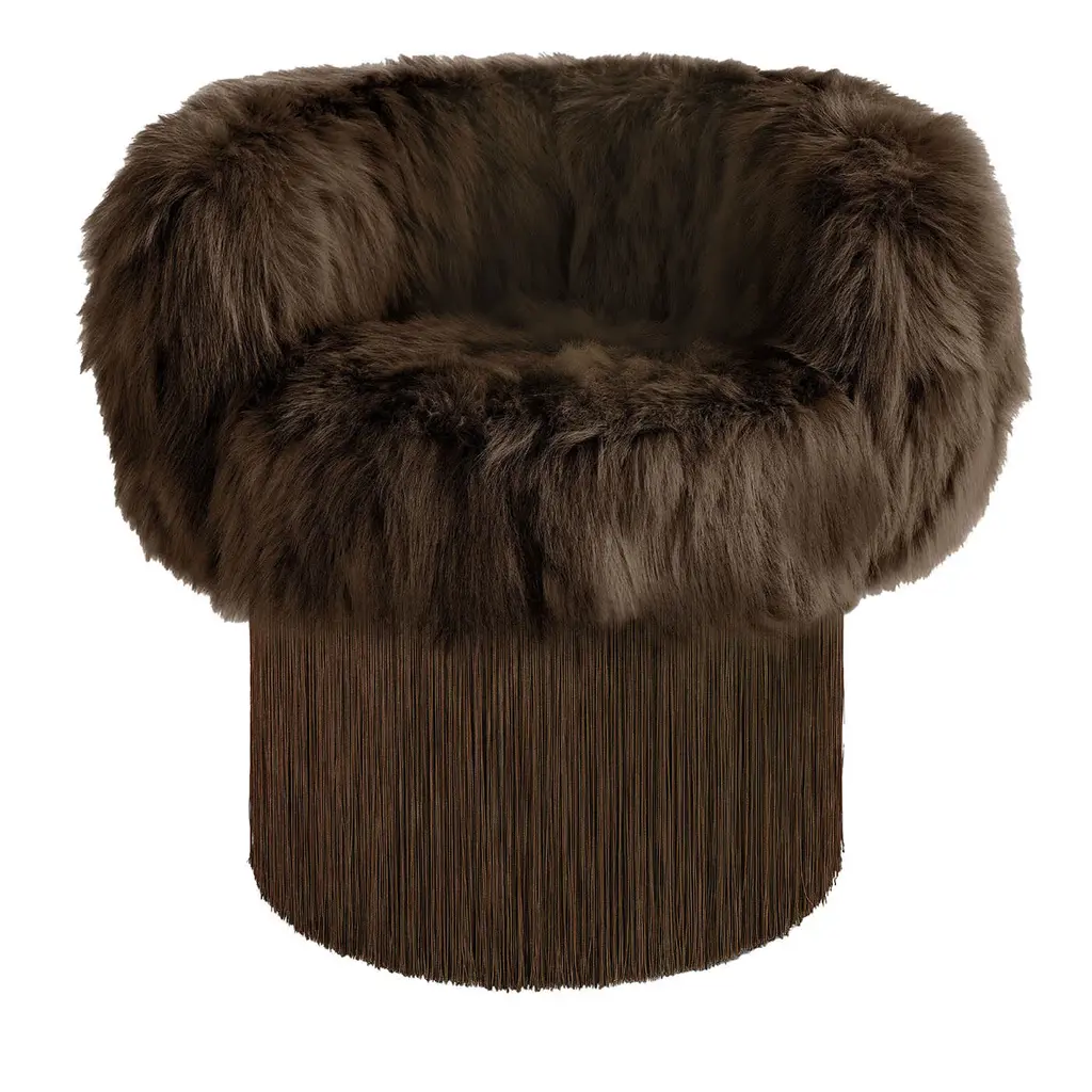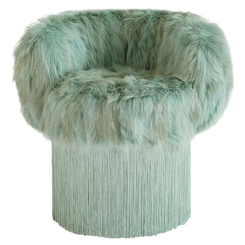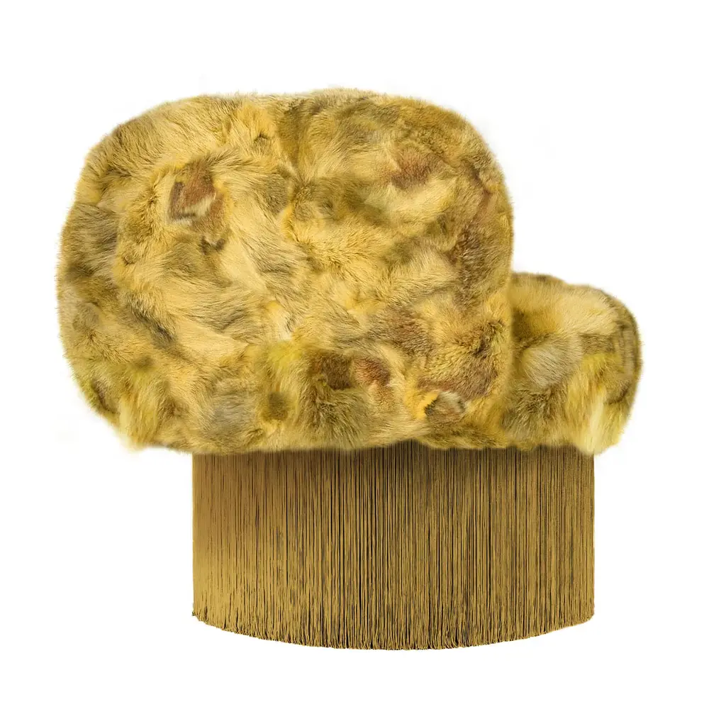 Lorenza Bozzoli Couture presents a limited-edition collection characterized by an extremely soft design, eclectic and distinctly retro. The new Fur Collection offers the Couture iconic pieces in a furry version with colours inspired by the seventies and sophisticated fur upholstery that emphasize the enveloping and smooth shapes for a cocoon effect. Pirouttes armchair in patchwork of yellow coyote fur, warm, soft and fluffy. Each bespoke piece is stamped on the bottom of the pouf’s lining and personally signed, numbered, and dated by designer.