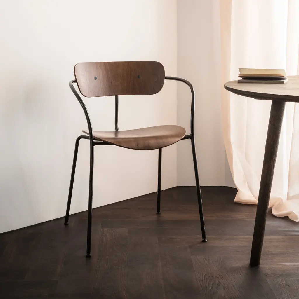 Andersen & Voll first conceived this stackable armchair for a commission to design group seating at Copenhagen's historic Langelinie Pavilion, overlooking the waterfront and the iconic Little Mermaid. "The Pavilion Chair has an airy feeling, with slim arms and legs that give it a light appearance," explains Voll. "A softer aesthetic in a curvaceous silhouette that's barely there." With its black steel frame and lacquered wood seat and backrest in oak, blackened oak or walnut, it's an uncommonly attractive and yet reliably functional choice for homes, offices or hospitality settings.