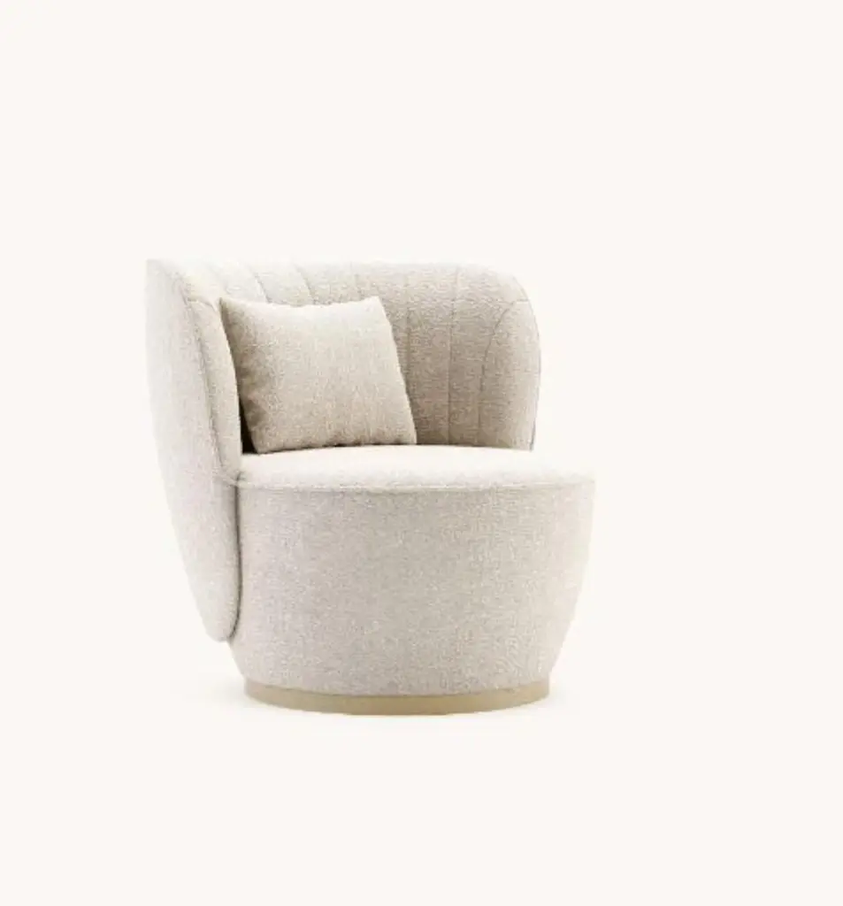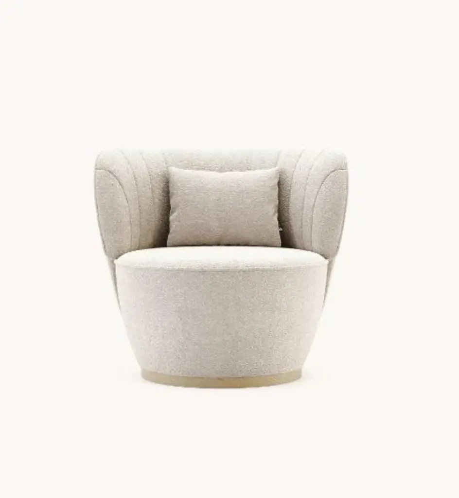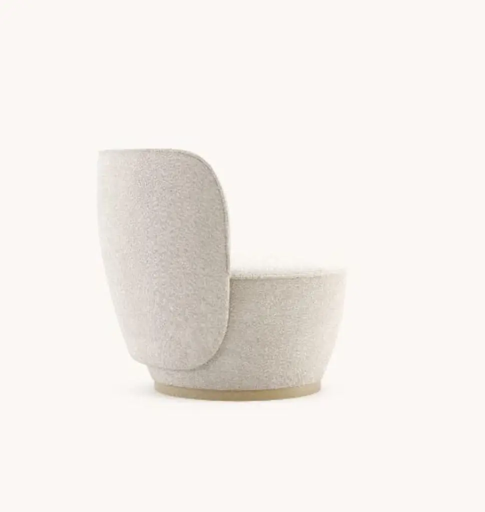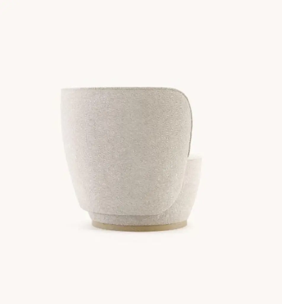 Pearl armchair by DomkapaMaterials: Natural Ash, Bouclé. Dimensions: W 88 x D 82 x H 78 cm. Also available in different materials. Please contact us.Pearl armchair holds an exclusive language for its peculiar design. With a deep convex back, this piece presents a big and round seat to provide all the comfort you need. The inner part of the back includes several lines stitched across the piece, is a perfect combination of durability, ergonomics, and style. A small pillow is included with this armchair to make sure to have all the lumbar support you need. This statement piece with a metallic base will give the sense of romance you didn’t know your project needed.Domkapa holds a tremendous passion for detailed stitching, presenting several similarities to the haute-couture philosophy focused on the value of a “made by hand”. Based in Portugal, Domkapa was founded in 2009 as a Private Label. The long and fruitful path, full of experience and achievements inspired the brand’s new identity and independence, in 2017.Domkapa challenges its team to create the perfect daily meeting between design and comfort in each piece of the brand’s collections. Our design team works side by side with the production, and this organic synergy allows the creation of innovative designs.