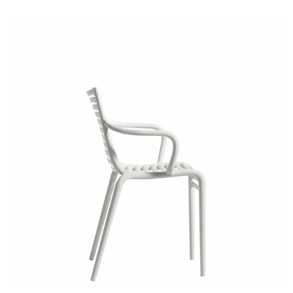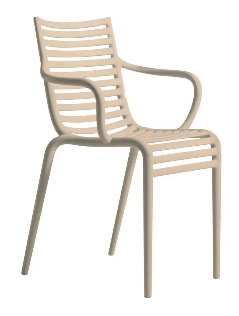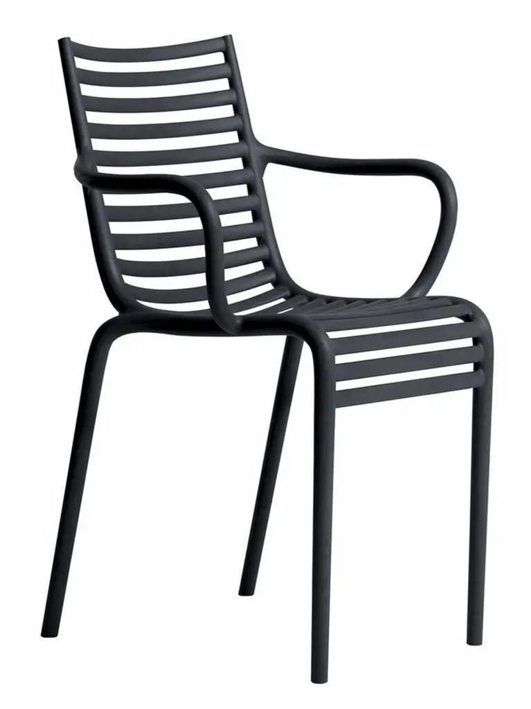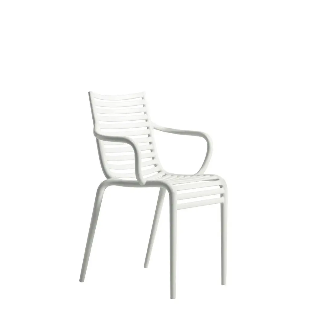 "PIP-e" is a stackable armchair, designed by Philippe Starck and manufactured by Driade, in polypropylene monobloc available in carnation, lavender gray, white or dark gray colors. Indoor and outdoor use. Packing unit is 4 pieces of the same color. White and dark gray versions only are available in quick ship.DIMENSIONS:D. 20.6", W. 21.4", H. 32.6", Seat H. 18.5"Even a classical piece of design such as the railed chair gets a particular look thanks to Philippe Starck. The sequence of horizontal elements creating the seat and the back definitely takes a strong chiaroscuro effect on and surprisingly goes on and follows the inner curve of the knees.PHILIPPE STARCK is an internationally acclaimed French creator, designer and architect. His profound comprehension of contemporary mutations, his determination to change the world, his anticipatory concern for environmental implications, his love of ideas, his desire to defend the intelligence of usefulness and the usefulness of intelligence have accompanied one iconic creation after the other.From everyday products such as furniture and lemon squeezers to revolutionary mega-yachts, individual windmills, electric bikes or hotels and restaurants that aspire to be wondrous, stimulating and intensely vibrant places. This untiring and rebellious citizen of the world, who considers sharing his ethical and subversive vision of a fairer planet as a duty, creates unconventional places and objects whose purpose is to be “good” before being beautiful.Philippe Starck and his wife, Jasmine, mostly live on an airplane or in “middles of nowhere”.