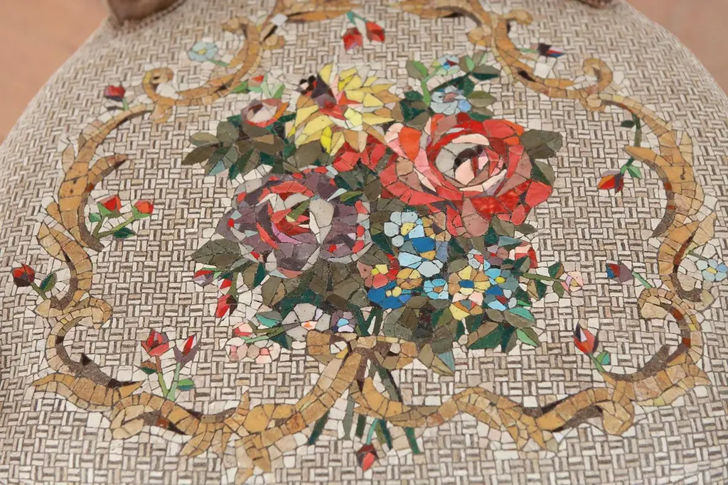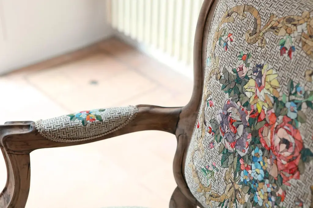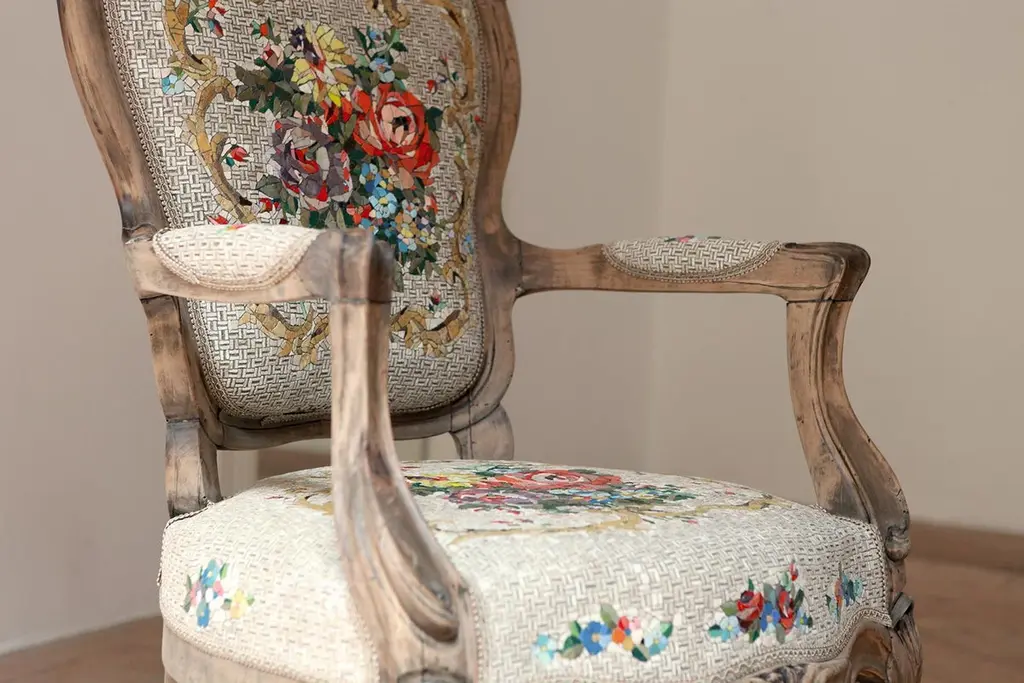 Poltrona Bouquet Antique armchair by Yukiko Nagai.Dimensions: D65 x W61 x H98 cm.Material: Marble(Biancone etc.), Natural stone, Venetian color glass, Styrofoam,Glass fiber, Resin, Cement, StuccoWeight: 20 kg An antique French chair, with a seat made out of mosaic.A fantasia of ancient floral bouquets on fabric.Small marble tiles shape the "stone fabric”, creating a smooth flow to the point of making the surface to look like a fabric.To the eyes, it looks like a soft pillow, but once touched or sit on it, it turns out as a mosaic.All pieces are handmade, so the colours and shapes of the patterns may vary. The chair used in this piece is a one-off antique. The price of the artwork may vary depending on the price of the chair.Born in Niigata (Japan) in 1981, she graduated in Environment Design at the Tama Art University.She moved to Italy, to study the mosaic at the Academy of Fine Arts in Ravenna.The concept behind her body of work, is to reproduce with mosaic the textures of different kinds of material.Through the use of mosaic, she re-enacts the appearance and volume of wood or fabric, briefly deceiving the viewer's eye which, once touched the work, realizes it’s not what it seemed to be. This creates a particular kind of “imbalance” between what the viewers feel and what they see, creating surprise and amusement — the latter being a very important element, that must be present in the work.