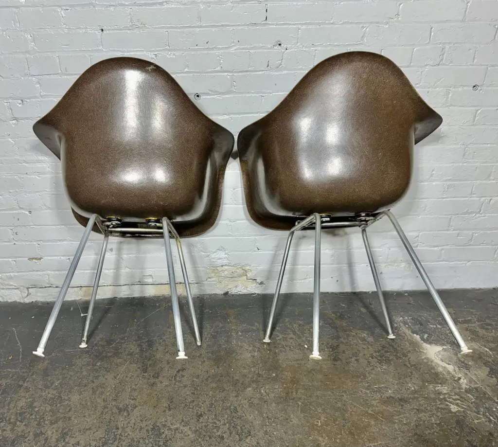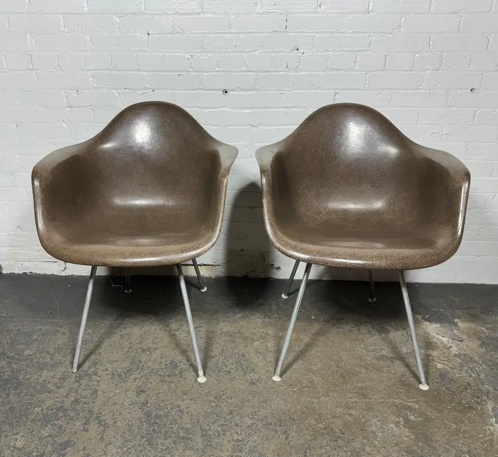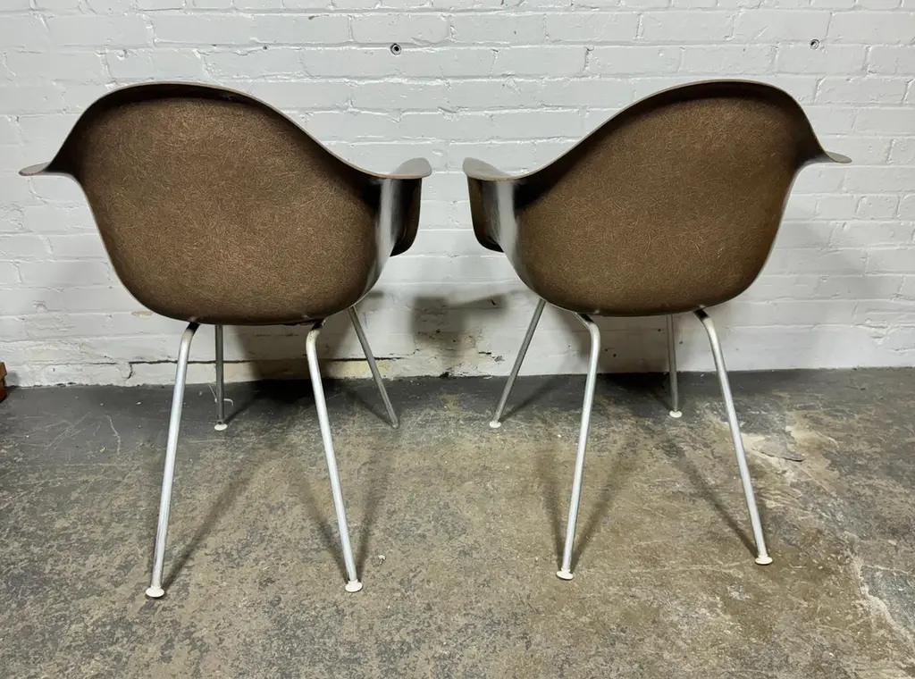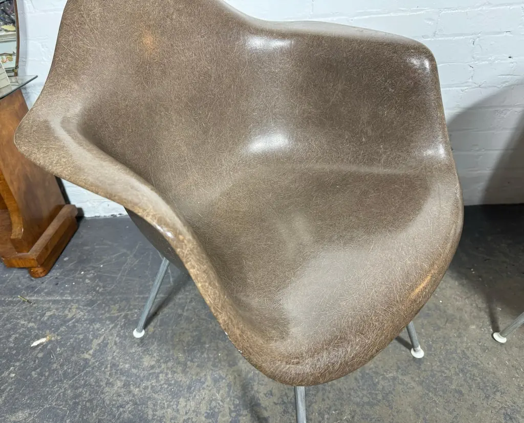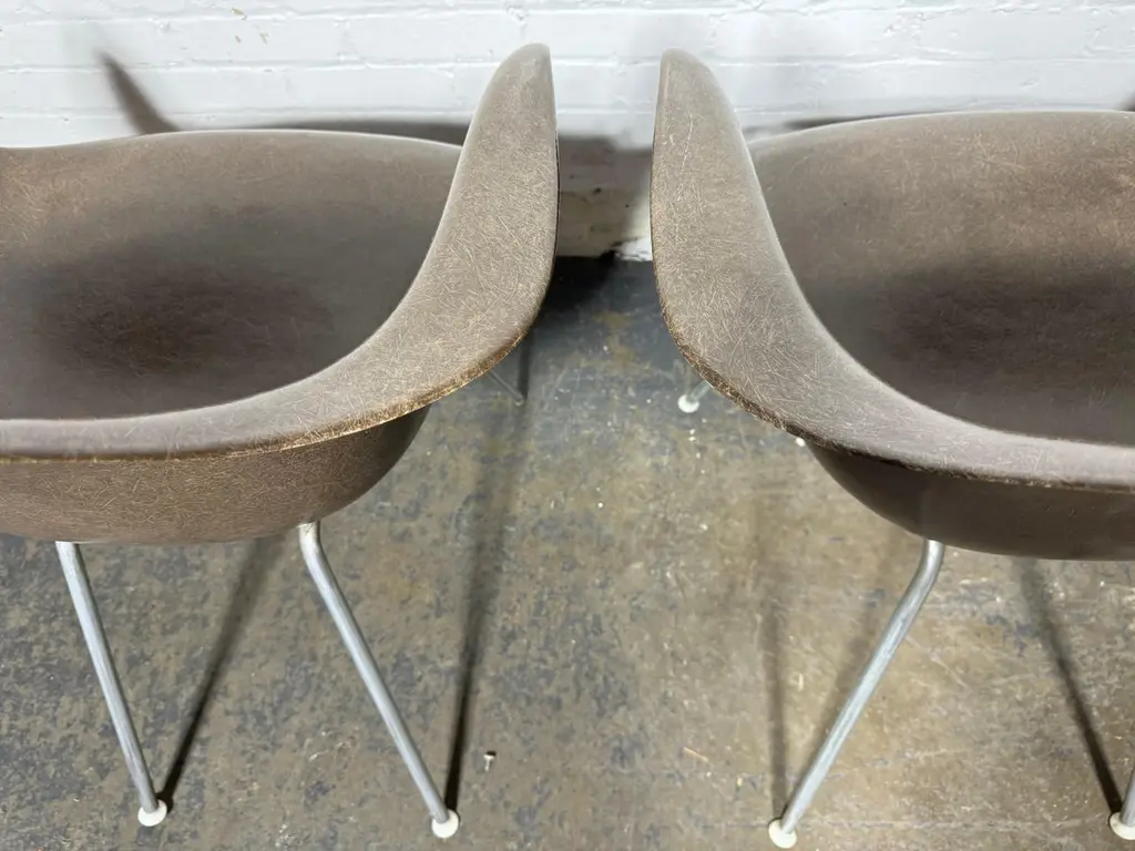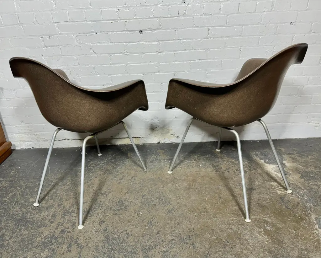 Matched Pair of late 1950s early 60's Charles & Ray Eames Dax Fiberglass Shell Armchairs// Unusual (seldom seen) Tan Dark color,,,Nice original condition,Exposed fibers, nice gel-coat.Classic Modernist design,, ^^^^PRICED PER CHAIR ! h x 24.5 w x 23.5 d Arm rest 25 Seat 18