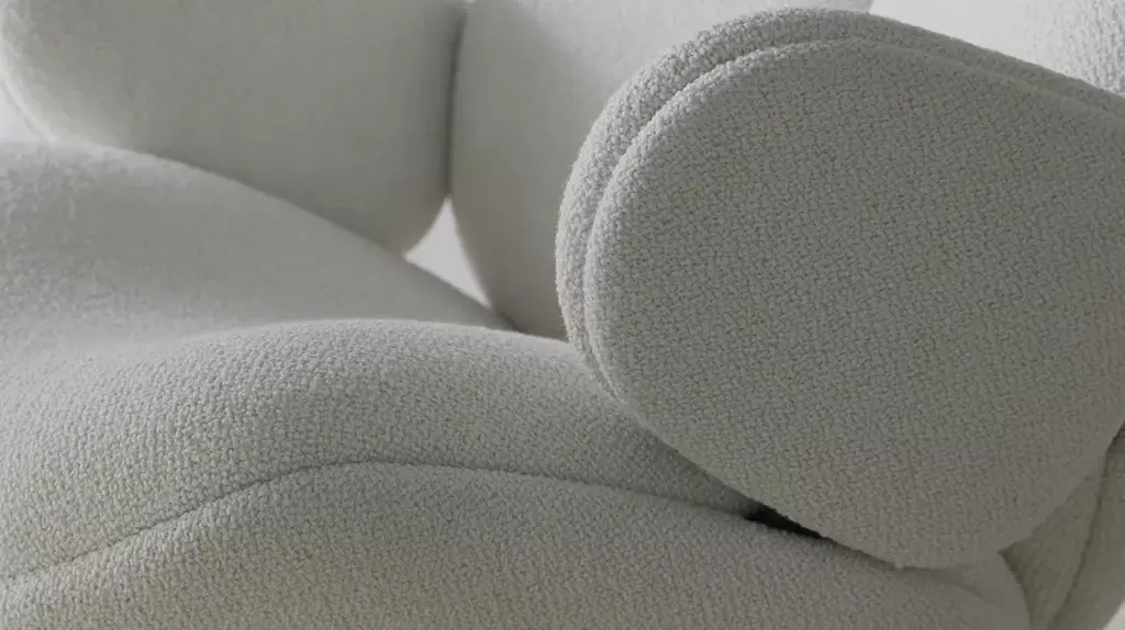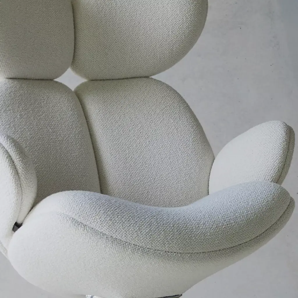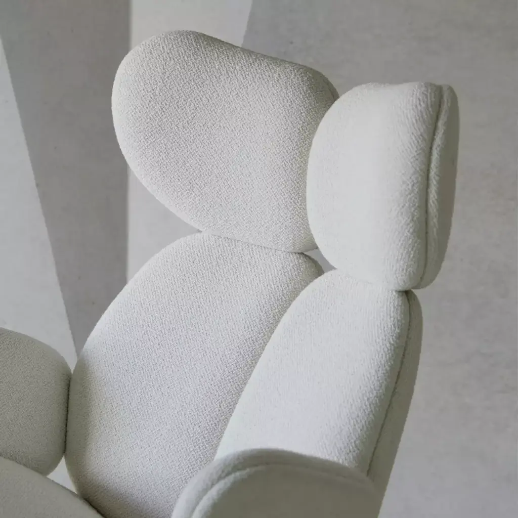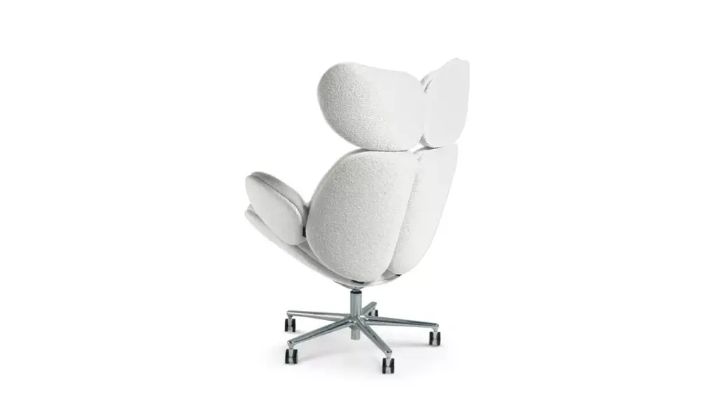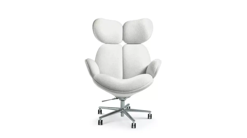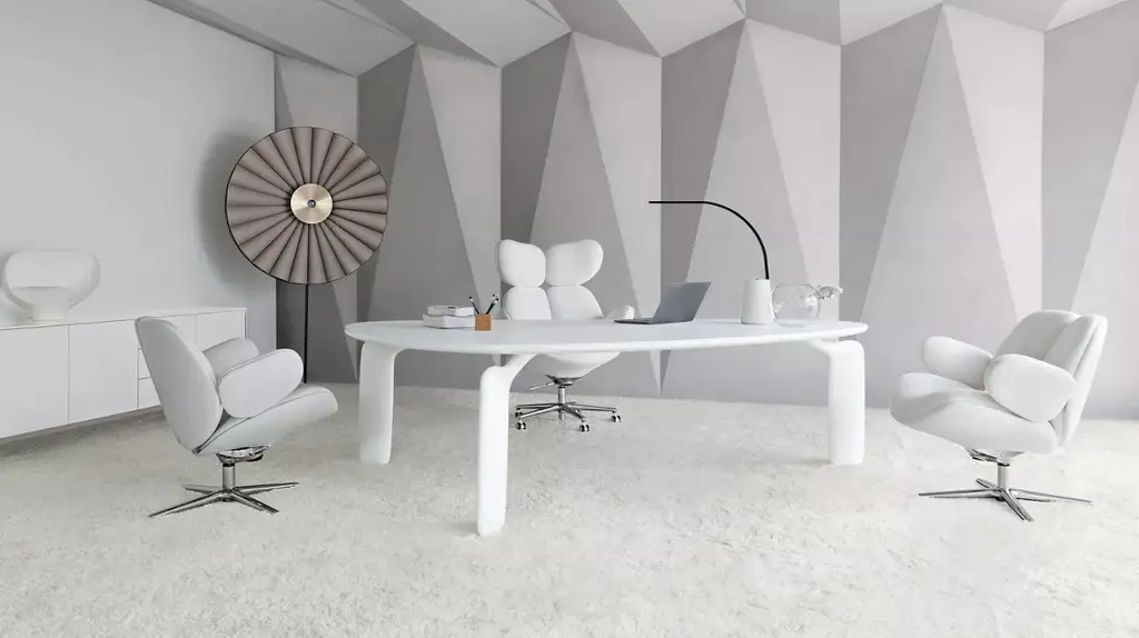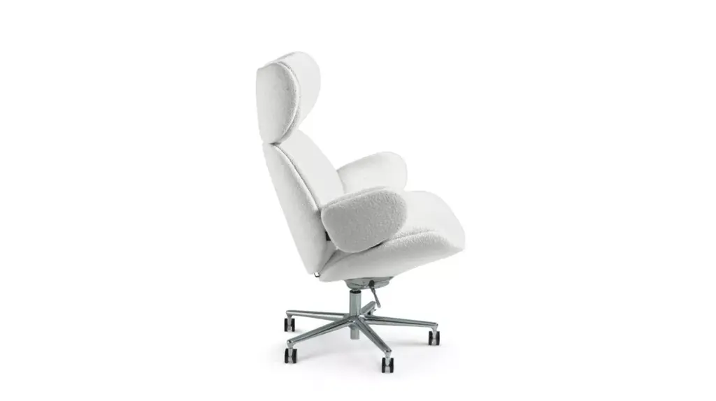 PULP is the first collaboration between Catalan designer Eugeni Quitllet and Roche Bobois: a collection of tables, chairs, and armchairs with a biomorphic aesthetic where straight lines are absent, enhanced by refined finishes. Inspired by living forms, the collection is built around the principle of dissociation: the designer imagined each piece of furniture as an assembly of molecules! This version with a wheeled base and a lever mechanism to adjust the seat height provides a generous armchair for those who enjoy working as comfortably as in a lounge. It stays true to this multi-cellular logic, with its headrest boldly asserting its duality.