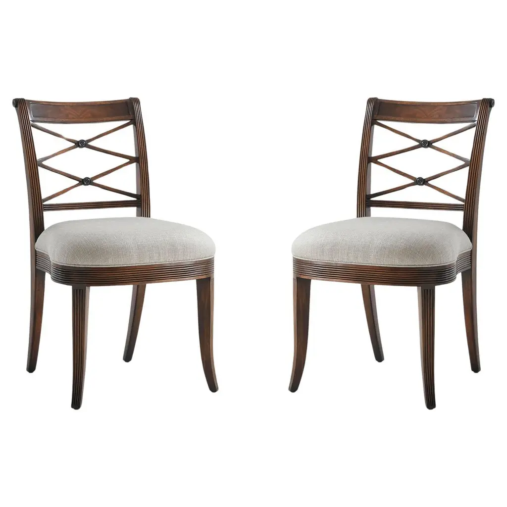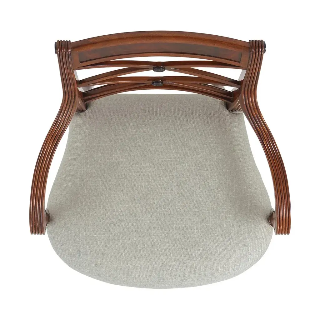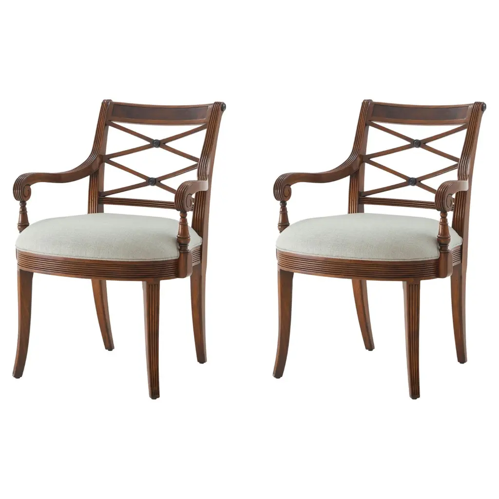 Two hand-carved armchairs with reeded decoration, the over scroll and double ‘X’ pierced back above an upholstered seat, on sabre legs. Dimensions: 24" W x 23.5" D x 34" H Seat height - 19" Arm height - 25" Shown in Draper Performance-UP5409 Fabric