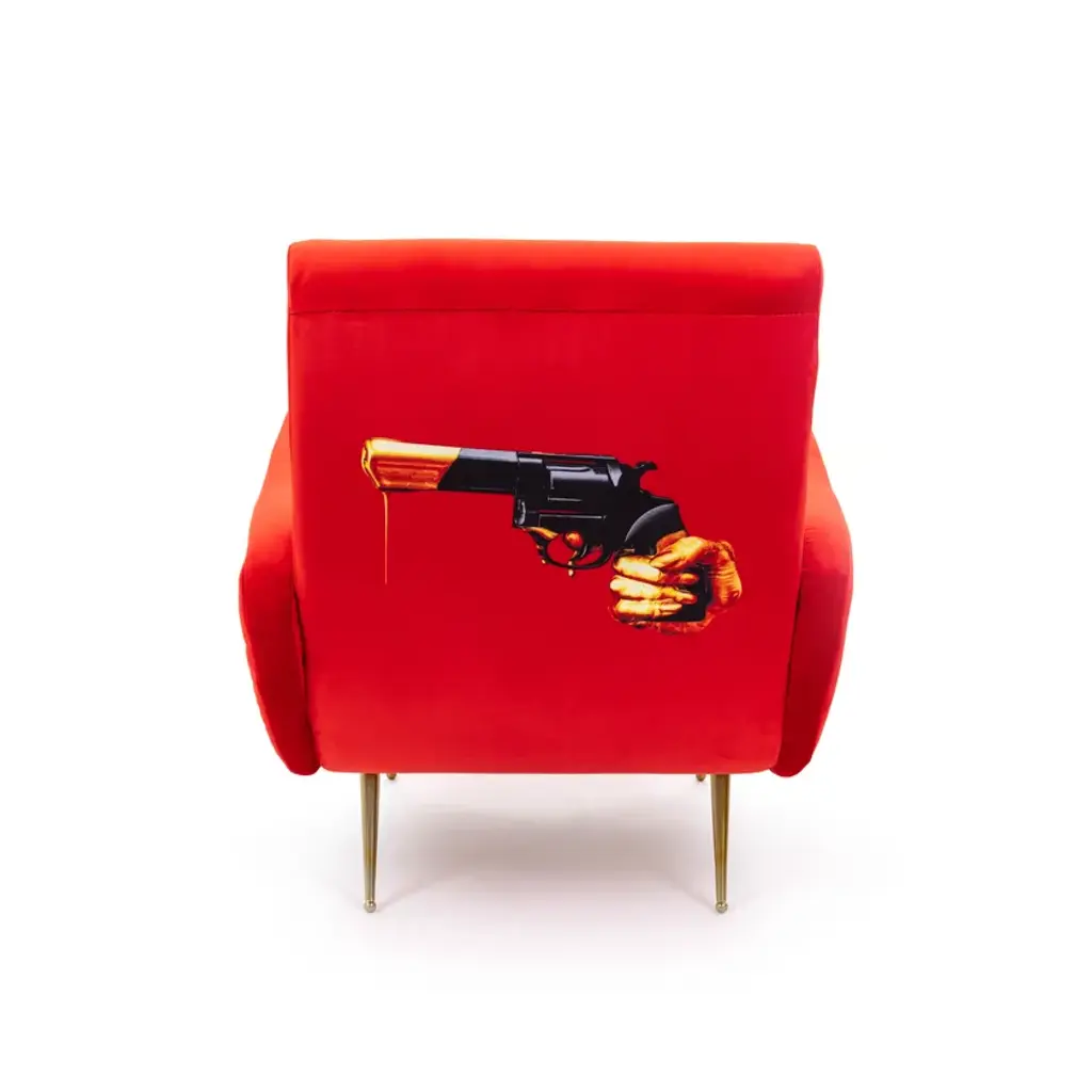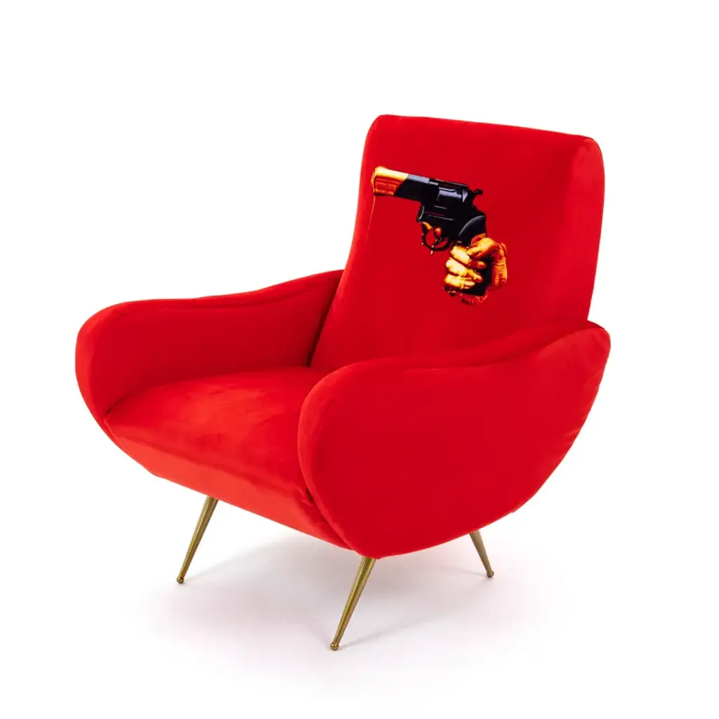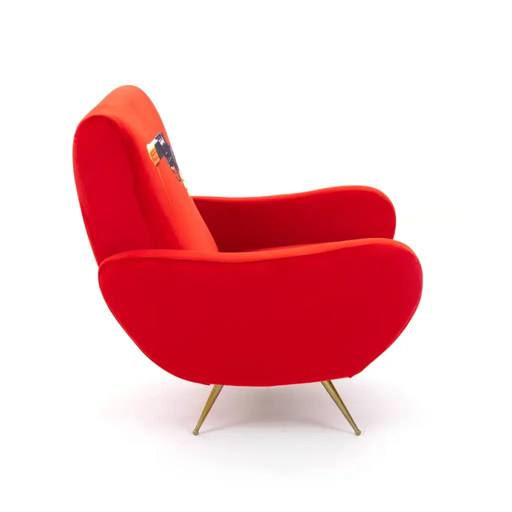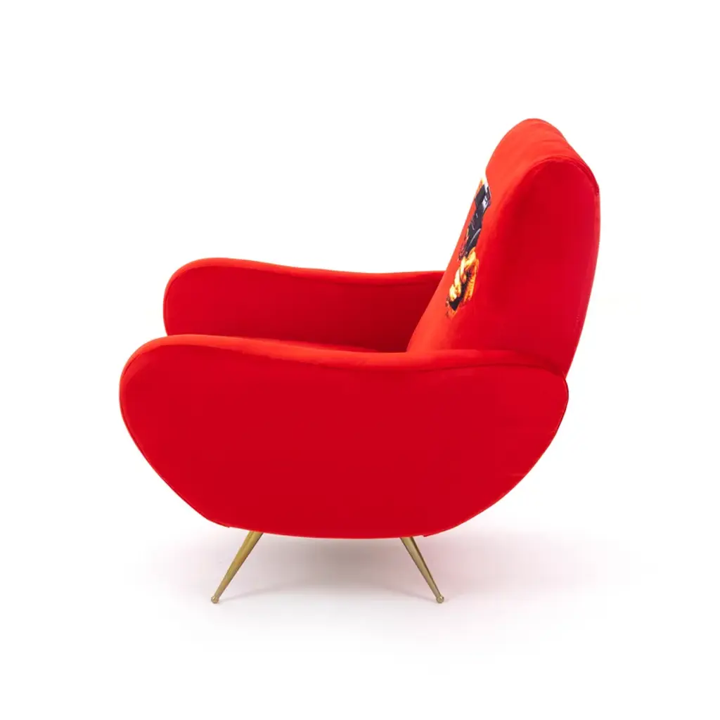 The traditional design of these 1950’s style seats are upholstered with unexpected surreal images. The images of the TOILETPAPER magazine invade furniture and become comfortable objects to relax in – not only for art lovers’ homes.ArmchairMaterial: Fabric in polyester, Structure in wood, polyurethane and metal