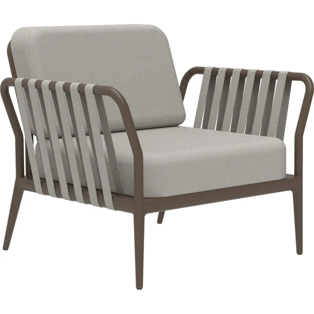 Ribbons Bronze armchair by MOWEEDimensions: D83 x W91 x H81 cm (Seat Height 42 cm)Material: Aluminum, UpholsteryWeight: 20 kgAlso Available in different colors and finishes. An unmistakable collection for its beauty and robustness. A tribute to the Valencian manufacturing tradition as a challenge to innovation, making it sustainable and durable. A collection with details that make it unique. We discover its most representative side, Ribbons. Engineering and tradition come together, thus achieving a collection with its own character.Möwee is part of the work, effort and commitment of Gaviota, a leading company in the outdoor sector. It was set up as an independent venture to broaden horizons in the outdoor furniture world, with its own distinctive character and way of doing things. Freshness, simplicity, quality and design are at the heart of its DNA.