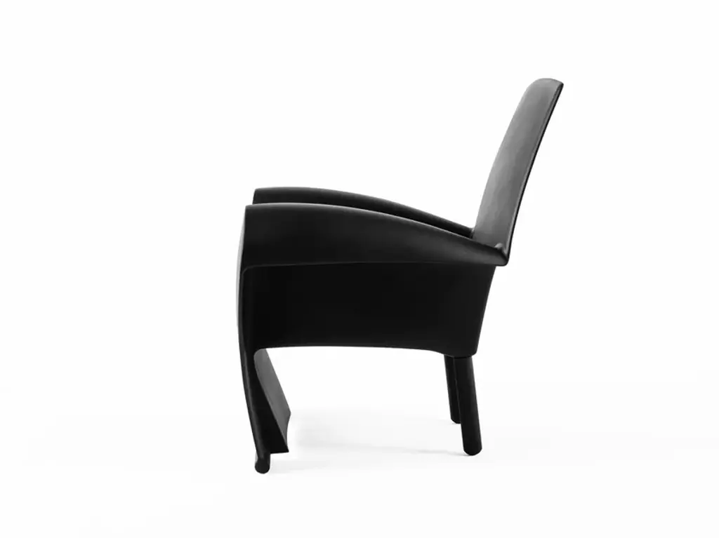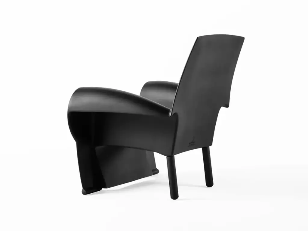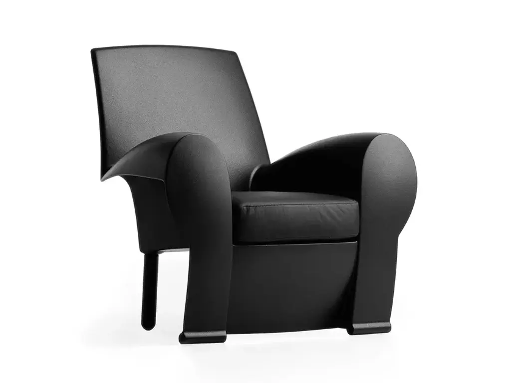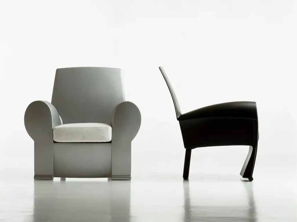 The very essence of bourgeois décor with a modern twist, the object as a mask, a technological jack-in-the-box. These are the ingredients of this highly symbolic armchair. The Richard III was created by Philippe Starck who, moved by the sight of battered old club armchairs abandoned in the street, decided to give them a new life. At this time, Starck was imagining President’s private apartment interiors in the Elysée Palace and the Richard III became President François Mitterrand’s favorite armchair.Armchair with completely molded structure in rigid structural polyurethane, painted with polyurethane enamel in matt black or metallic silver. Cushion in expanded polyurethane and dacron.