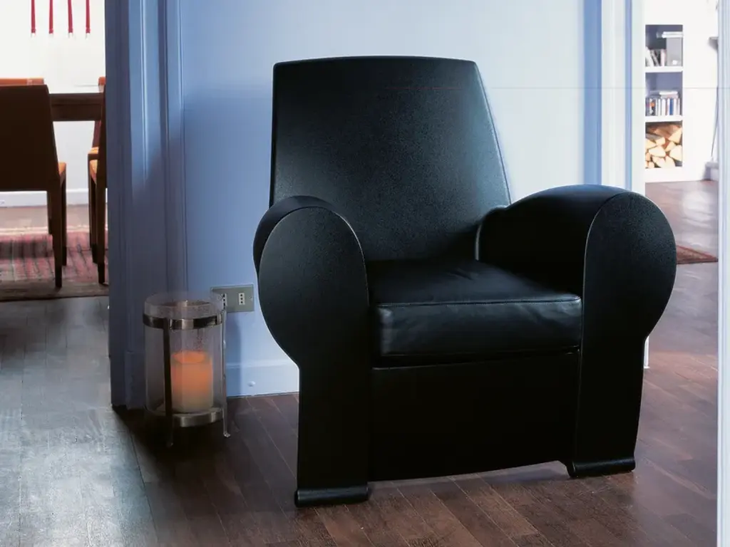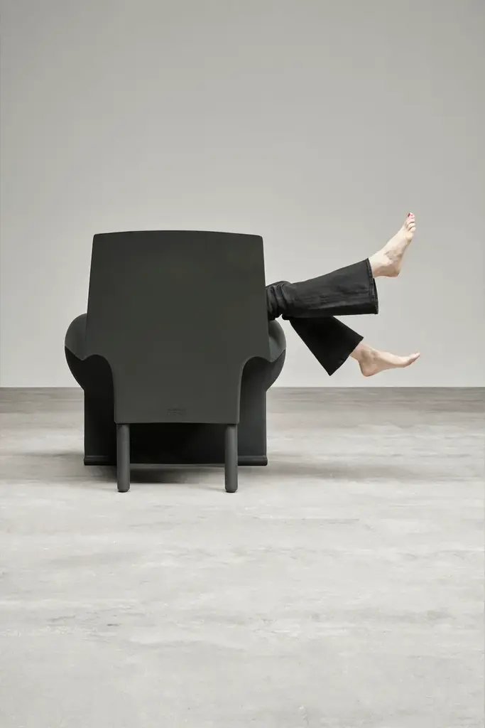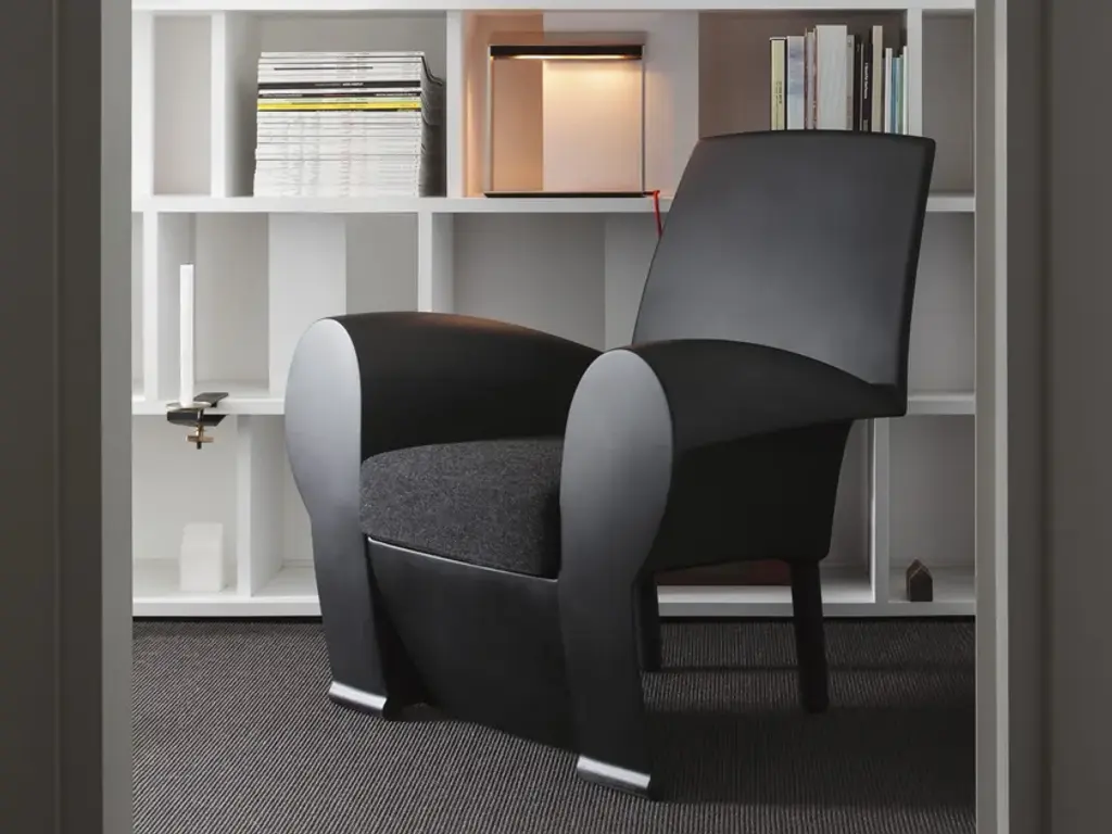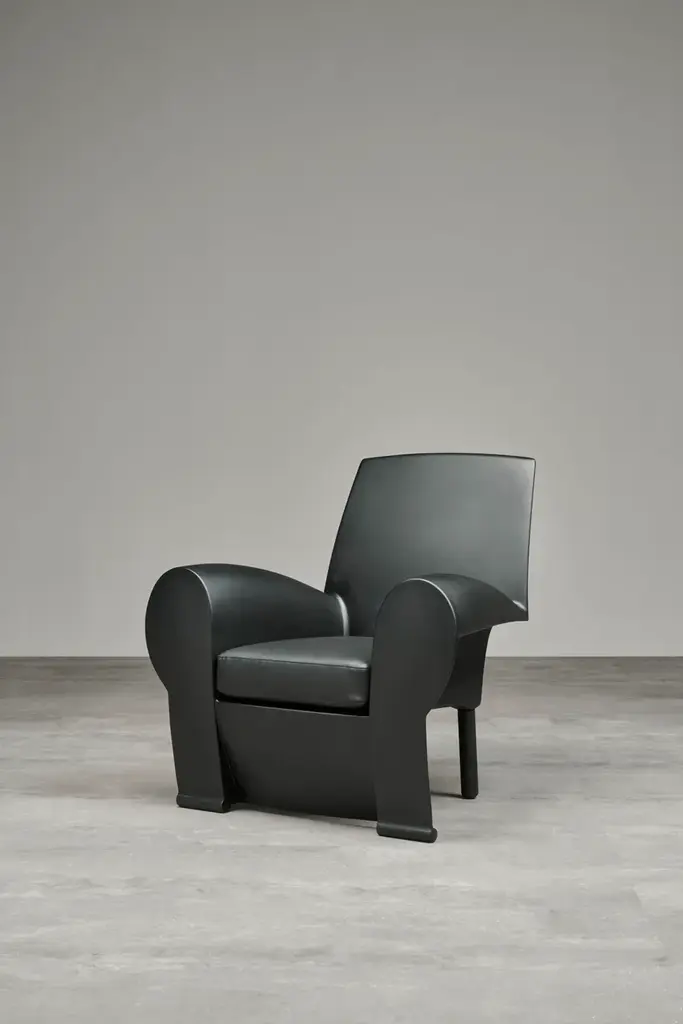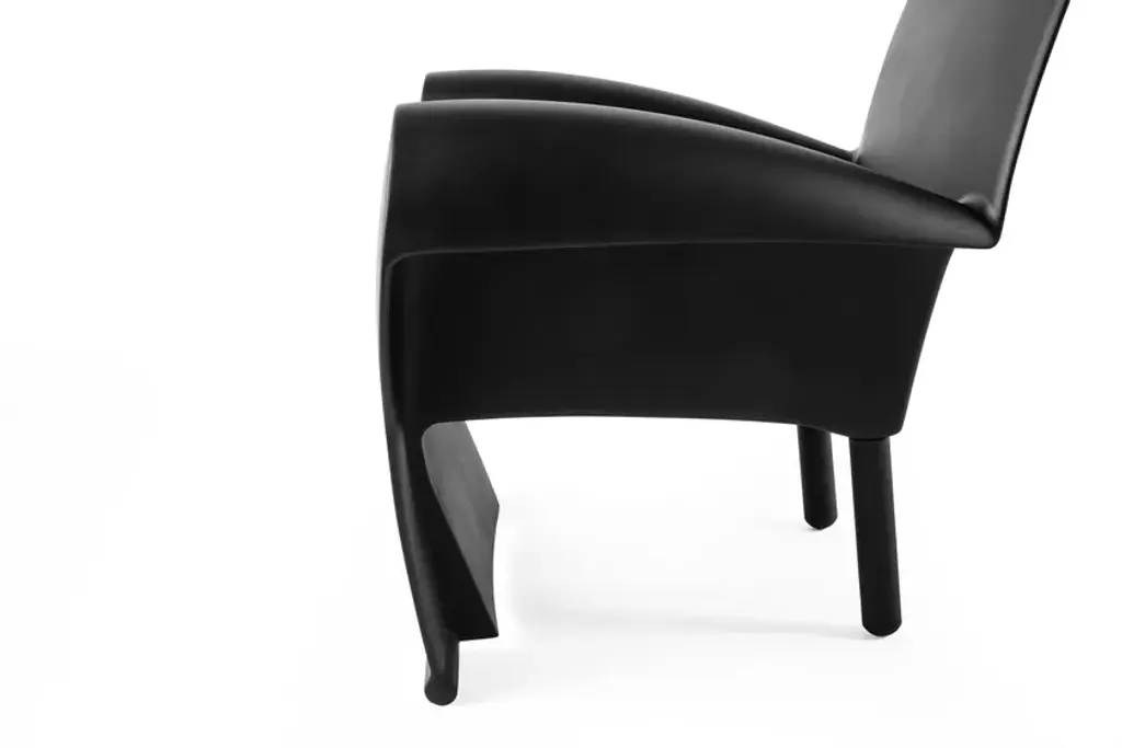 The very essence of bourgeois décor with a modern twist, the object as a mask, a technological jack-in-the-box. These are the ingredients of this highly symbolic armchair. The Richard III was created by Philippe Starck who, moved by the sight of battered old club armchairs abandoned in the street, decided to give them a new life. At this time, Starck was imagining President’s private apartment interiors in the Elysée Palace and the Richard III became President François Mitterrand’s favorite armchair.Armchair with completely molded structure in rigid structural polyurethane, painted with polyurethane enamel in matt black or metallic silver. Cushion in expanded polyurethane and dacron.