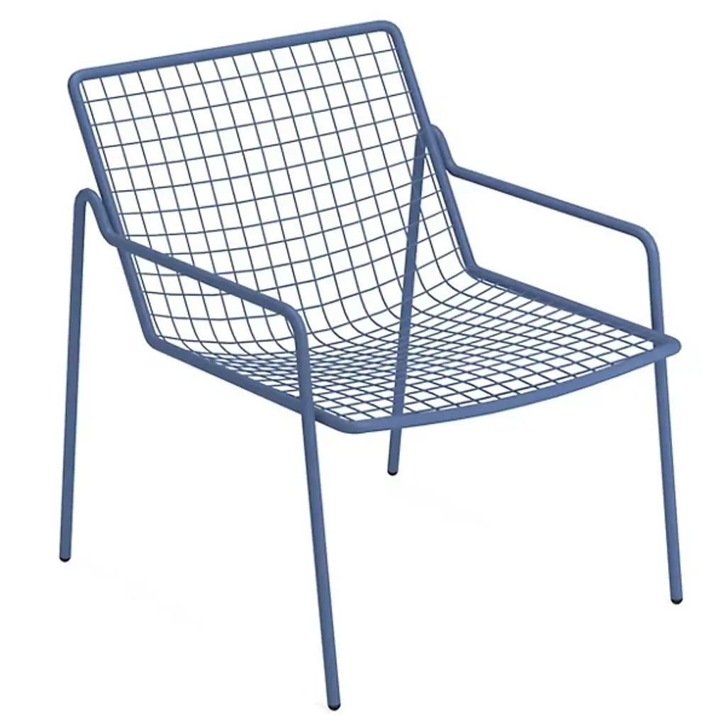 Provide an airy retro style to outer spaces with the subtle, sculptural style of the Rio R50 Outdoor Stacking Lounge Armchair from emu. An open, retro design created by Emanuel Gargano and Anton Cristell, it uses two slender steel rods bent into a compound array of legs and armrests to support an outward angled structure that comprises both back and seat, the metal powder coated for outdoor durability. An array of open grid squares comprised of slimmer steel rods creates a supportive surface, while the chairs may be stacked up to four chairs high for simple storage.