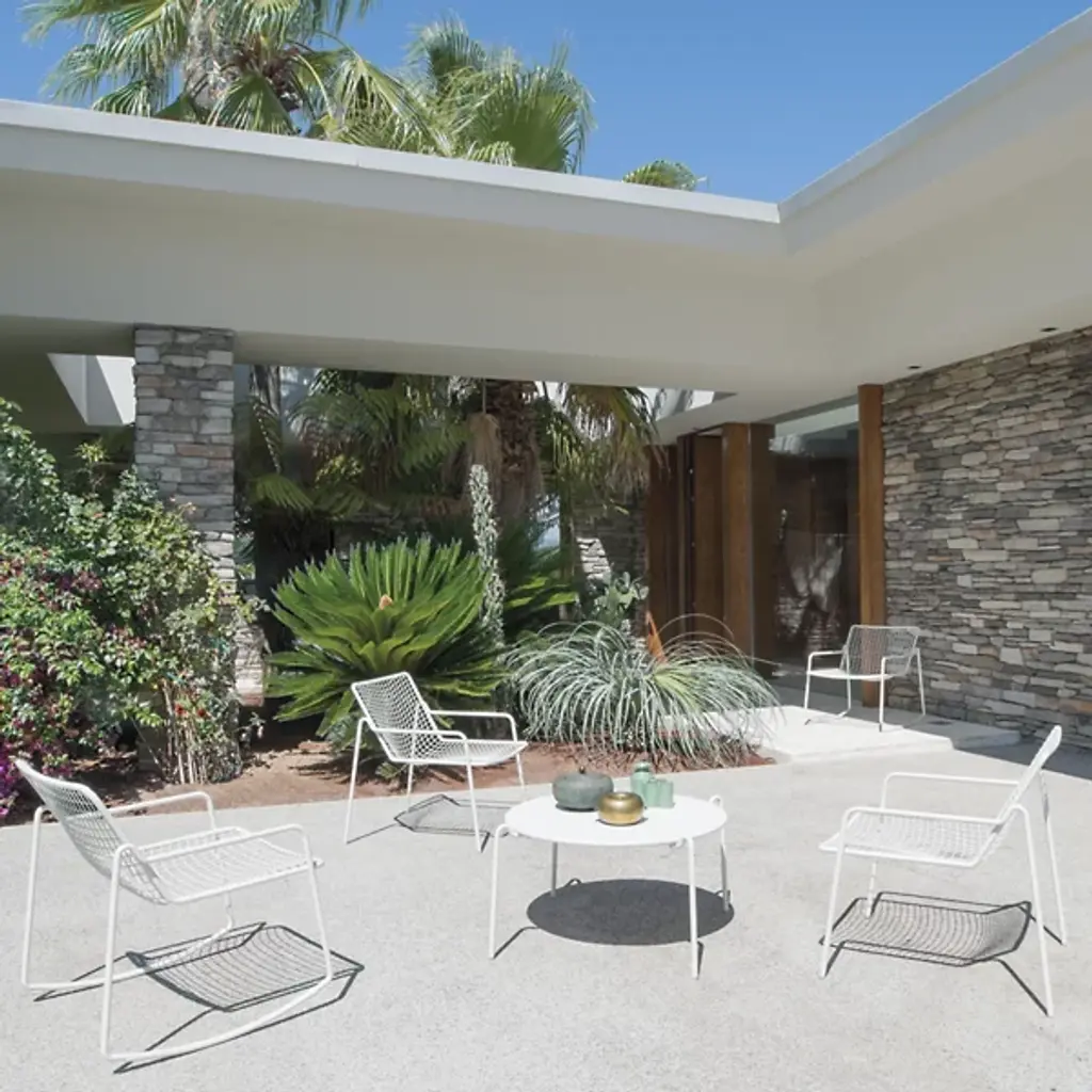 Provide an airy retro style to outer spaces with the subtle, sculptural style of the Rio R50 Outdoor Stacking Lounge Armchair from emu. An open, retro design created by Emanuel Gargano and Anton Cristell, it uses two slender steel rods bent into a compound array of legs and armrests to support an outward angled structure that comprises both back and seat, the metal powder coated for outdoor durability. An array of open grid squares comprised of slimmer steel rods creates a supportive surface, while the chairs may be stacked up to four chairs high for simple storage.