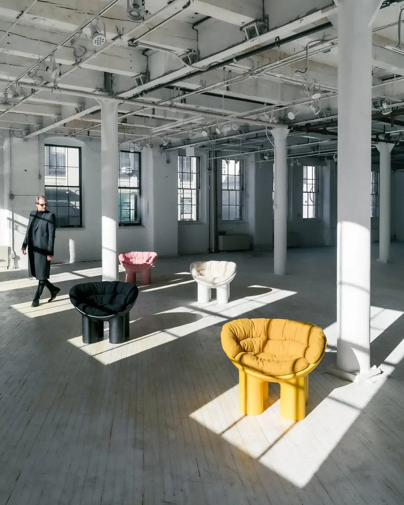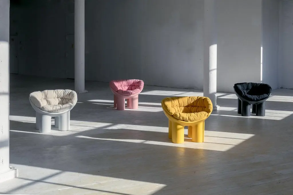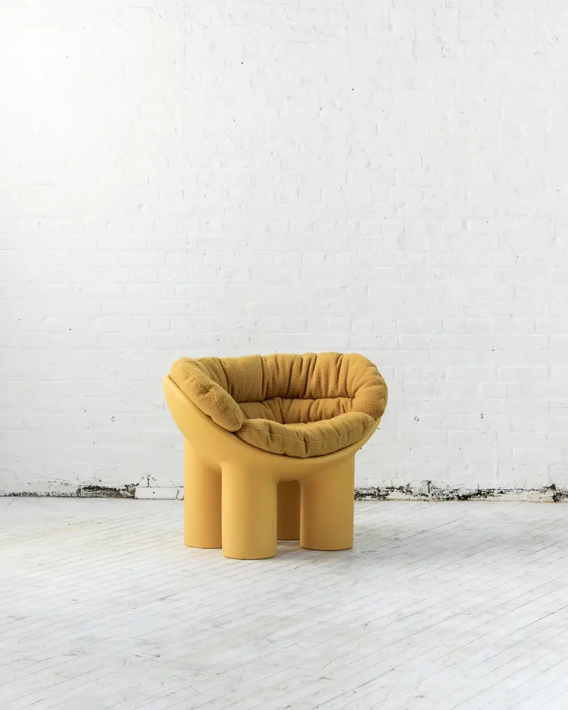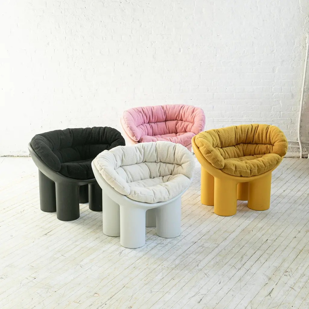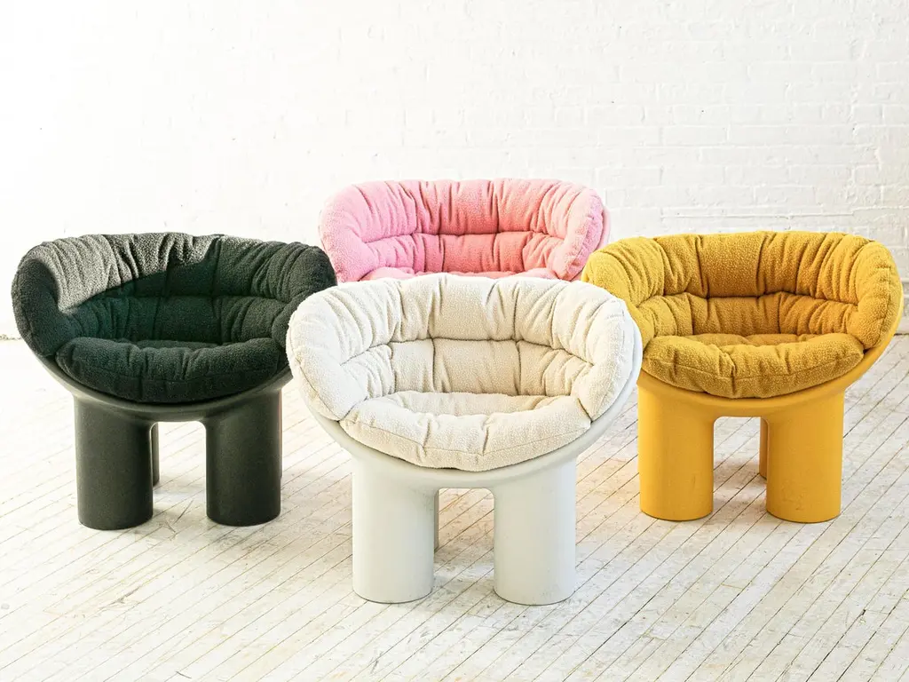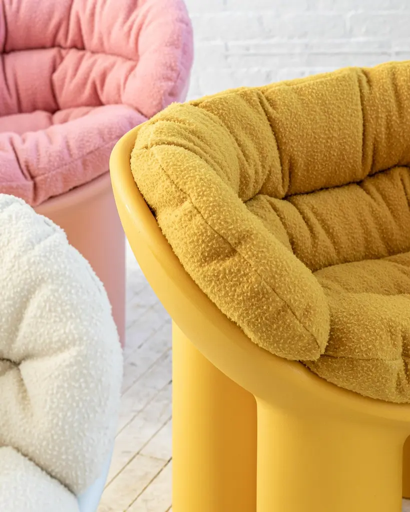 Duplex launches DUPLEX X CASENTINO. The iconic Roly Poly armchair designed by Faye Toogood and manufactured by Driade, with the exclusive cushions in the ancient Casentino cloth from Tuscany, Italy.Casentino is a rugged and compact wool fabric used since the Middle Ages tomake blankets for the animals or Franciscan friars’ cowls, because of itscharacteristic strength and durability. It then made its fortune in the 18th century,when the wool cloth became the primary product of the numerous wool mills ofthe Casentino valley.After having become a fashionable and a sought after garment in the 19thcentury, thanks to its peculiar “swirls” or “curls” and to its classic extravagantcolors, the Casentino fabric encountered the likes of personalities such as GiuseppeVerdi and Giacomo Puccini. They wore very elegant double breasted coats withhaute-couture cut.Duplex’s fascination in combining different fields and times brings now togetherthe 21st century Faye Toogood’s Roly Poly with the long-lived, nearly forgottenCasentino fabric. The collection features 4 colors: White, Black, Pink, and Yellow.Available exclusively through DUPLEX.