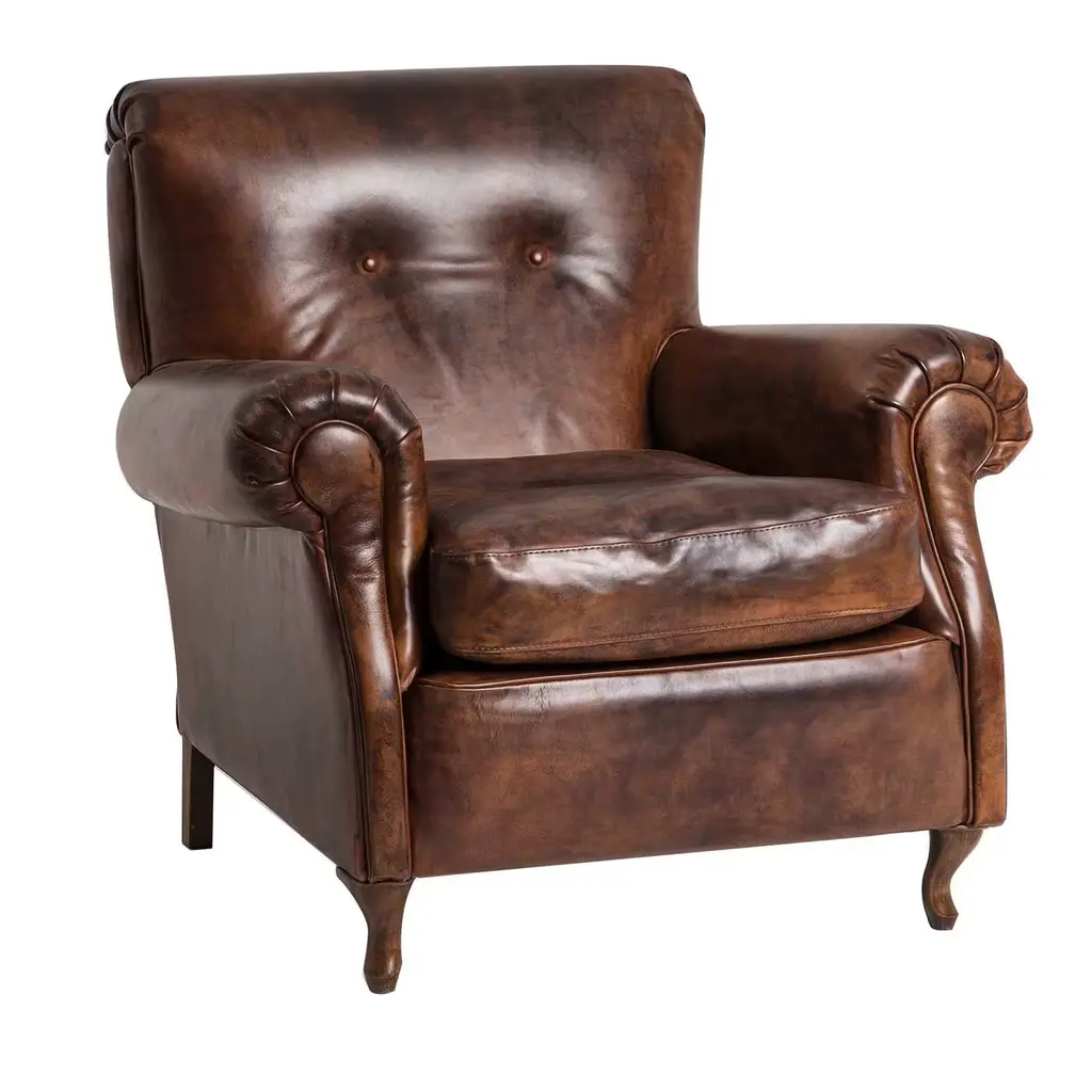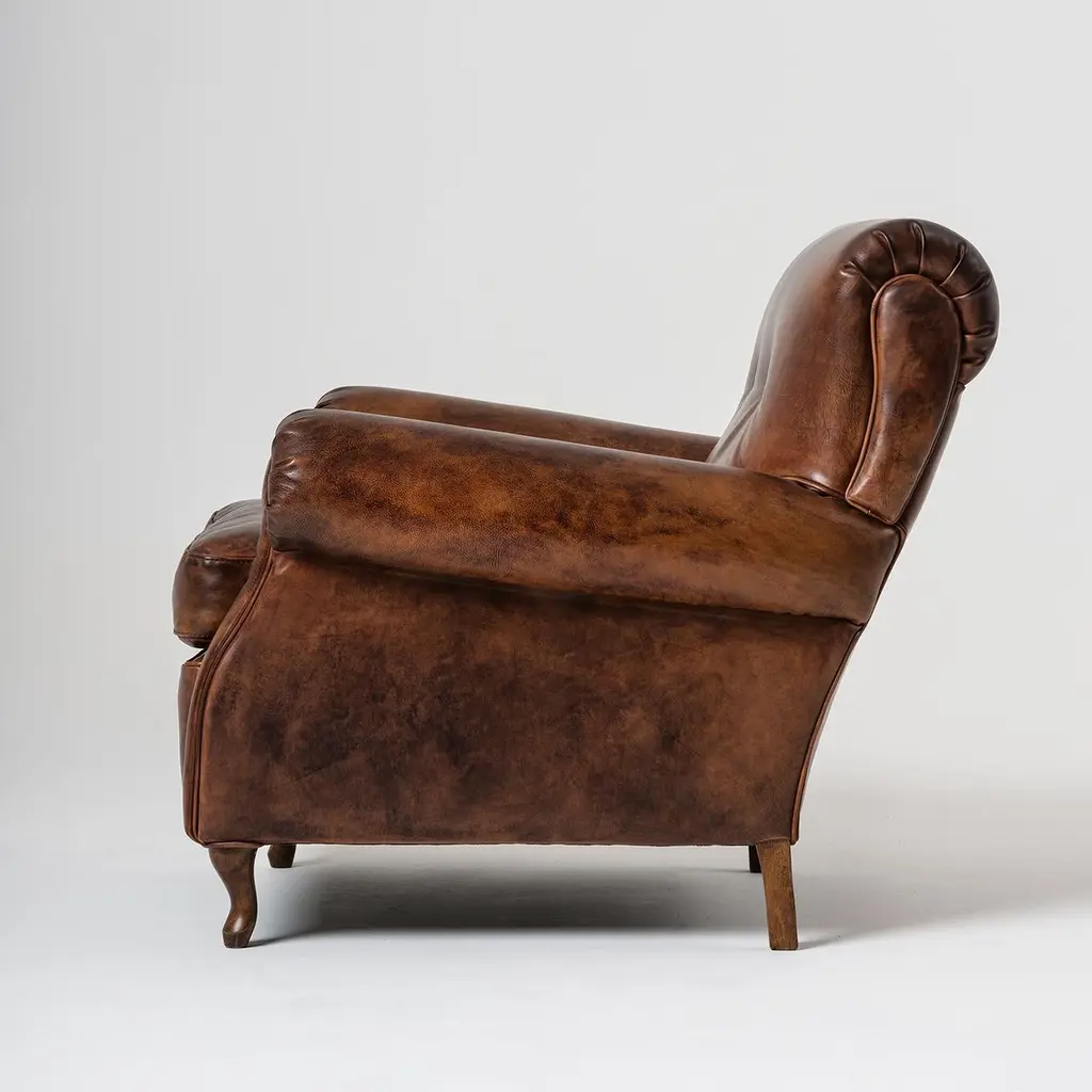 The timeless style of this armchair is suitable for any environment. The timeless shapes, the excellent comfort and the beauty of the materials make this object unique in its kind. The hand-finished natural crust leather finish and the walnut-stained beech base are precious.