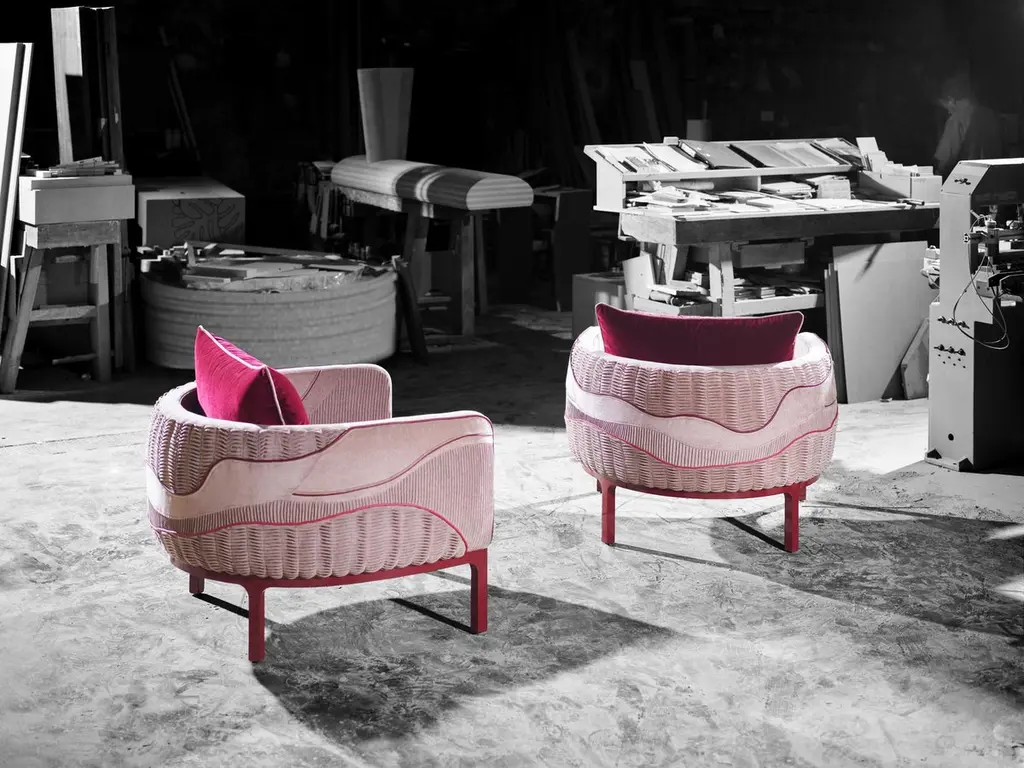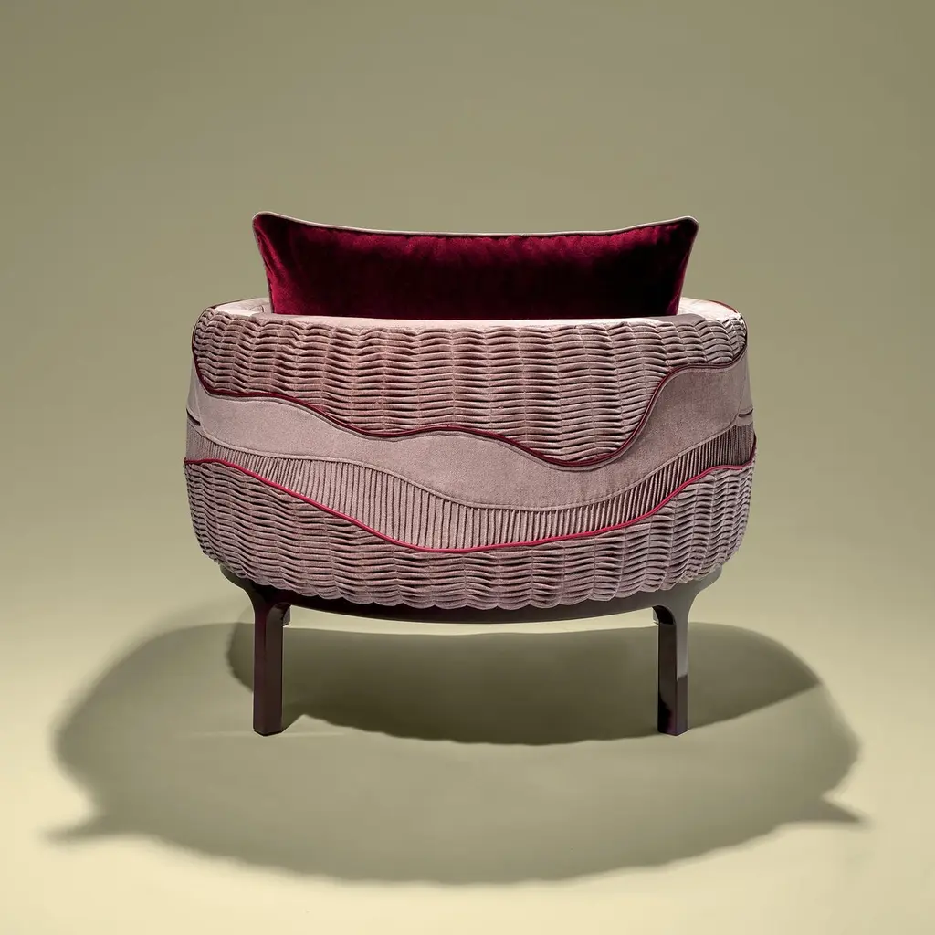 Romantic velvet armchair in pink velvet and leatherThis piece takes 360 hours to produce, handcrafted armchair with artistic intervention by Juliana Ribeiro.Bespoke / CustomizableIdentical shapes with different sizes and finishings.All RAL colors available. (Mate / Half Gloss / Gloss)