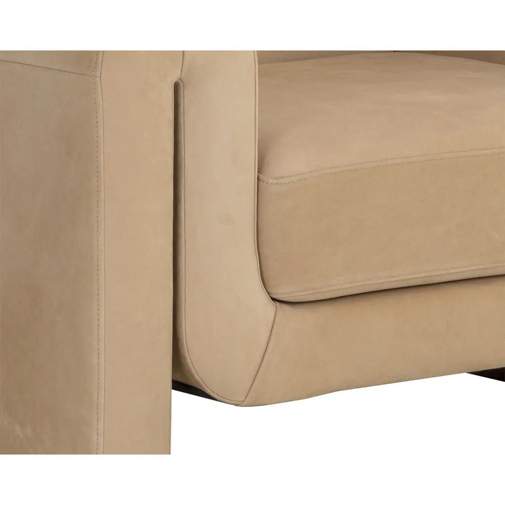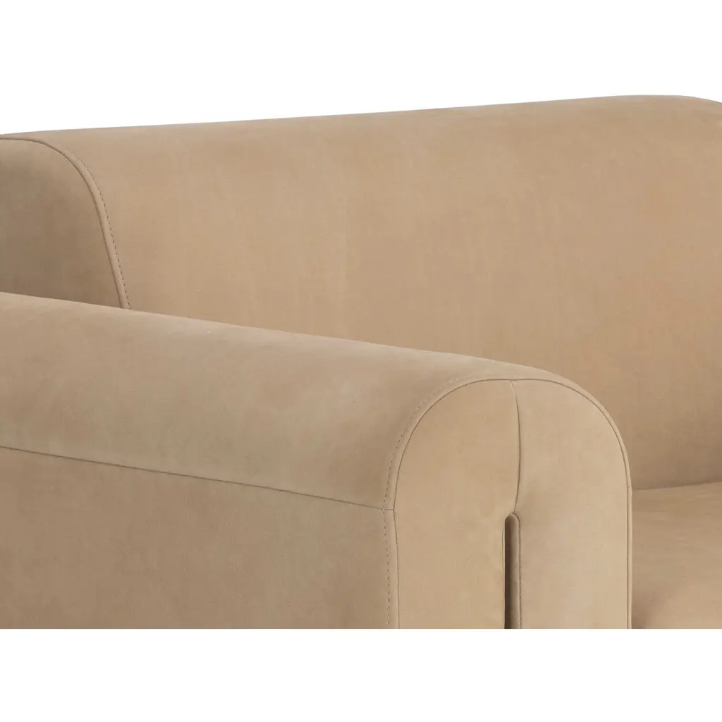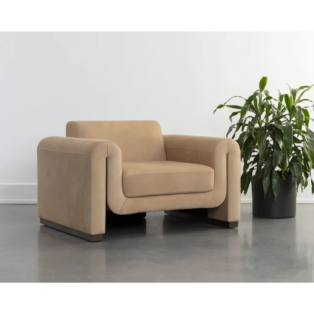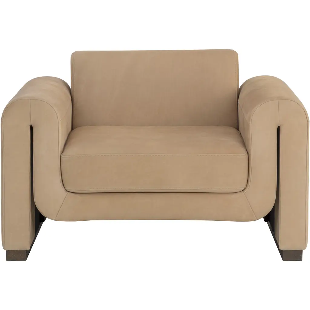 Cozy and luxuriously smooth, the Romer Armchair brings a sense of warmth and comfort to any living area. Expertly designed with sculpted curves that lend a modern aesthetic. Upholstered in nubuck tan leather with distressed brown oak wood legs. Handle with Care: This design has been crafted with 100% leather. Leather is a natural material as such, colour variations, markings, wrinkles, grooves and light scratches are acceptable and appreciated characteristics. No two pieces are alike. Visit our Product Care page for more information on how to ensure the lasting beauty of this piece.