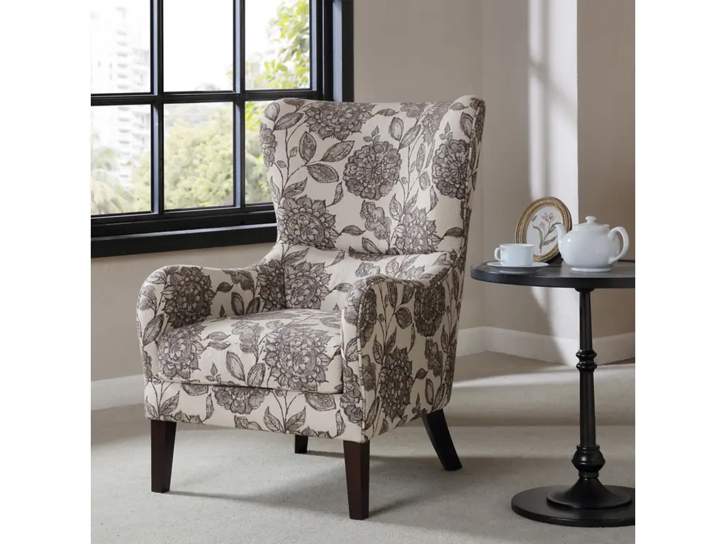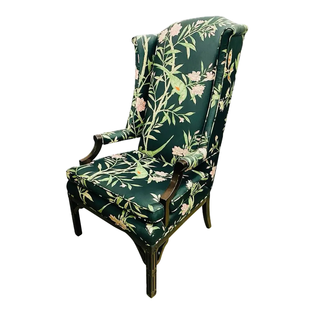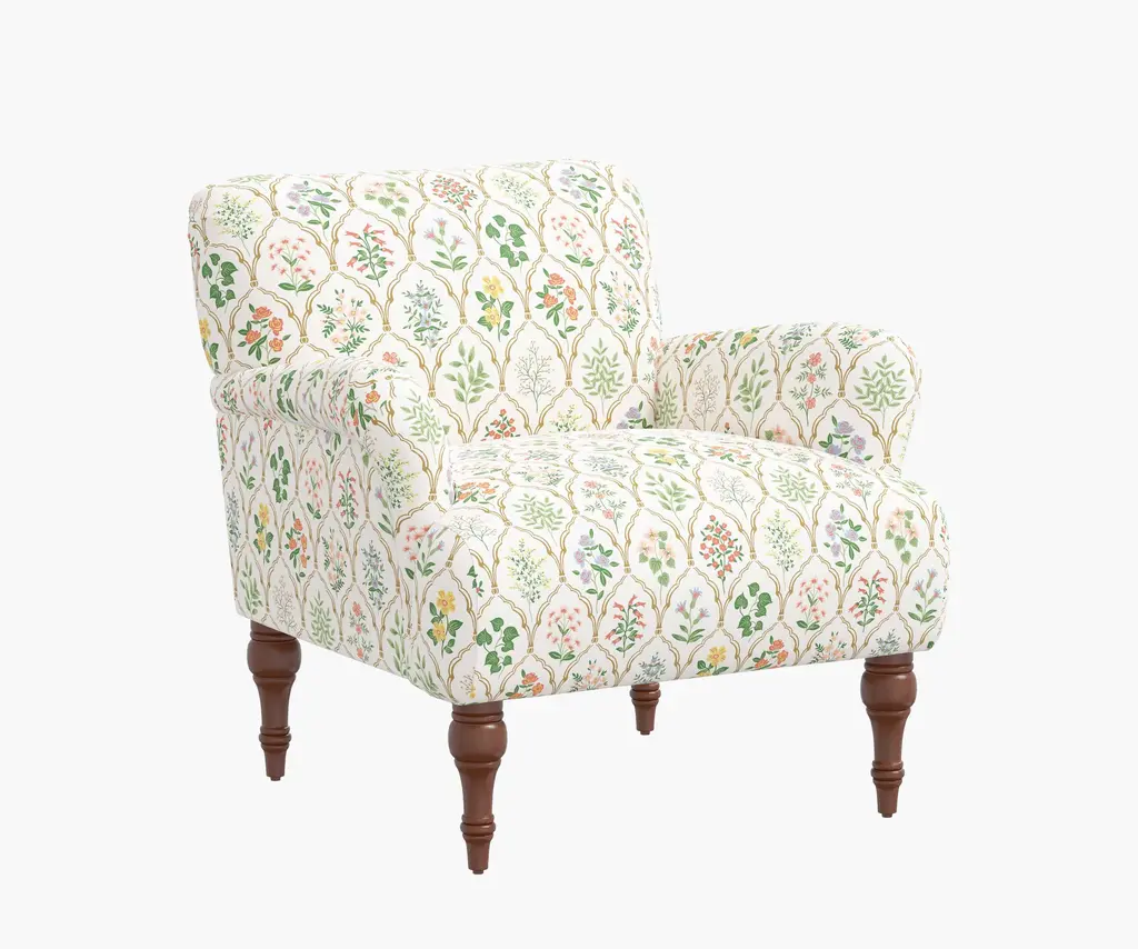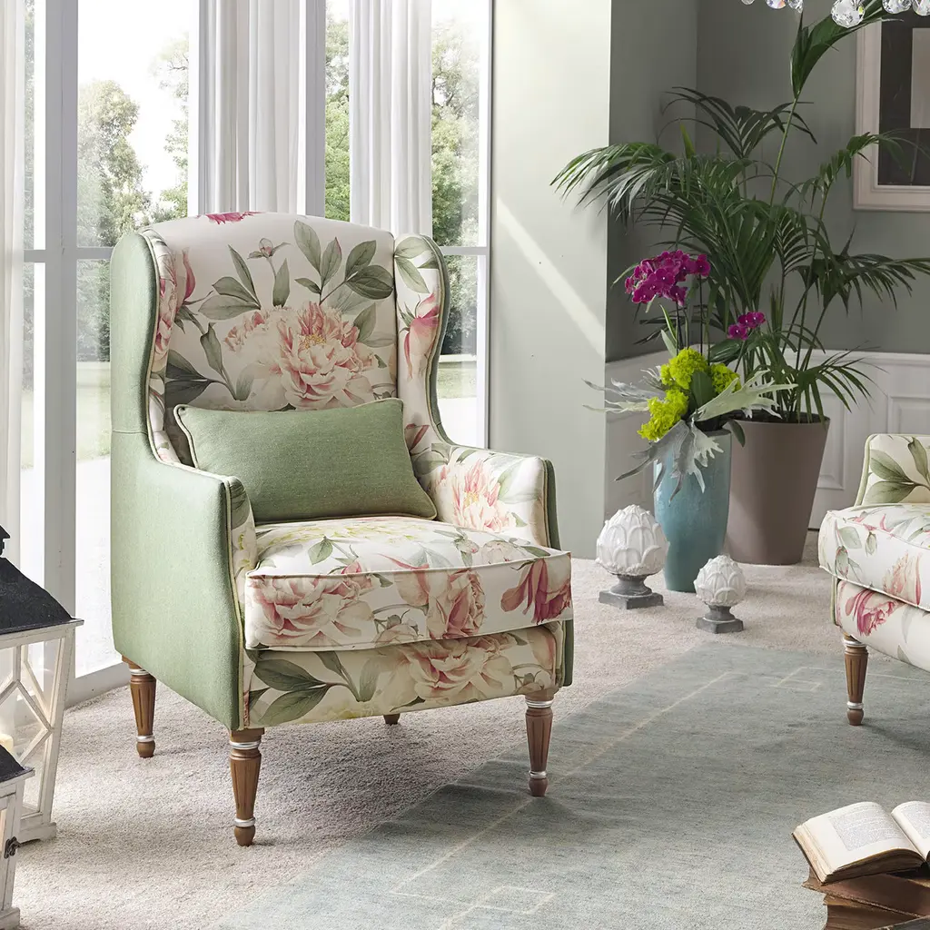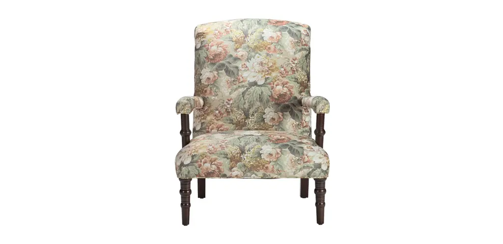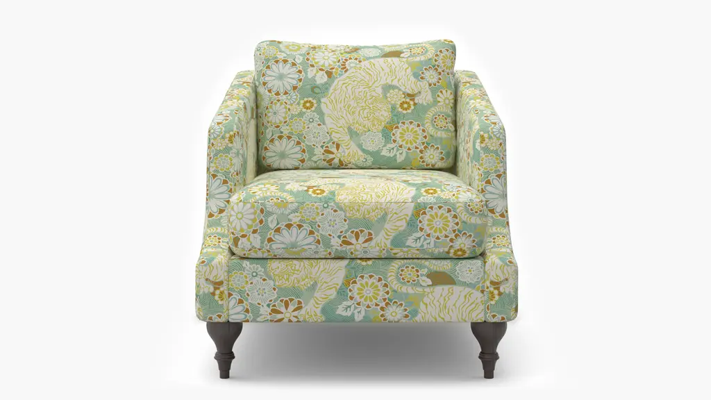 This granny-style armchair brings a normcore edge to any environment. Its seat is covered in a patterned fabric featuring oversized, coral-colored flowers, creating a harmonious chromatic contrast to its solid-colored pistachio green sides and throw pillow. Its amber-finished legs are decorated with silver leaf details. Handmade in Italy's Veneto region.
