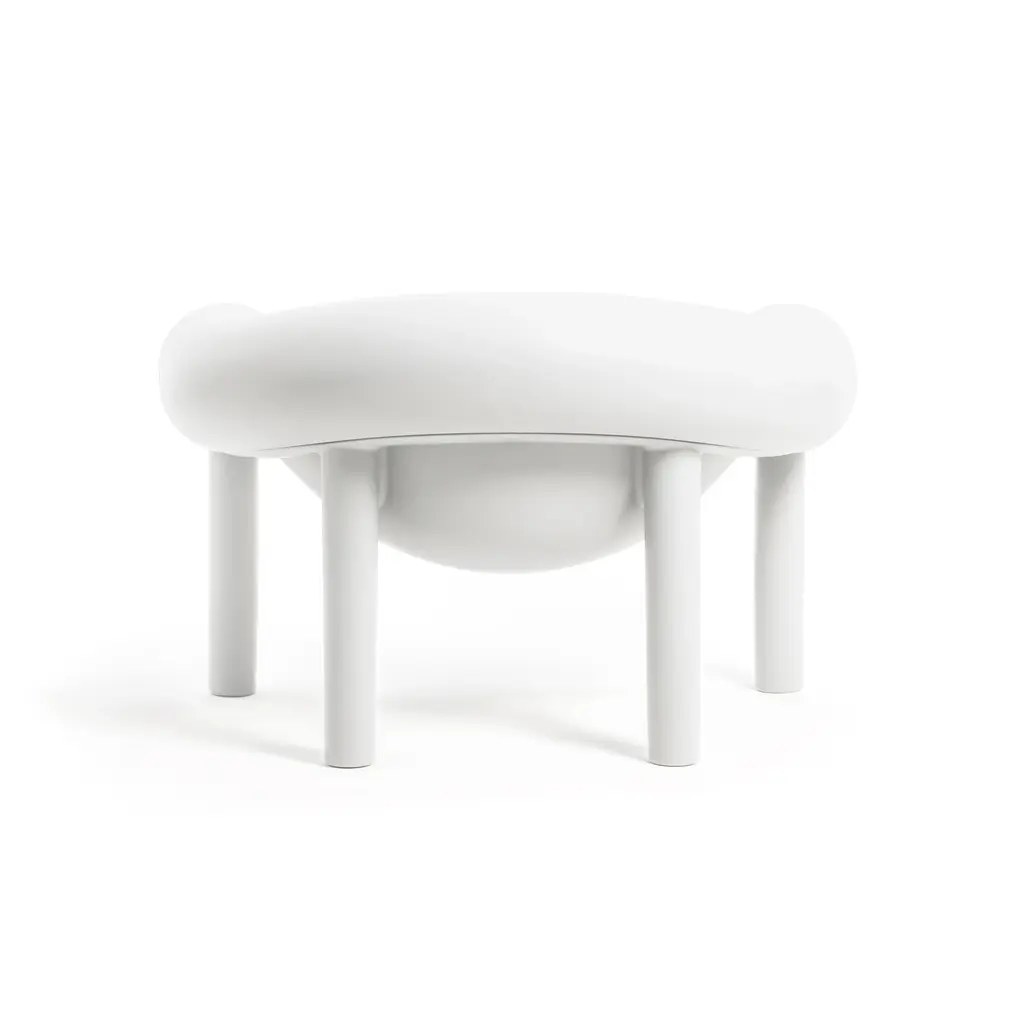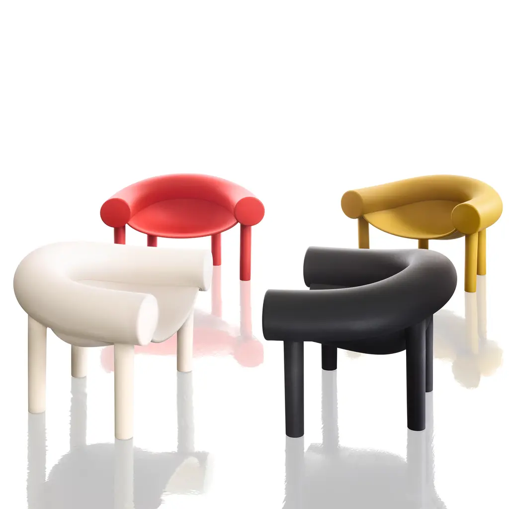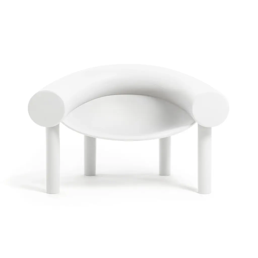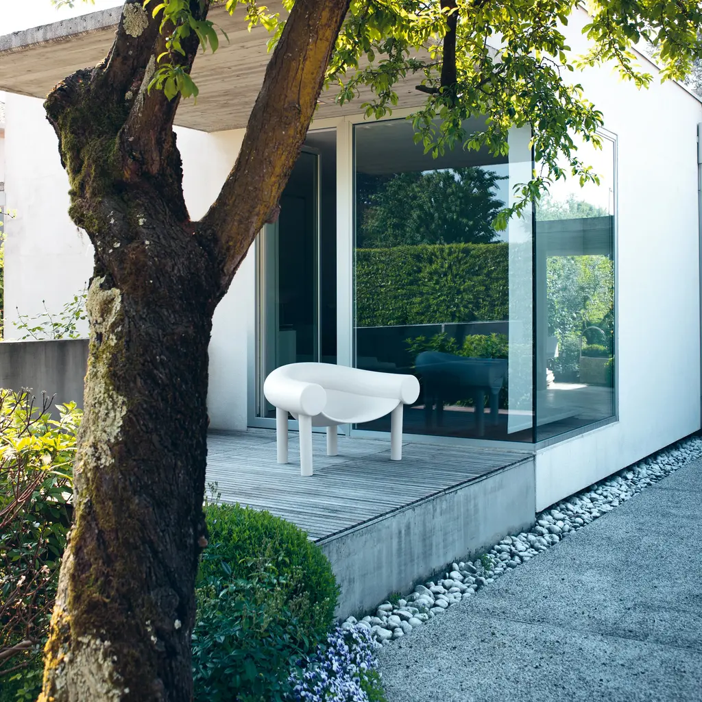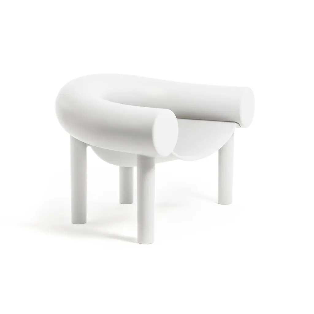 Bring playful sophistication to your home with the Sam Son Outdoor Low Armchair from Magis. Supported by tubular stilt legs, its softly suspended seat rests between a giant horseshoe-shaped element, providing both comfort and a protective seating space. Crafted from two rotational moldings, the chair boasts a rigid base and more elastic upper, for a uniquely luxurious seating experience. Highlights