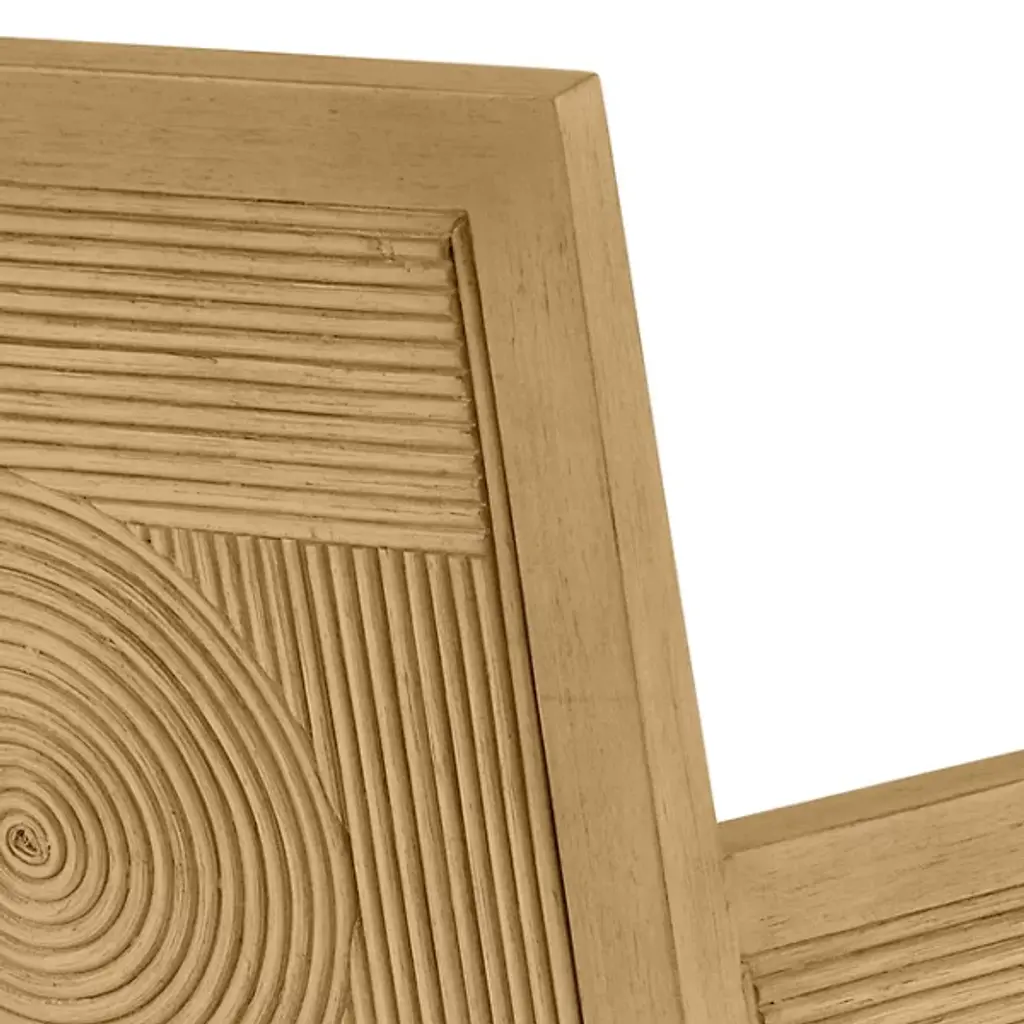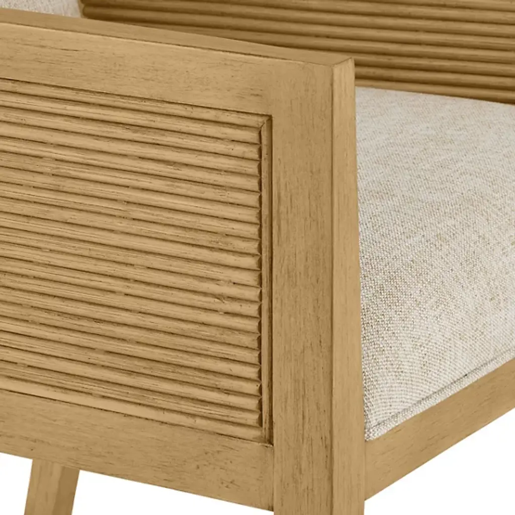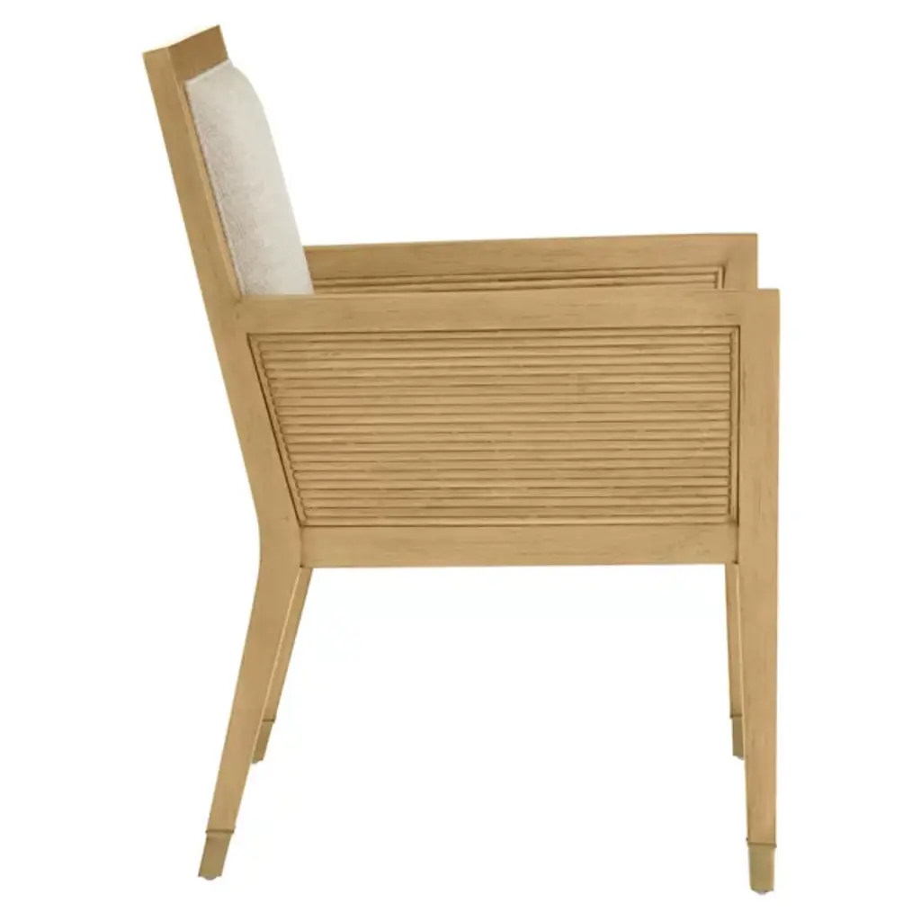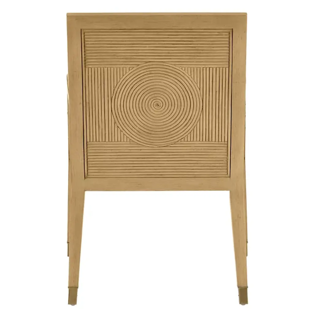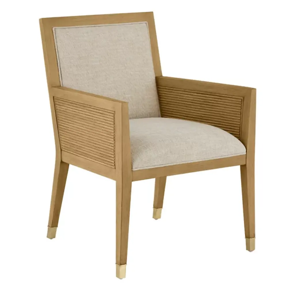 The Santos Armchair from Currey & Company brings a hint of tropical sophistication to any room, from a cozy reading nook to a stylish living area. Its solid mahogany frame provides a sturdy foundation, while hand-applied split rattan panels on the back and arms add texture and visual interest. Upholstered in a performance fabric, the chair balances comfort with durability. The seat and inside back feature tight upholstery over no-sag webbing, ensuring long-lasting support. Brass ferrules on the legs add elegance, elevating the overall design.