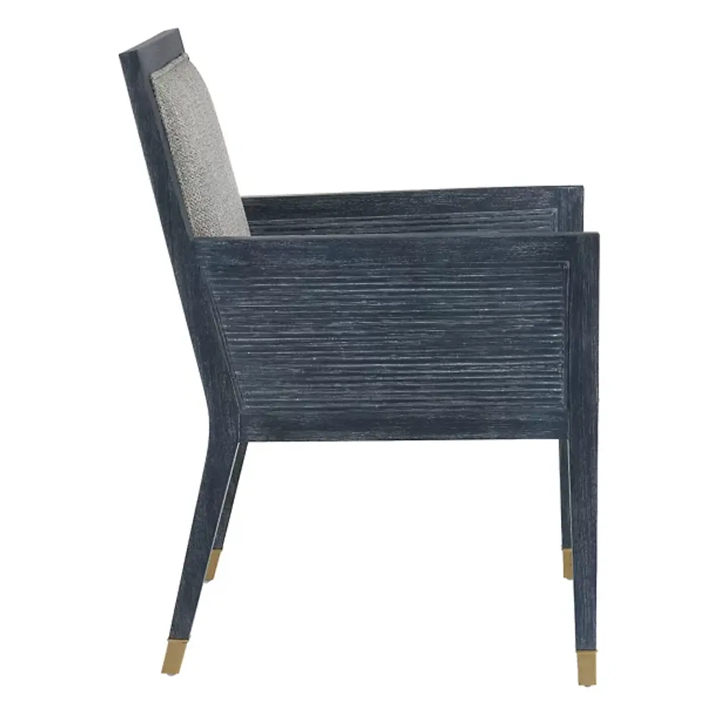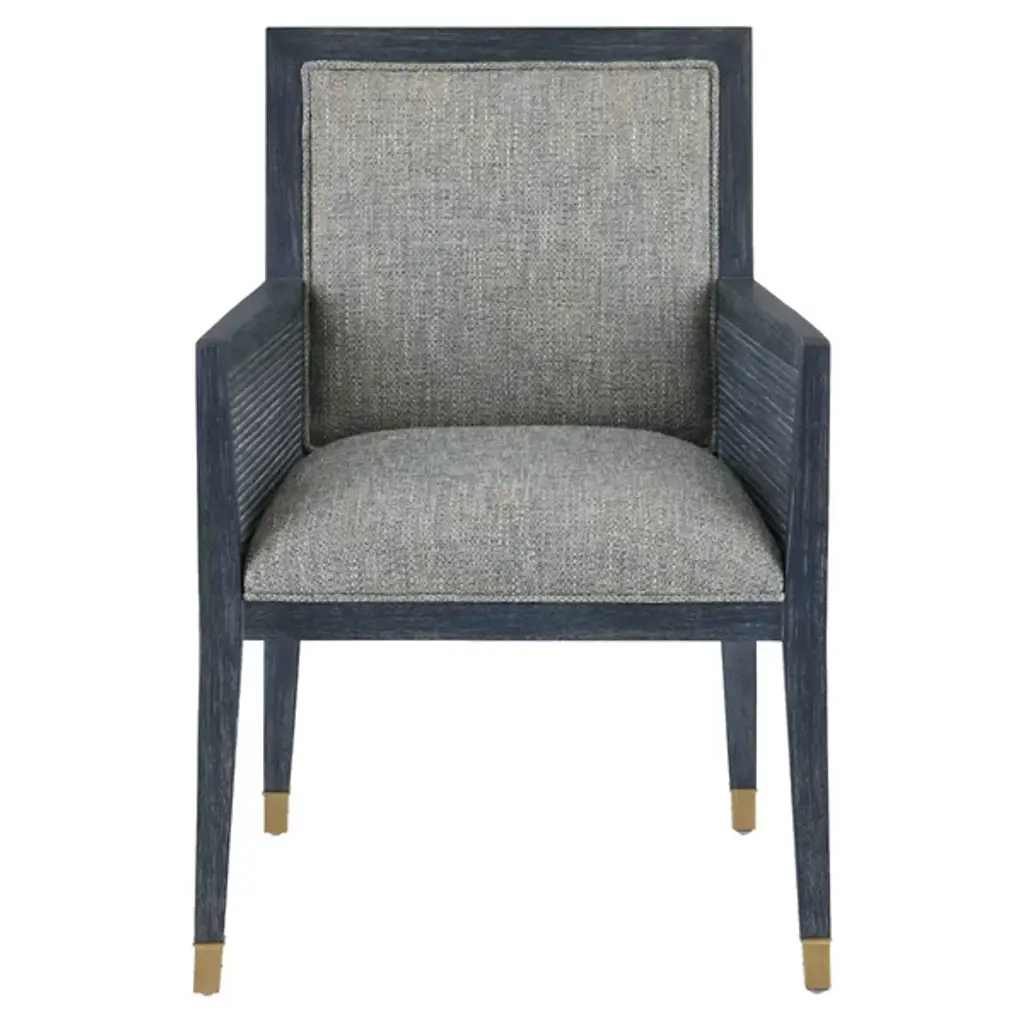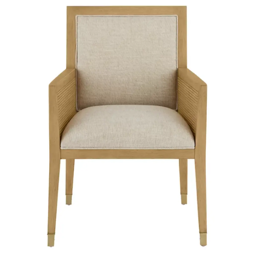 The Santos Armchair from Currey & Company brings a hint of tropical sophistication to any room, from a cozy reading nook to a stylish living area. Its solid mahogany frame provides a sturdy foundation, while hand-applied split rattan panels on the back and arms add texture and visual interest. Upholstered in a performance fabric, the chair balances comfort with durability. The seat and inside back feature tight upholstery over no-sag webbing, ensuring long-lasting support. Brass ferrules on the legs add elegance, elevating the overall design.