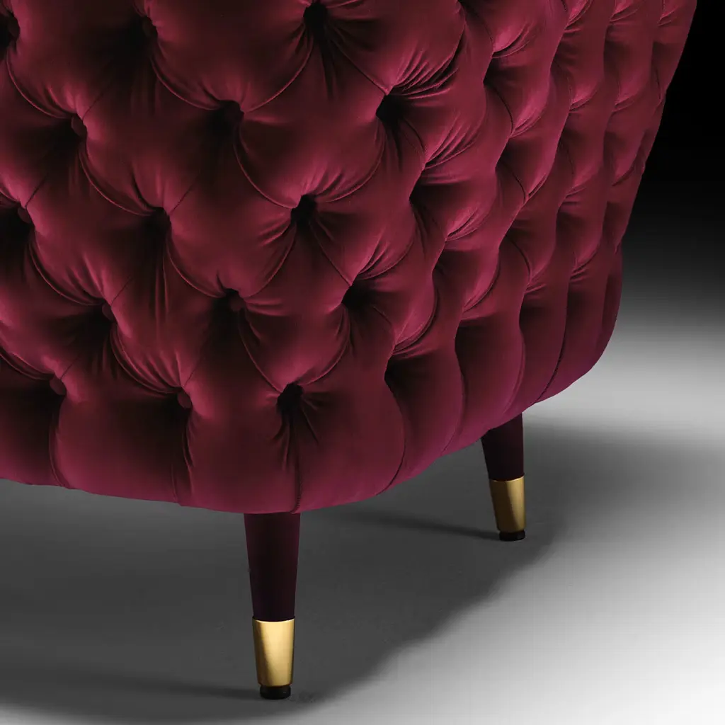 This exquisite armchair in solid wood has padding in polyurethane foam with an elastic belt spring system in the seat. The elegant burgundy cover is not removable and it features a button-padded exterior rear and sides. The feet are covered in polished brass. Contract and commercial certifications available upon request.