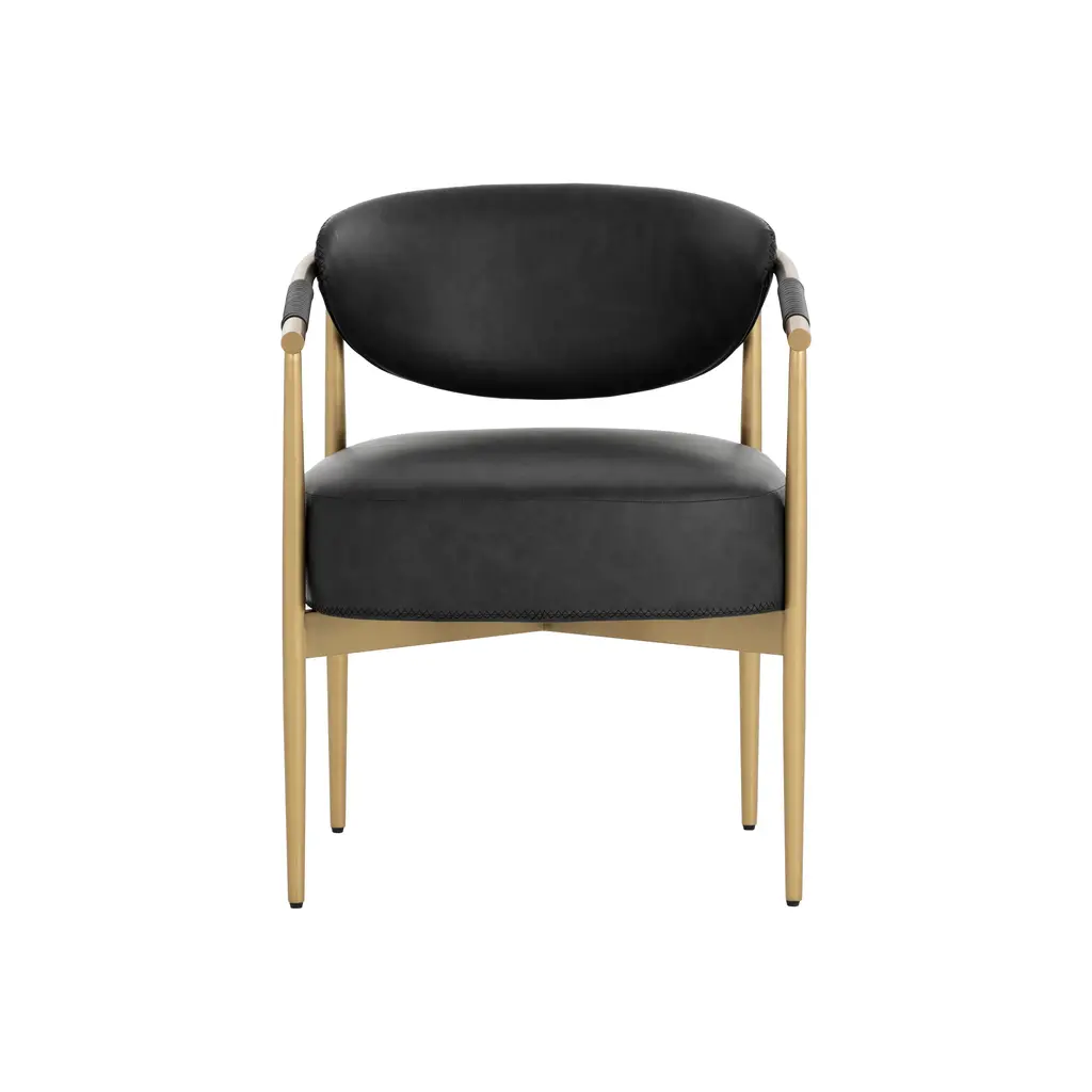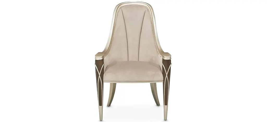 Savona armchair shown in V228S Sorano Brown (with Silver) finish and Anthem Casablanca Pewter leather. This armchair has a solid wood frame in sorano brown with carved decoration on the legs in silver leaf. The upholstered seat and back are in a soft-hand, metallic pewter leather, with a decorative polished nickel band to the rear finished with a white crystal geode