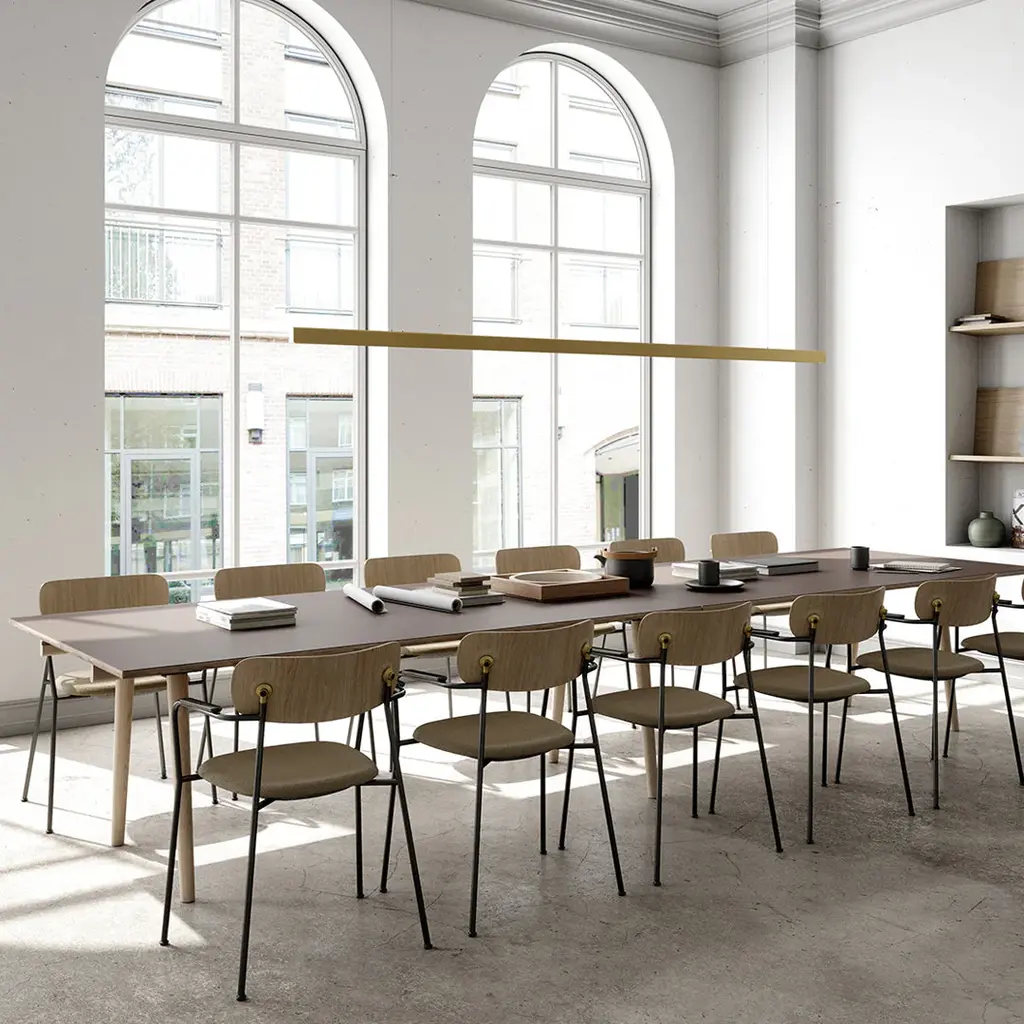 Scope is created with environmental considerations and designed by Hans Thyge & Co. Its wooden finishes, let you enjoy nature indoors and bring a warm and cozy feeling into your interior design. The name Scope refers to the elegant detail on the backrest, reminiscent of a doctor's stethoscope. With the stethoscope, you can change the expression of the chair and create your own unique design. This fun and interesting detail doesn't only have a decorative purpose, it also connects the frame and the backrest and holds them in place. Scope seems very simple with its clear lines, but taking a closer look, you discover harmonious proportions, a beautifully curved detail on the edge of the seat and a replaceable stethoscope supporting the sleek and elegant backrest. The integrated felt pads underneath the seat improve the acoustics and create a more pleasant environment. The felt pads also shield and protect the upholstered seat when the chair is stacked.