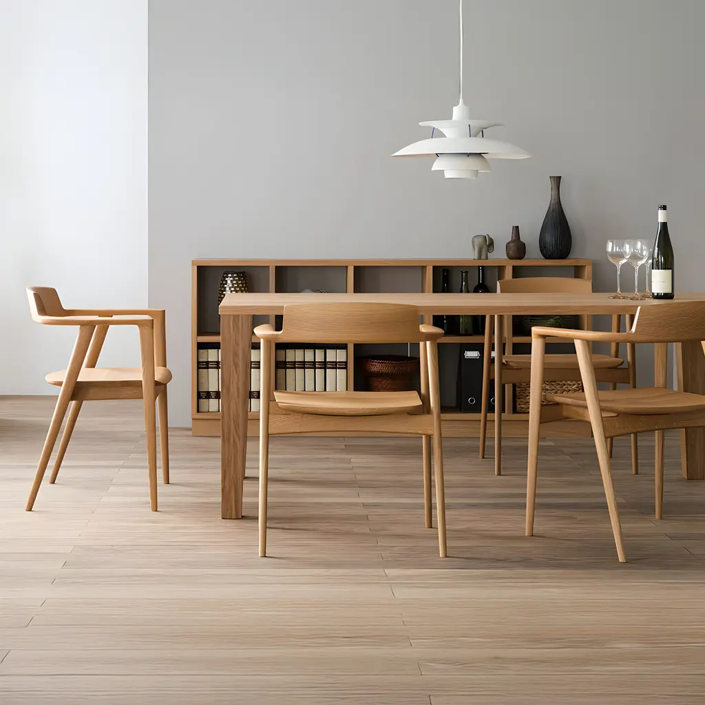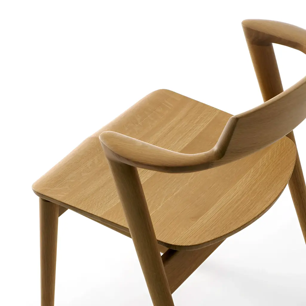 The Seoto Armchair Sangyo is crafted from solid wood, its backrest flows into the armrests and rear legs, showcasing HIDA's traditional Japanese craftsmanship and expertise in wood bending techniques. Designed for comfort, the chair supports a natural posture. Available in oak or walnut.
