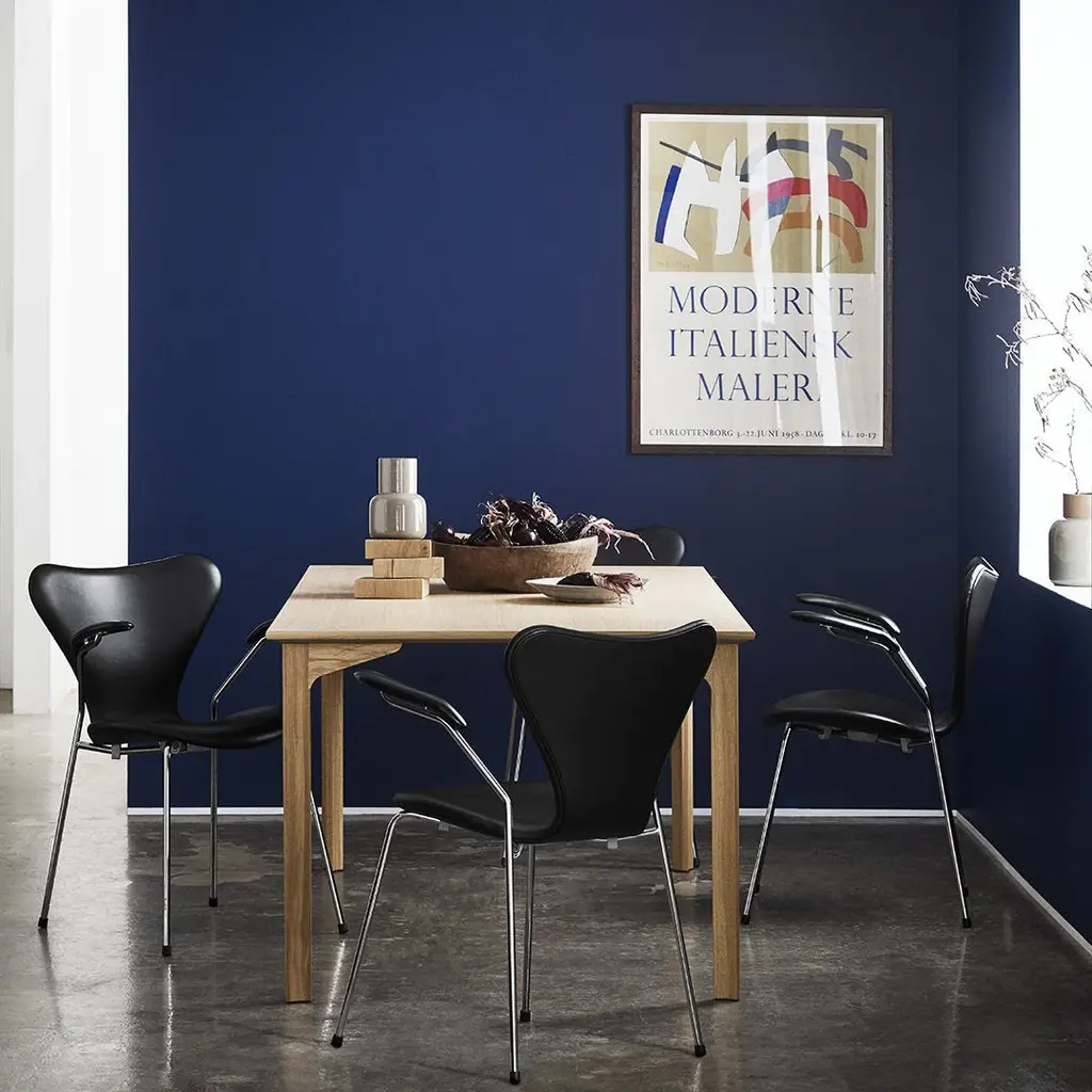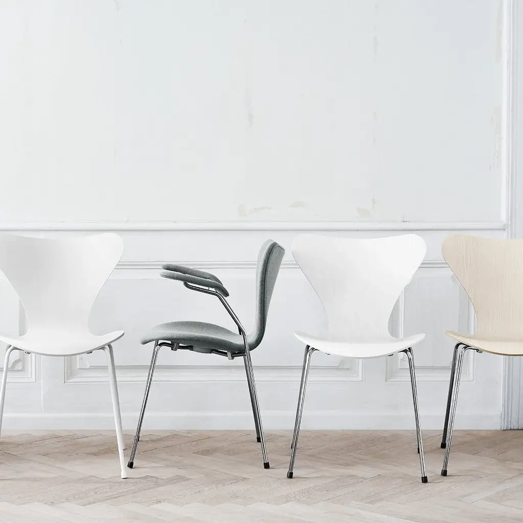 The Series 7 designed by Arne Jacobsen is by far the most sold chair in the history of Fritz Hansen and perhaps also in furniture history. The pressure moulded veneer chair is a further development of the classic Ant chair. The four-legged stackable chair represents the culmination of the lamination technique. The visionary Arne Jacobsen exploited the possibilities of lamination to perfection resulting in the iconic shape of the chair. Series 7 represents the chair in the Fritz Hansen collection with the widest range of applications.