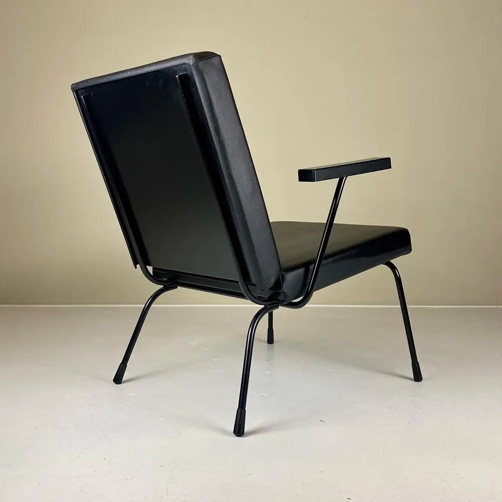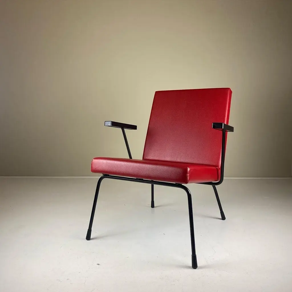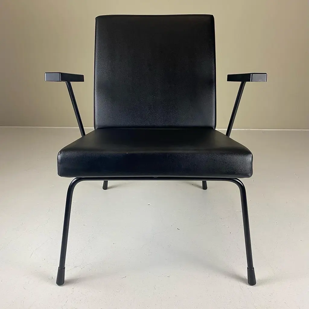 Launched in 1954 as an affordable armchair for Dutch homes and a design classic ever since, this 1407 armchair is designed by Wim Rietveld (son of Gerrit Rietveld) and Andre Cordemeyer for Dutch manufacturer Gispen. The chair was first shown at the 10th Milan Triennale (1954) and was awarded with a gold medal. The original design was named the 415 or 1401 Chair and was actually quite a bit smaller. It soon became a beautiful addition to the children’s room. This 1407 chair is definitely better proportioned and very suitable for the modern home.The listed set of 1407 chairs were produced in the 1990s — the latest version, with visible graphite black back — and is in a lovely pre-owned condition with only slight wear consisting with age and use. It features bakelite armrest and still has its, indestructible, original vinyl upholstery.Price is for the set of two, I have three sets available (one in red)General note: Shipping quotes as supplied by 1stdibs are only indicative. We will discuss and figure out the best possible shipment method (and rate) for every individual object.